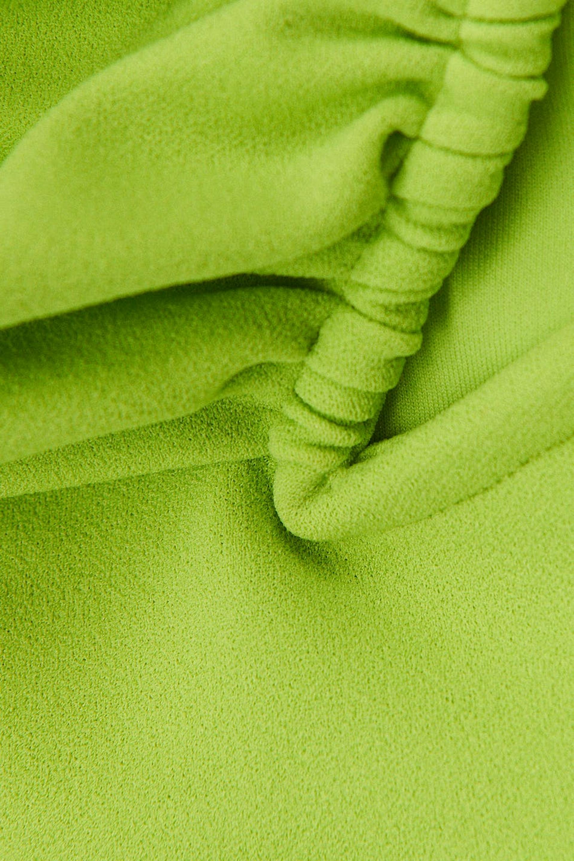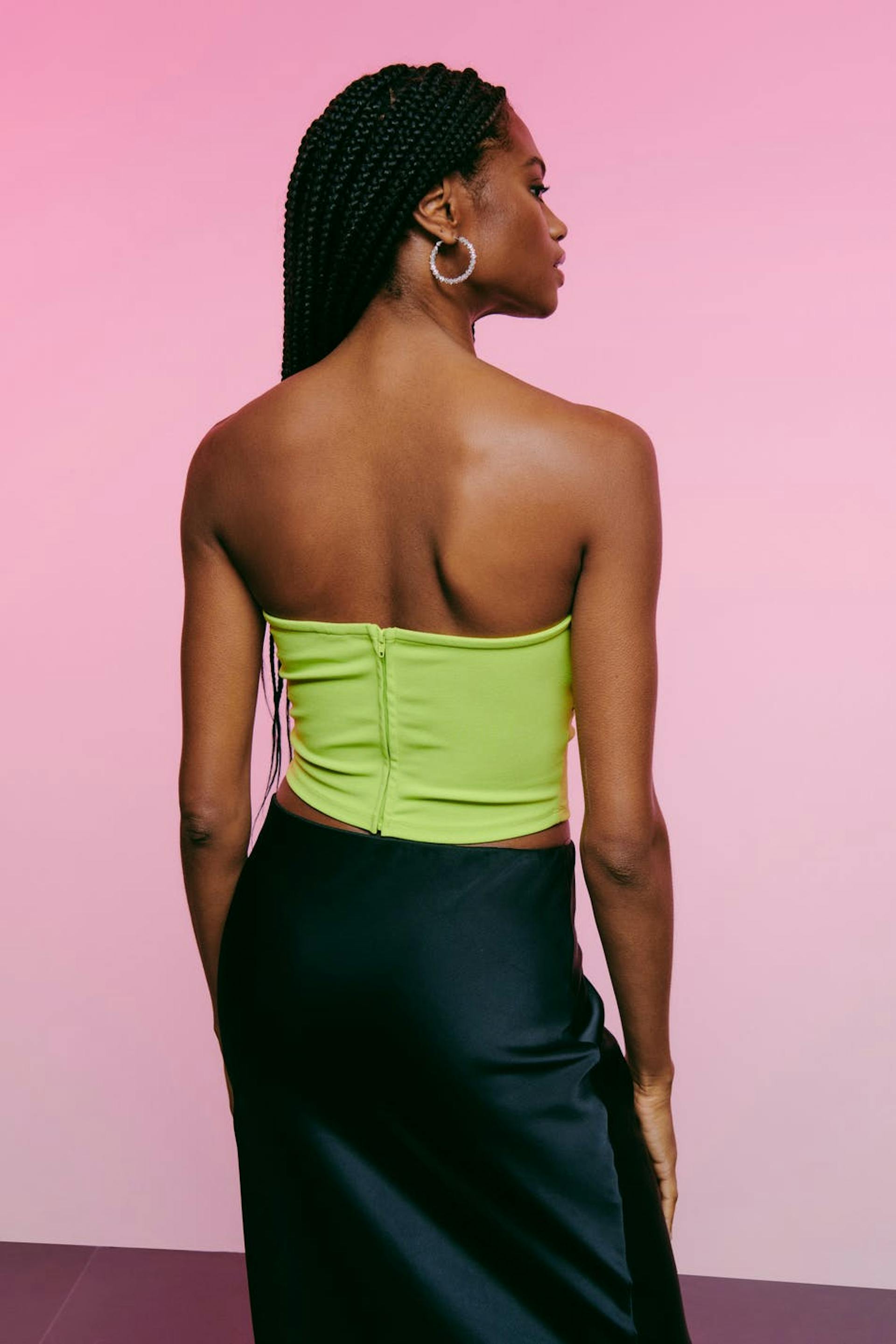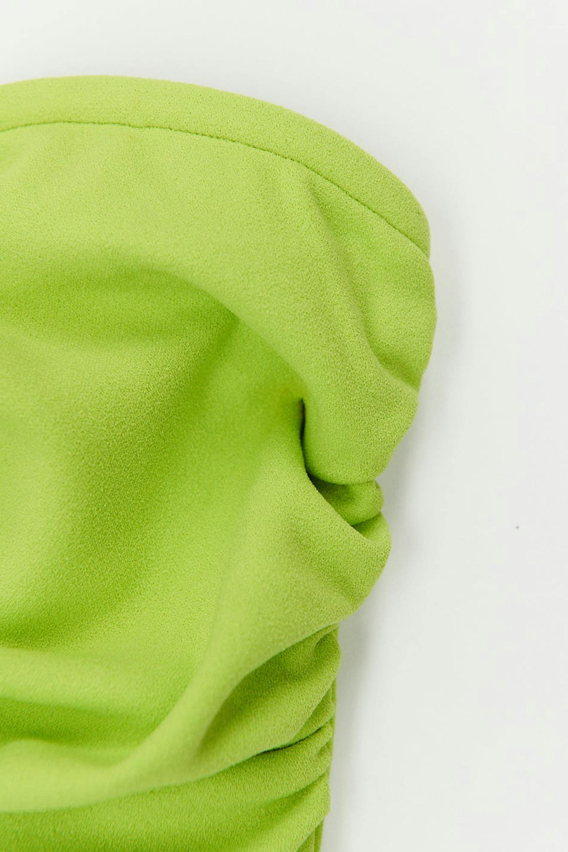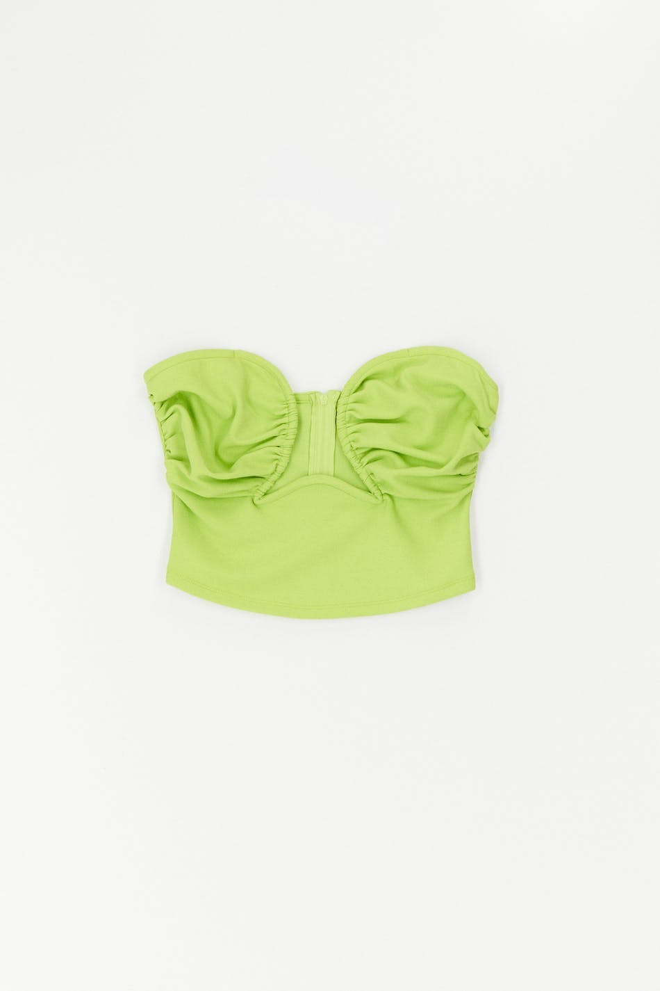 Tubtopp med djup urringning. Toppen är grön och har bygel för extra stöd. Den har dragkedja bak och croppad längd.