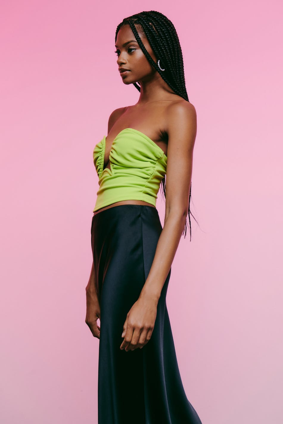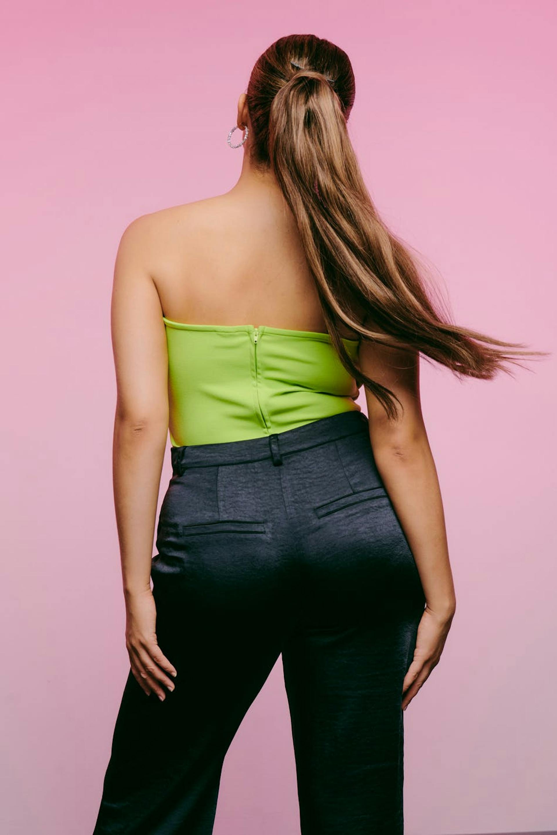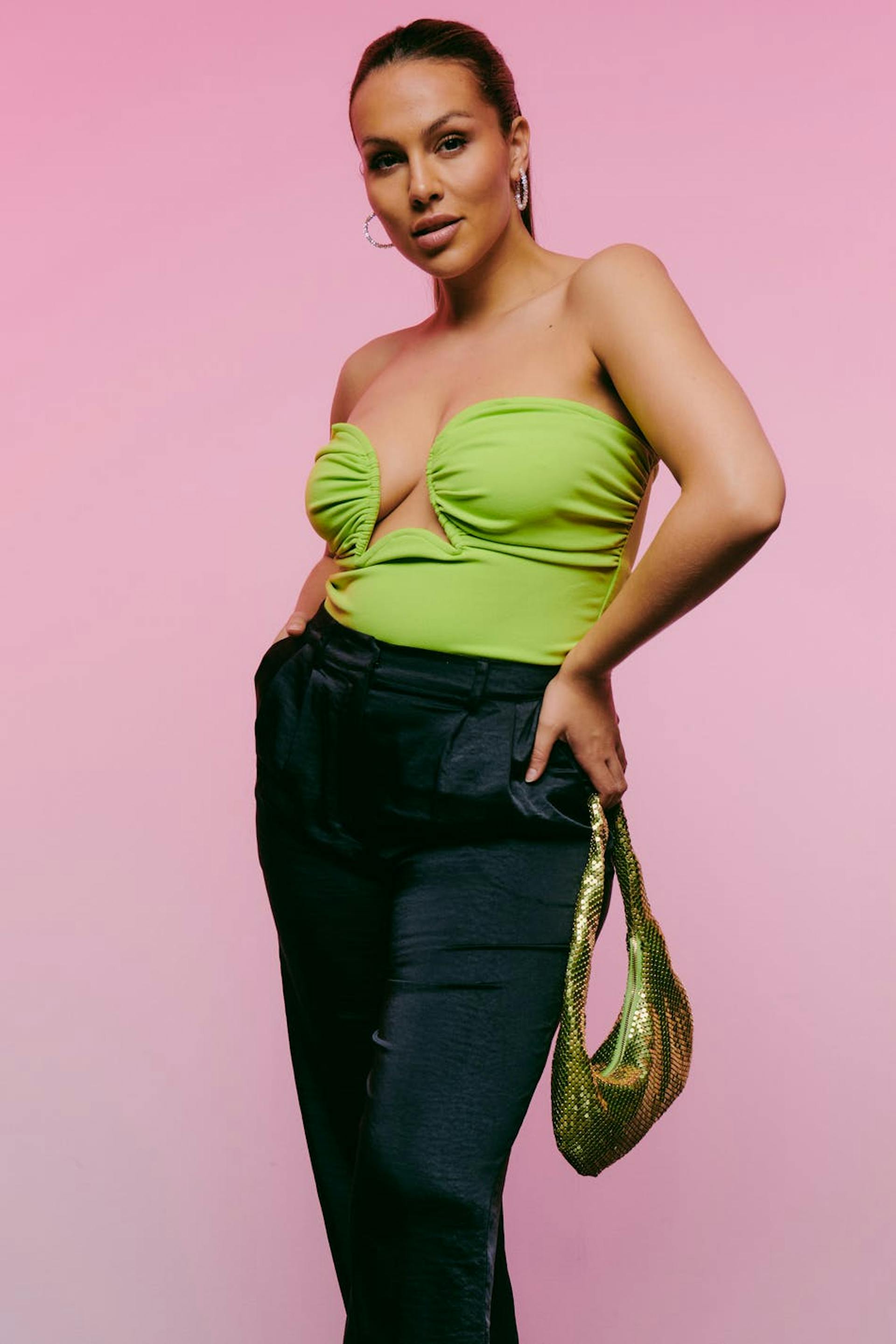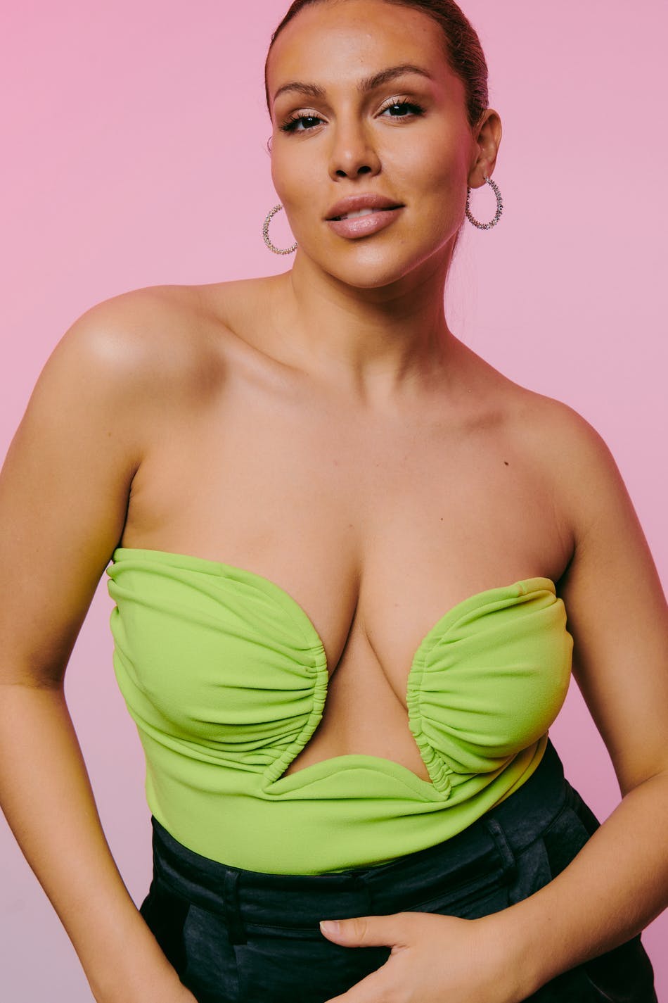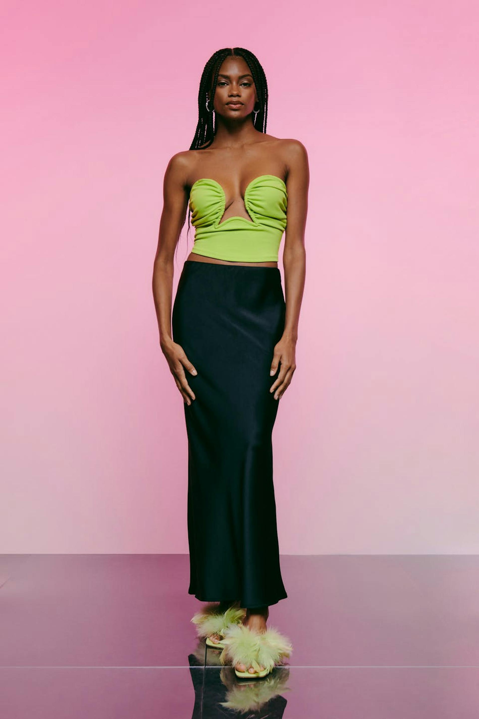 Tubtopp med djup urringning. Toppen är grön och har bygel för extra stöd. Den har dragkedja bak och croppad längd.