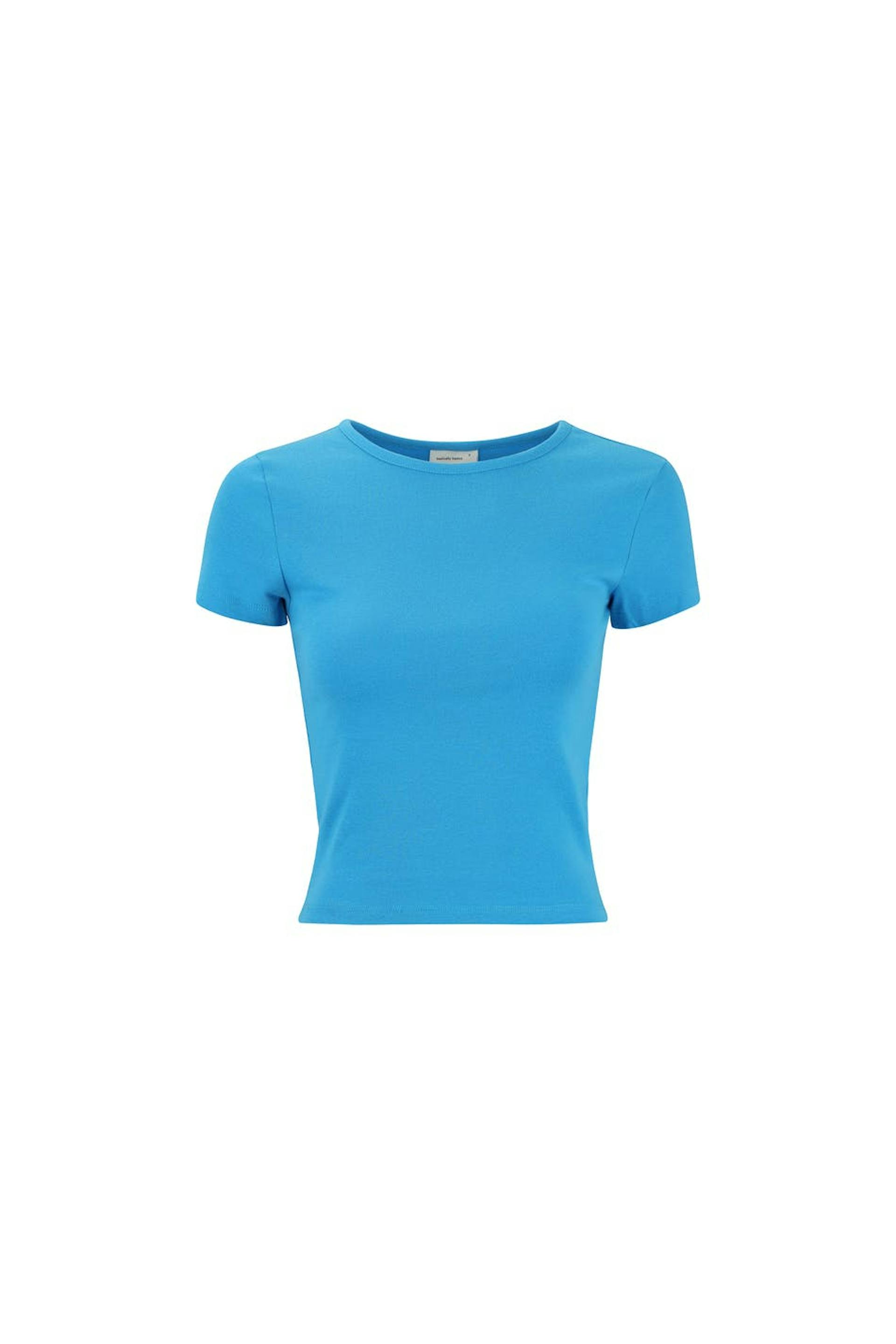 Kortärmad topp med figurnära passform. Toppen är blå och har en croppad längd.