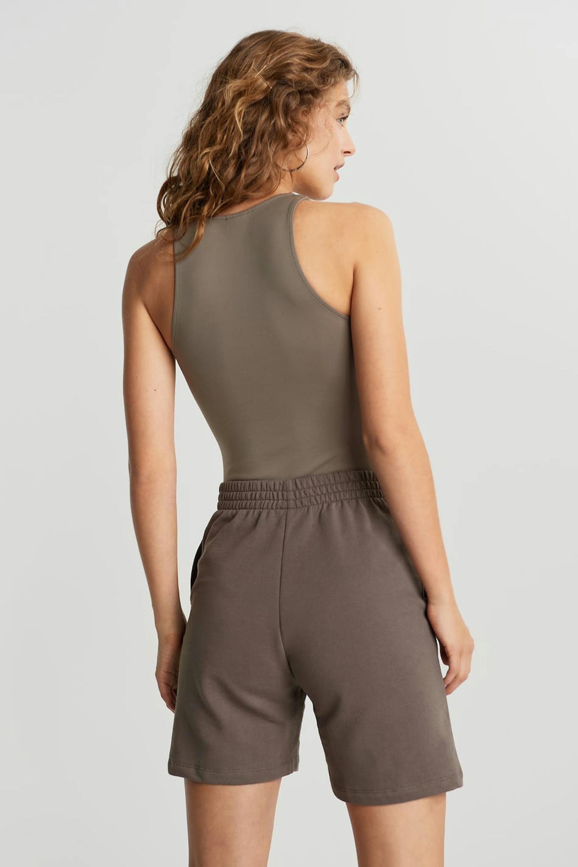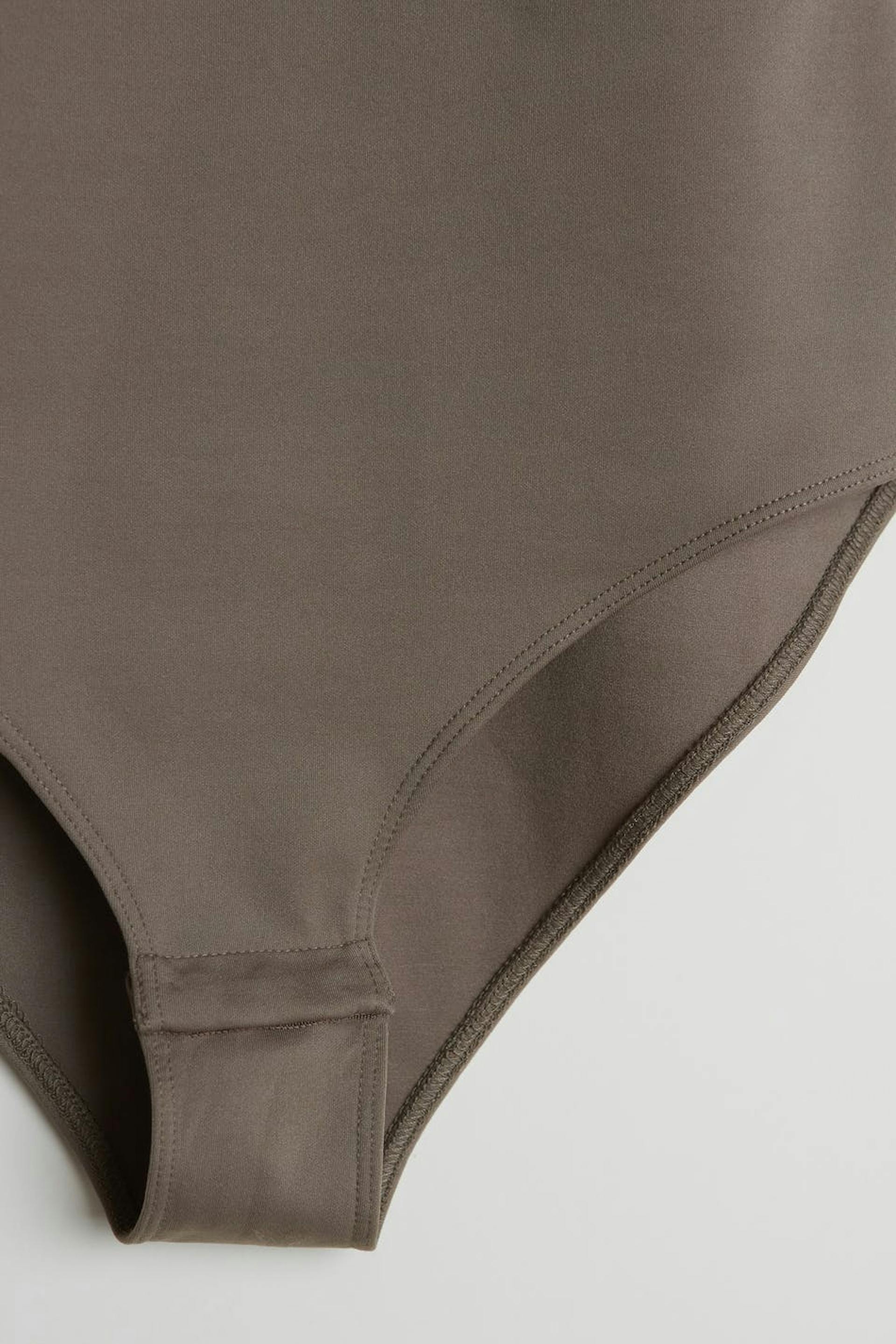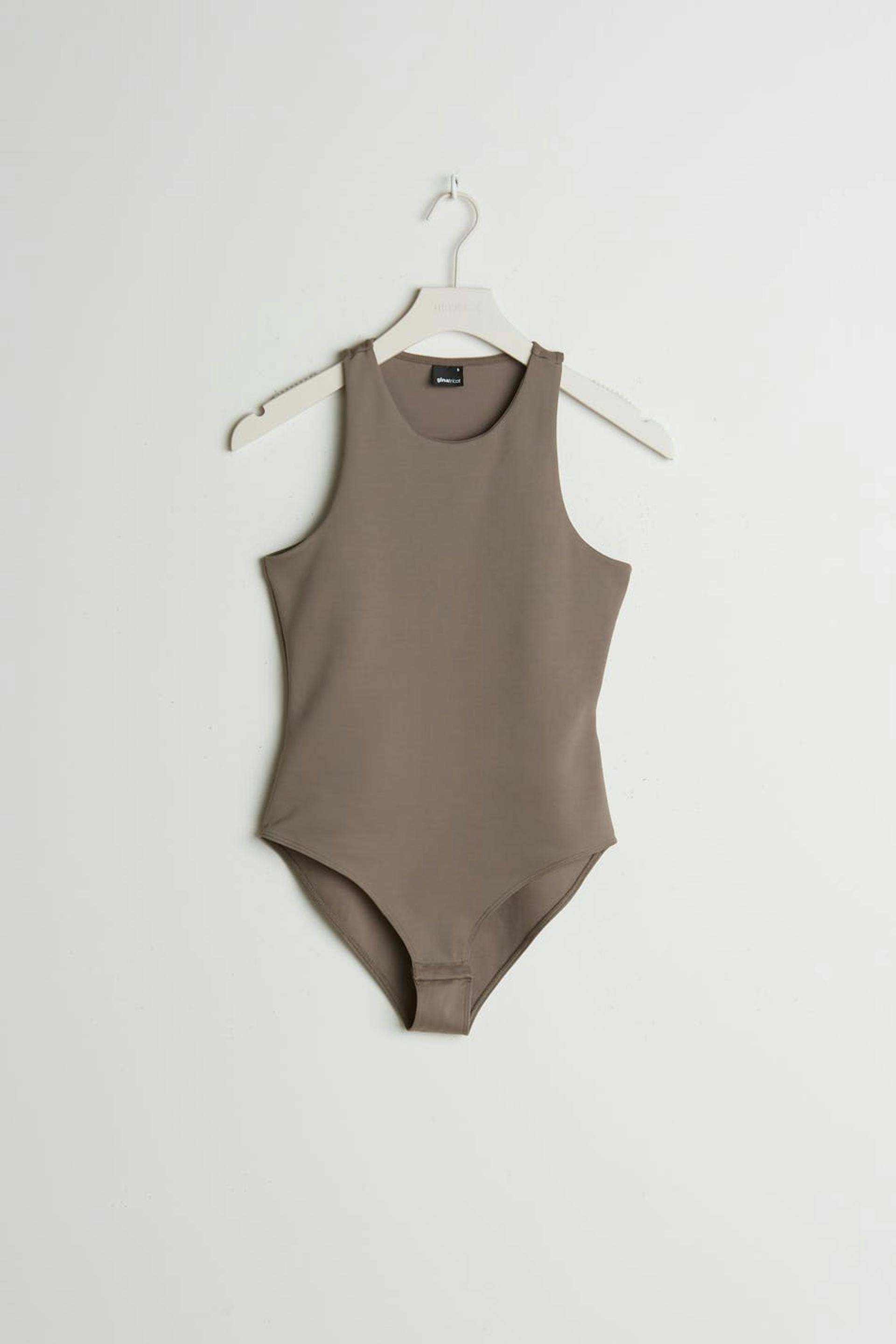 Ärmlös body med en figurnära passform. Bodyn är brun och har en knappstängning i grenen.