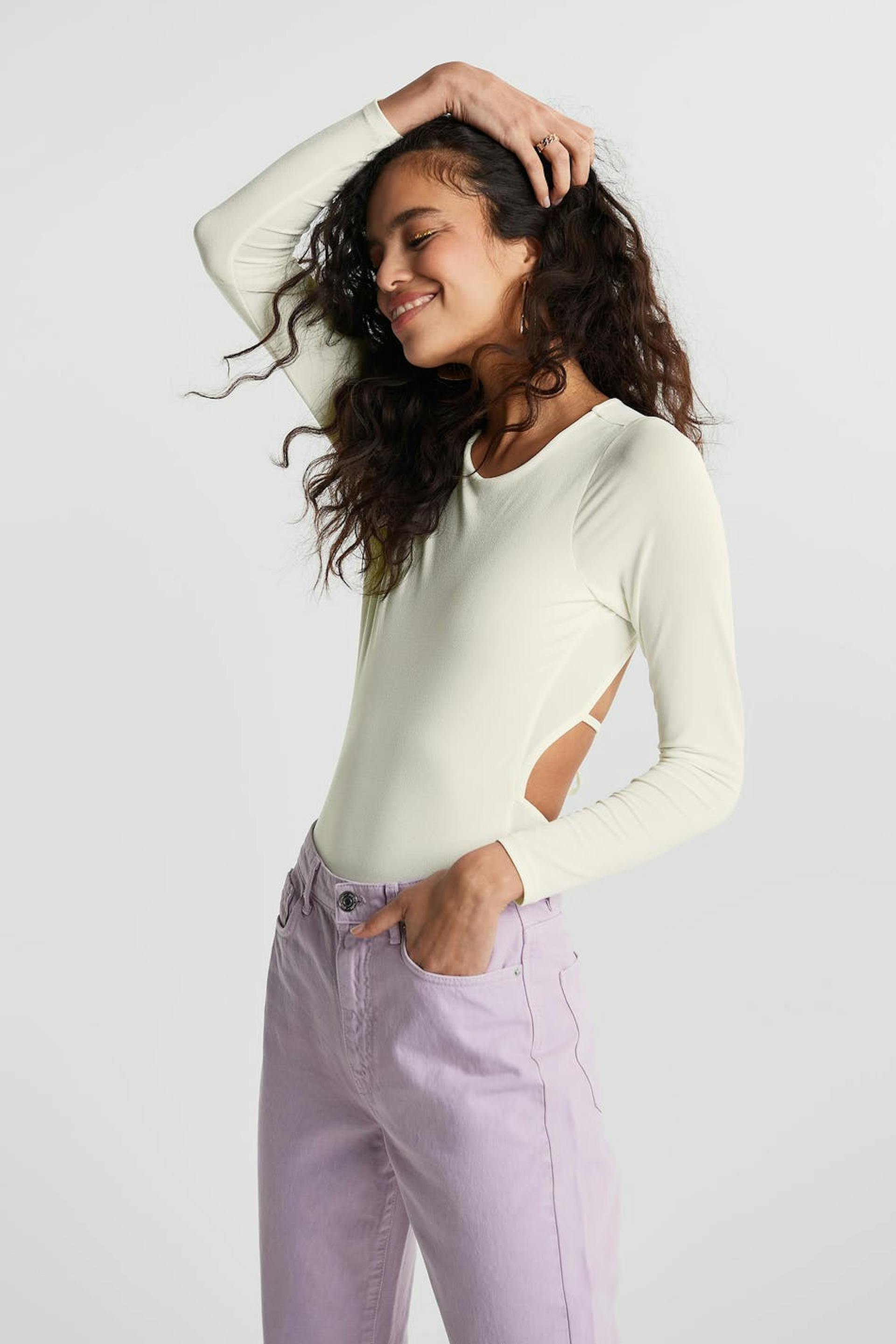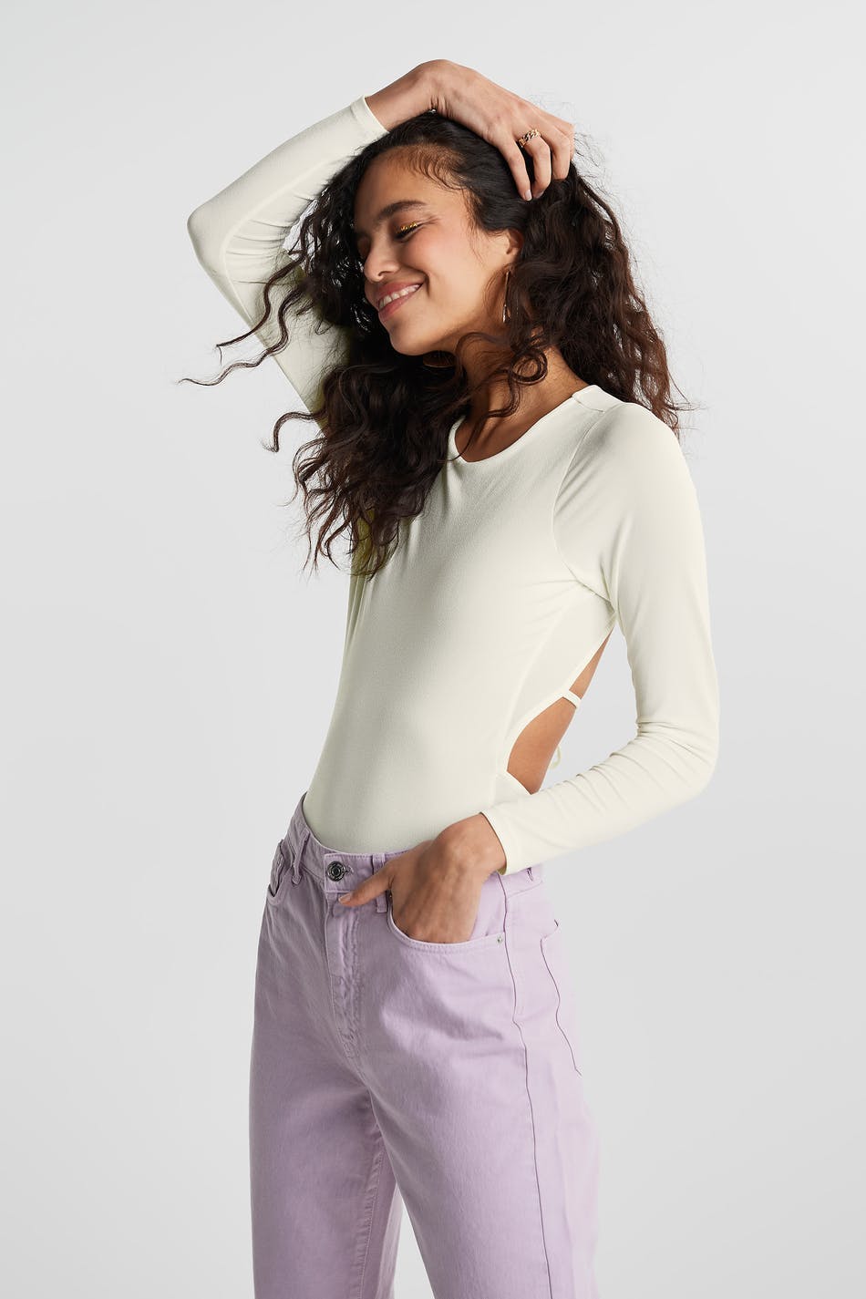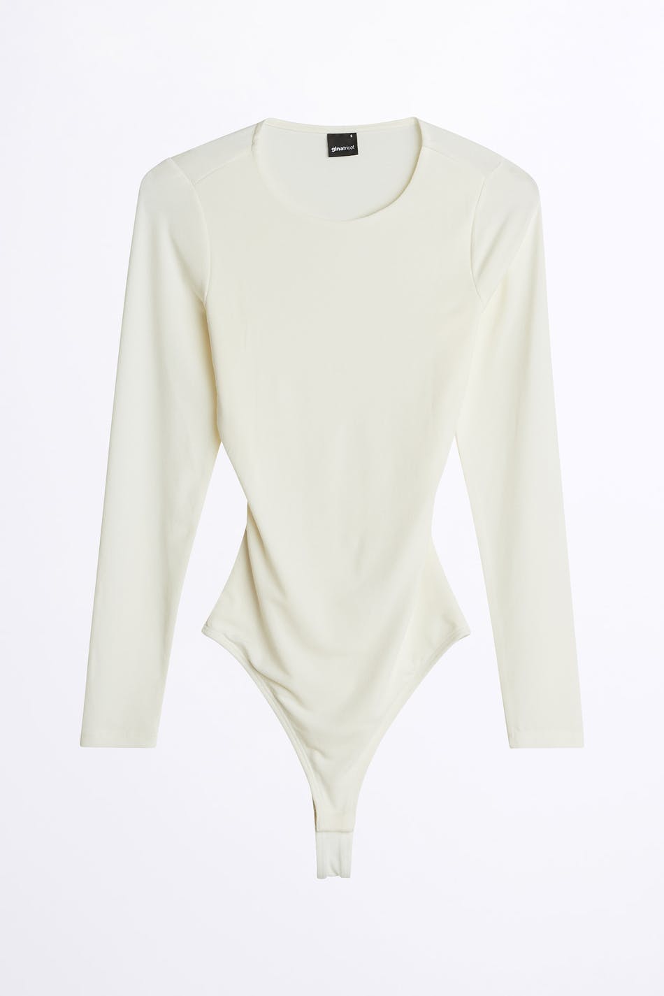 Långärmad body med en figurnära passform. Bodyn är perfekt för festen och vit och har en öppen rygg med ett knytband i ryggen.