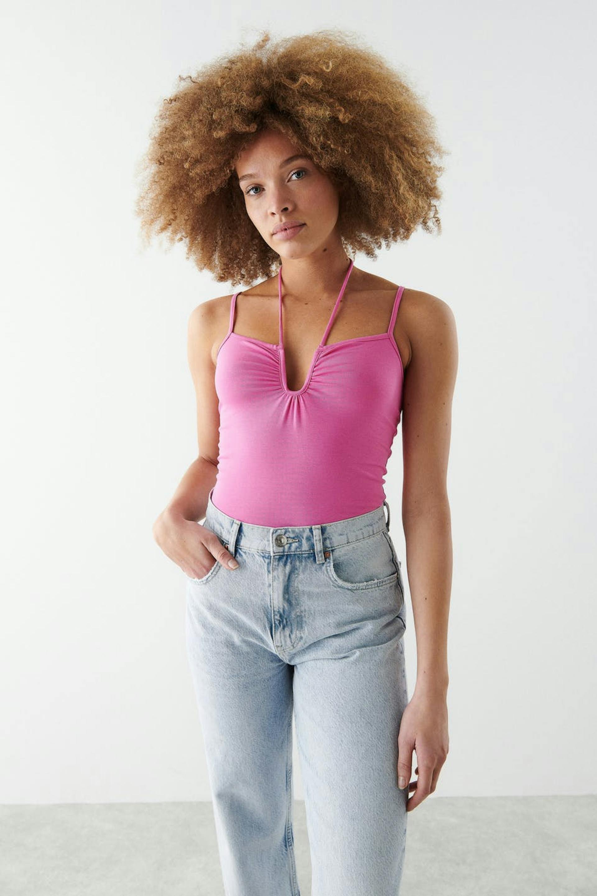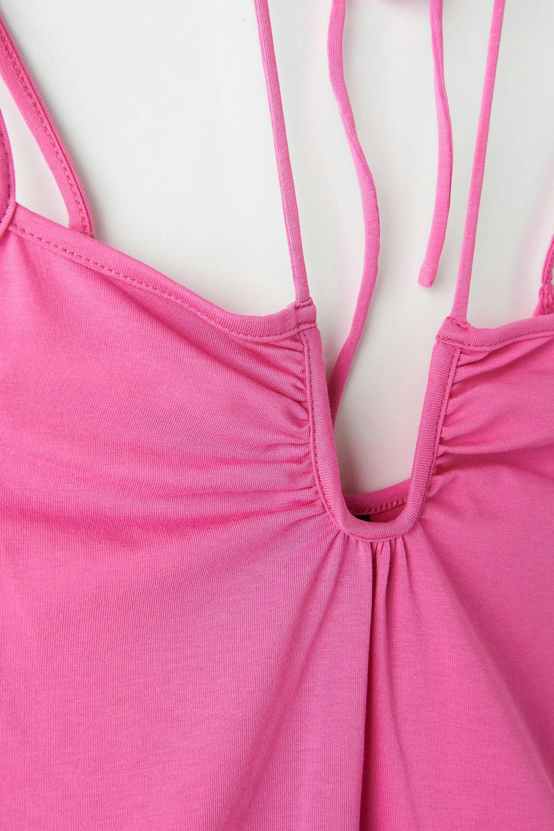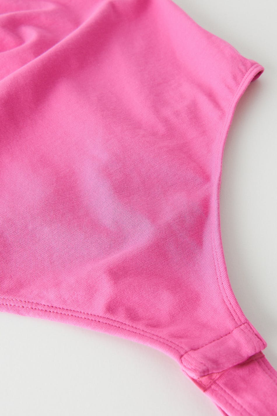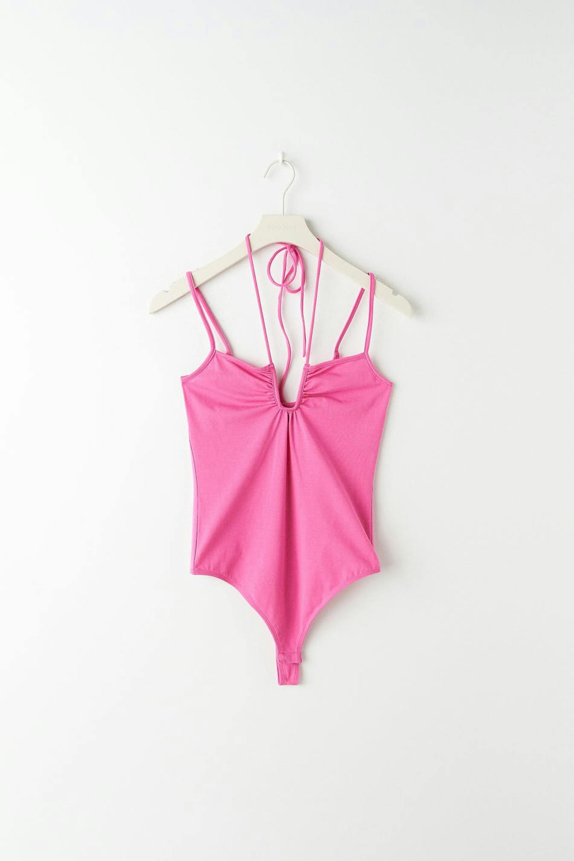 Body med en figurnära passform. Bodyn är rosa och har tunna axelband. Den har ett tunt knytband vid halsen och knäppning i grenen.