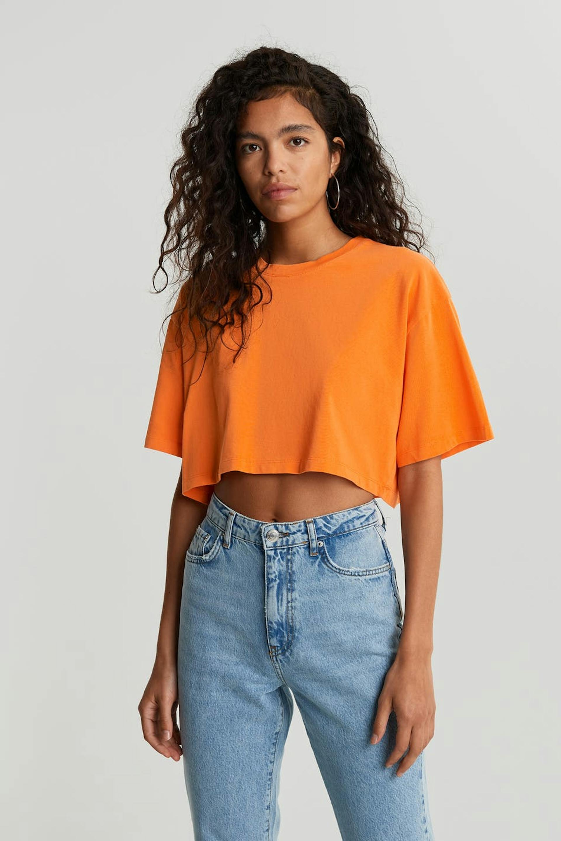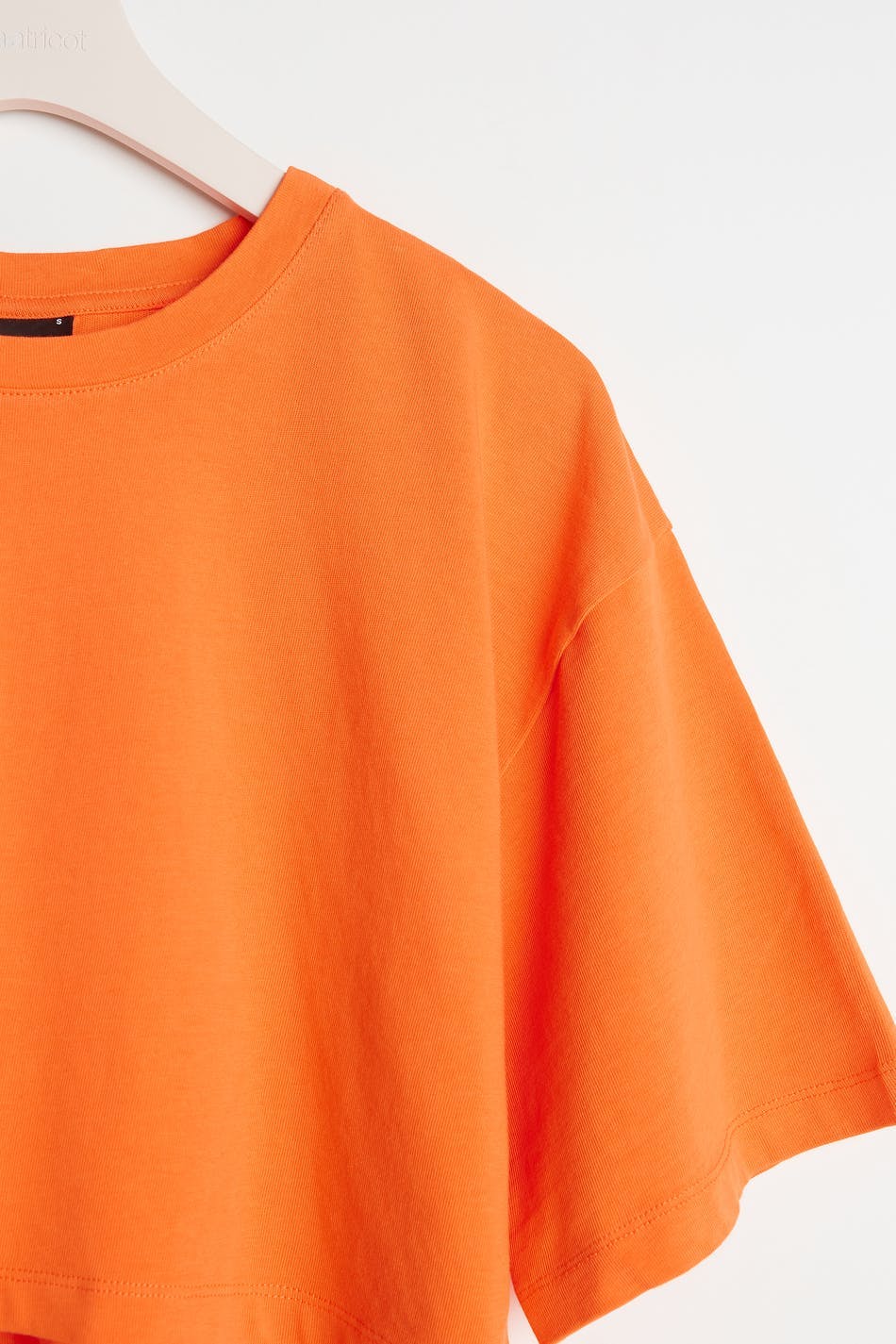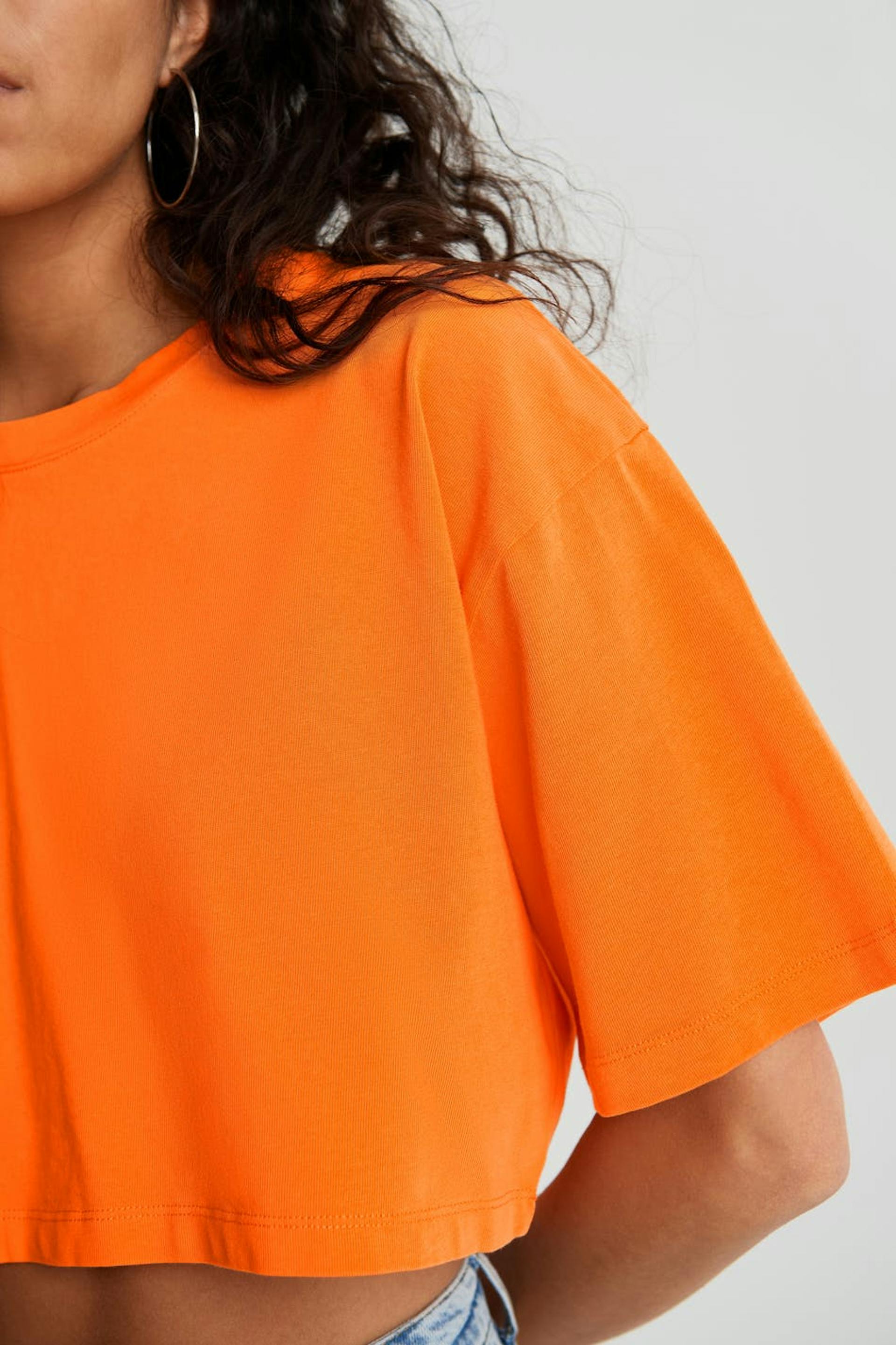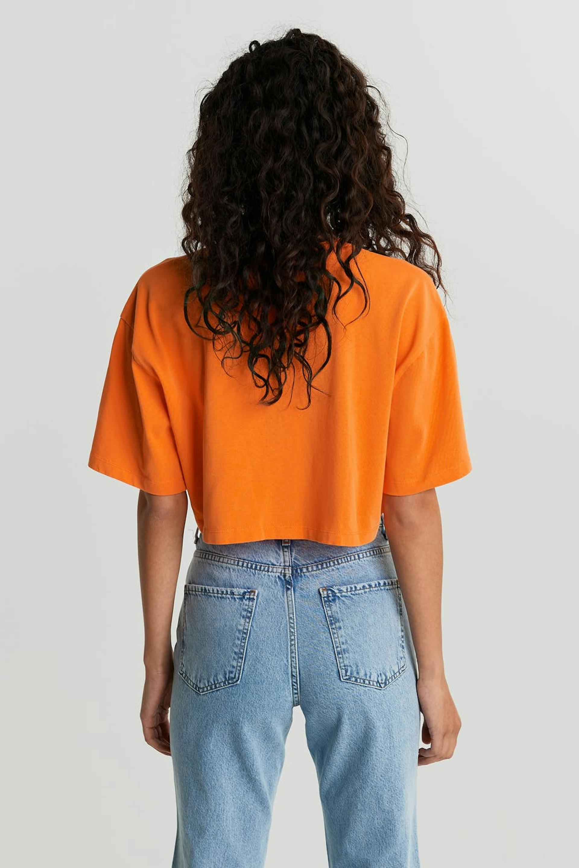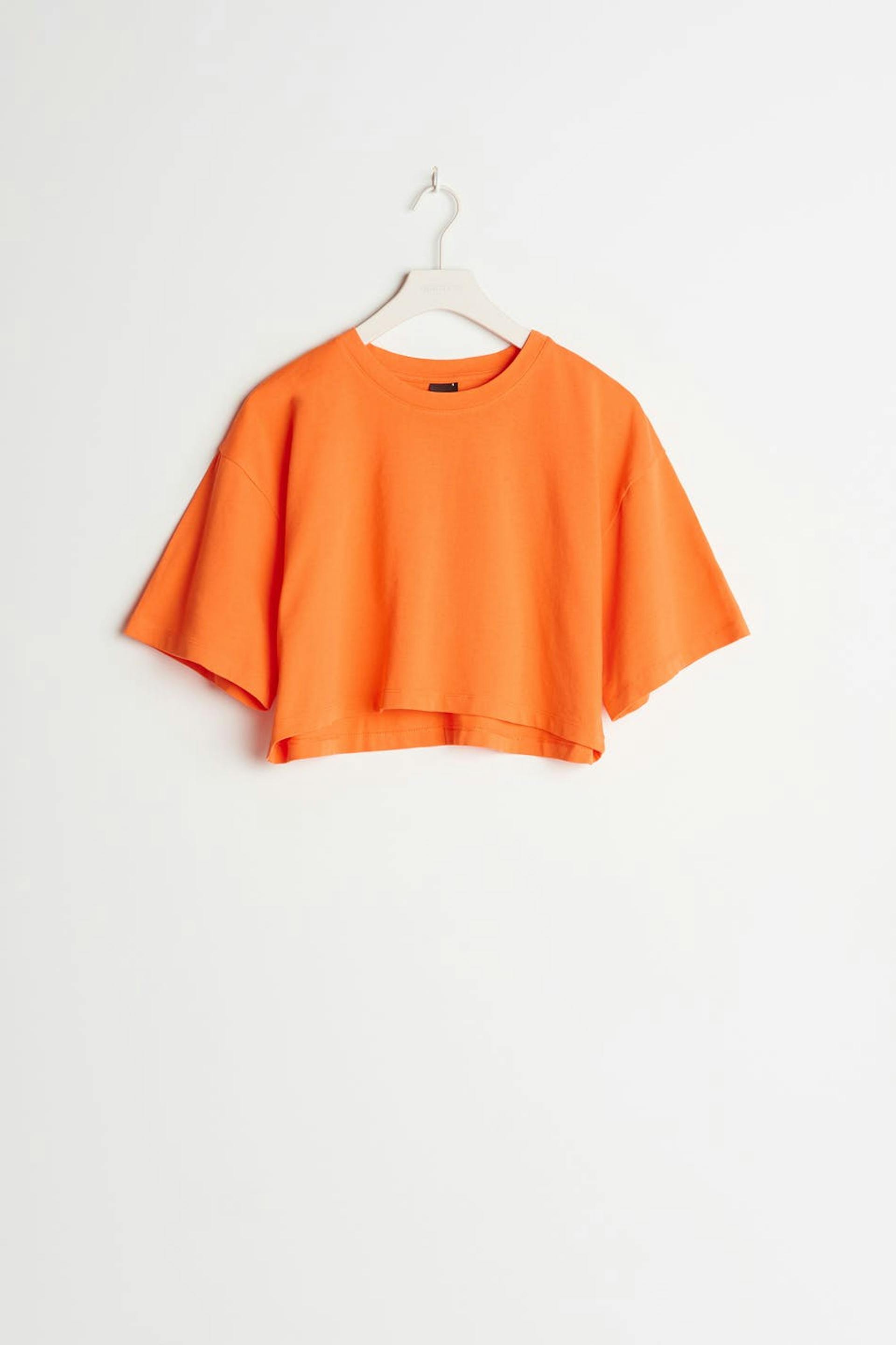 Kortärmad topp med oversize fit. Toppen är orange, croppad och mjuk.