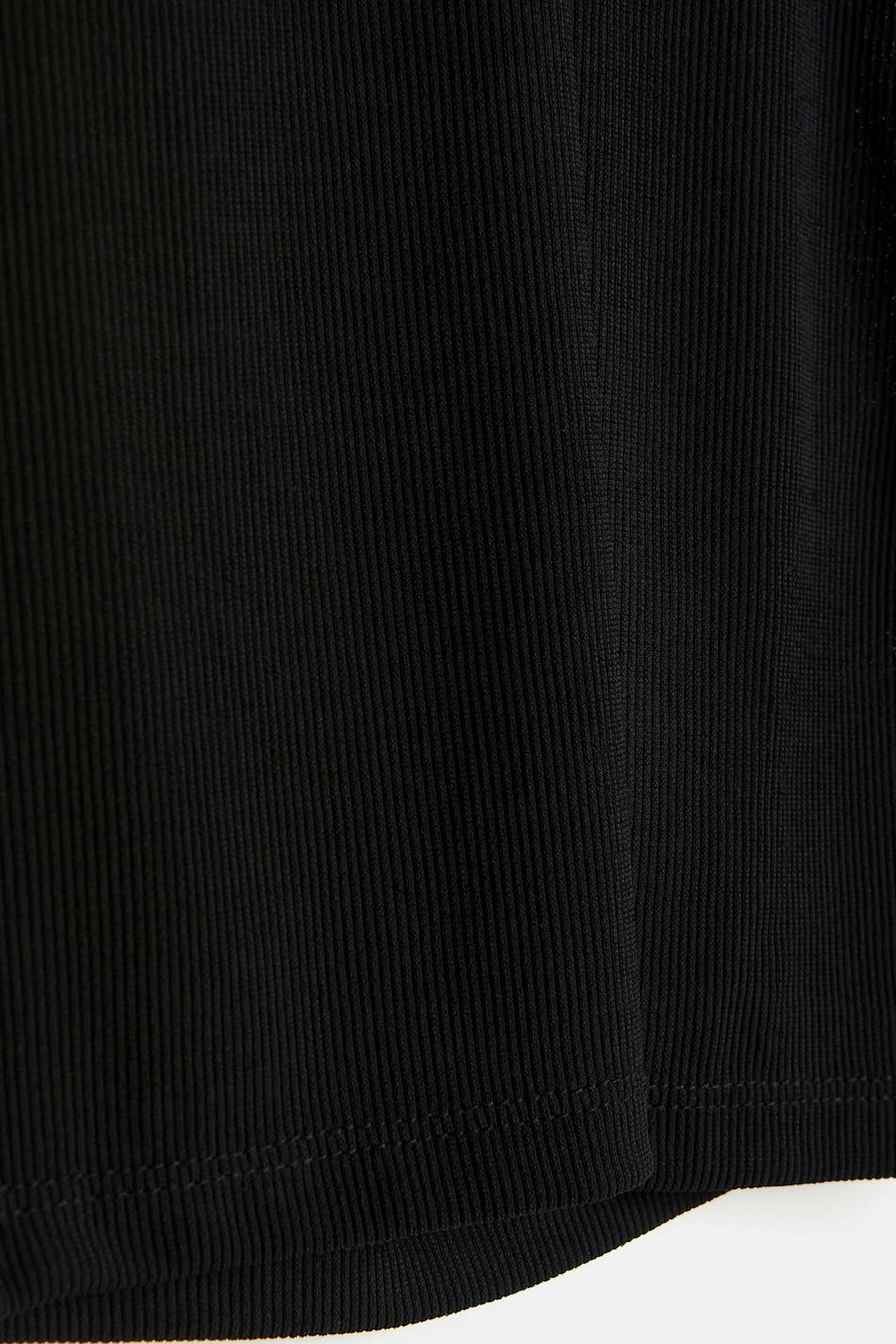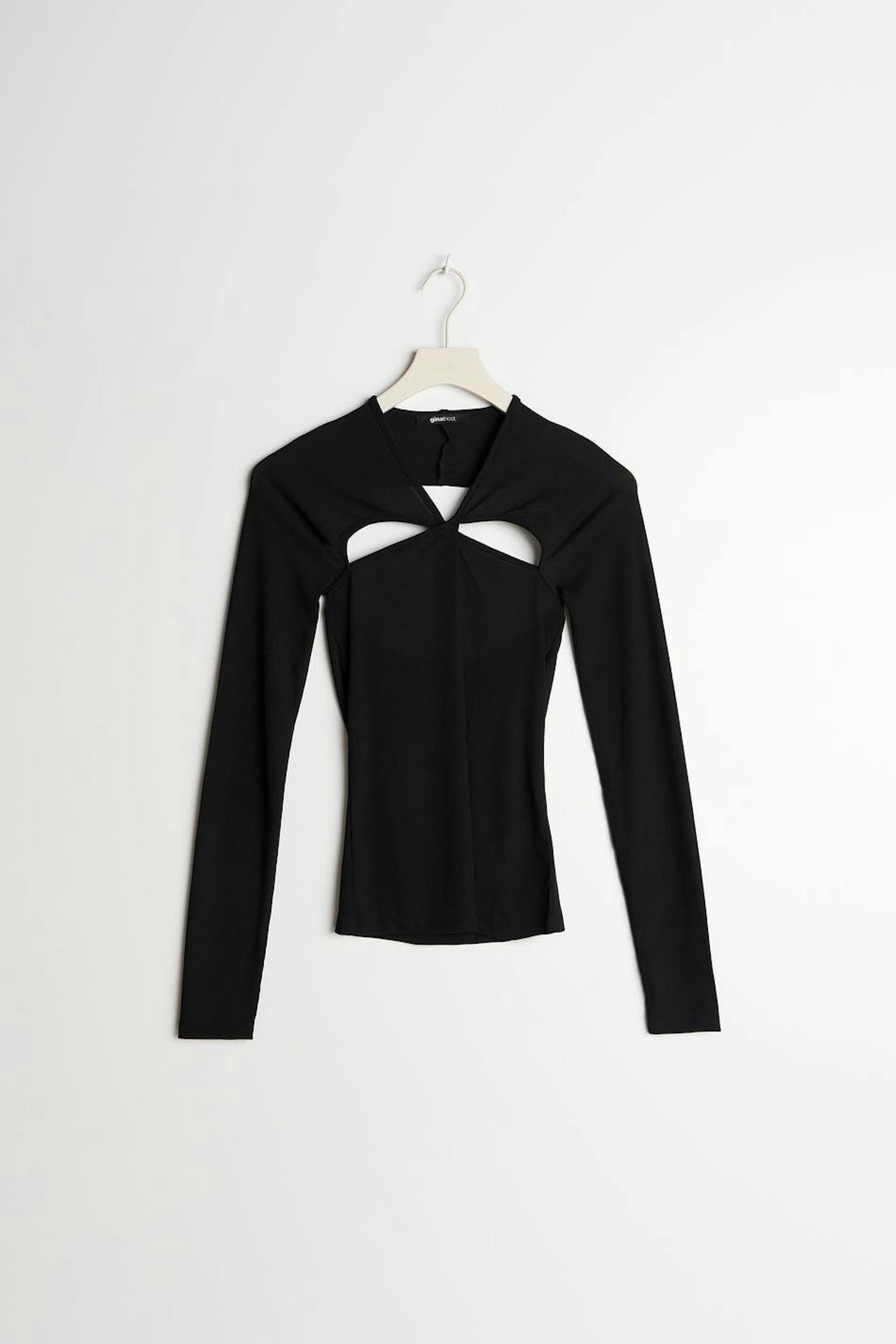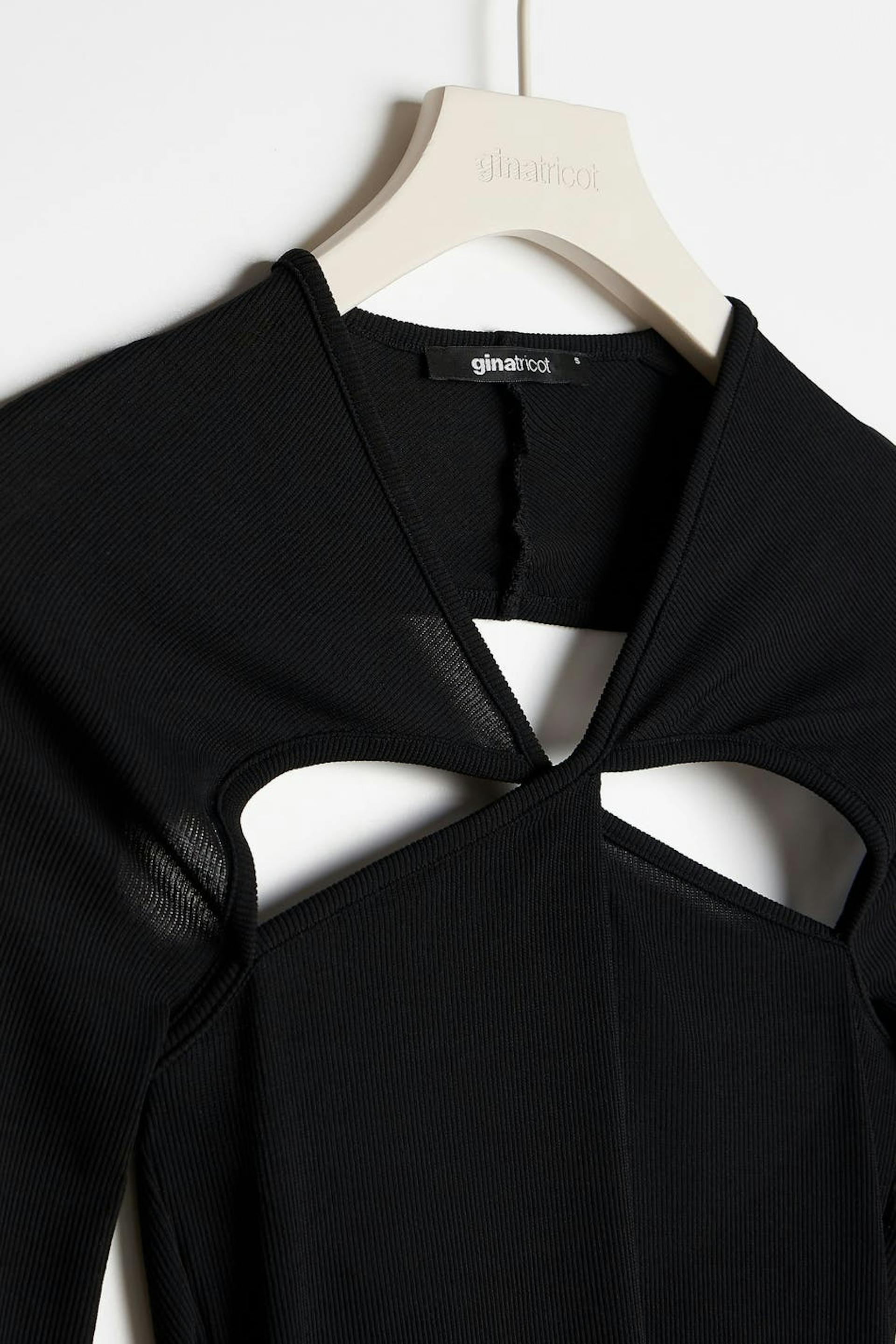 Ribbad topp med cutout detaljer framtill. Toppen är perfekt för festen, svart och långärmad. Den har en figurnära passform, en öppning i ryggen och ett material i återvunnen polyester.