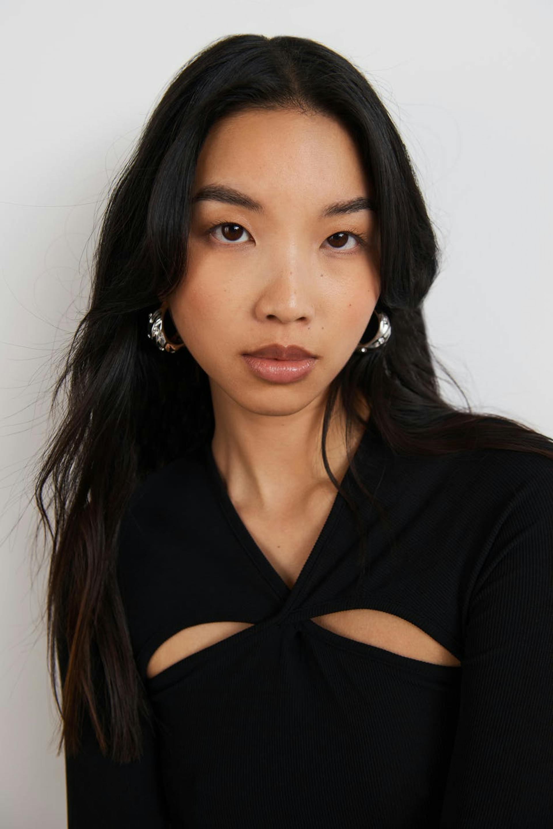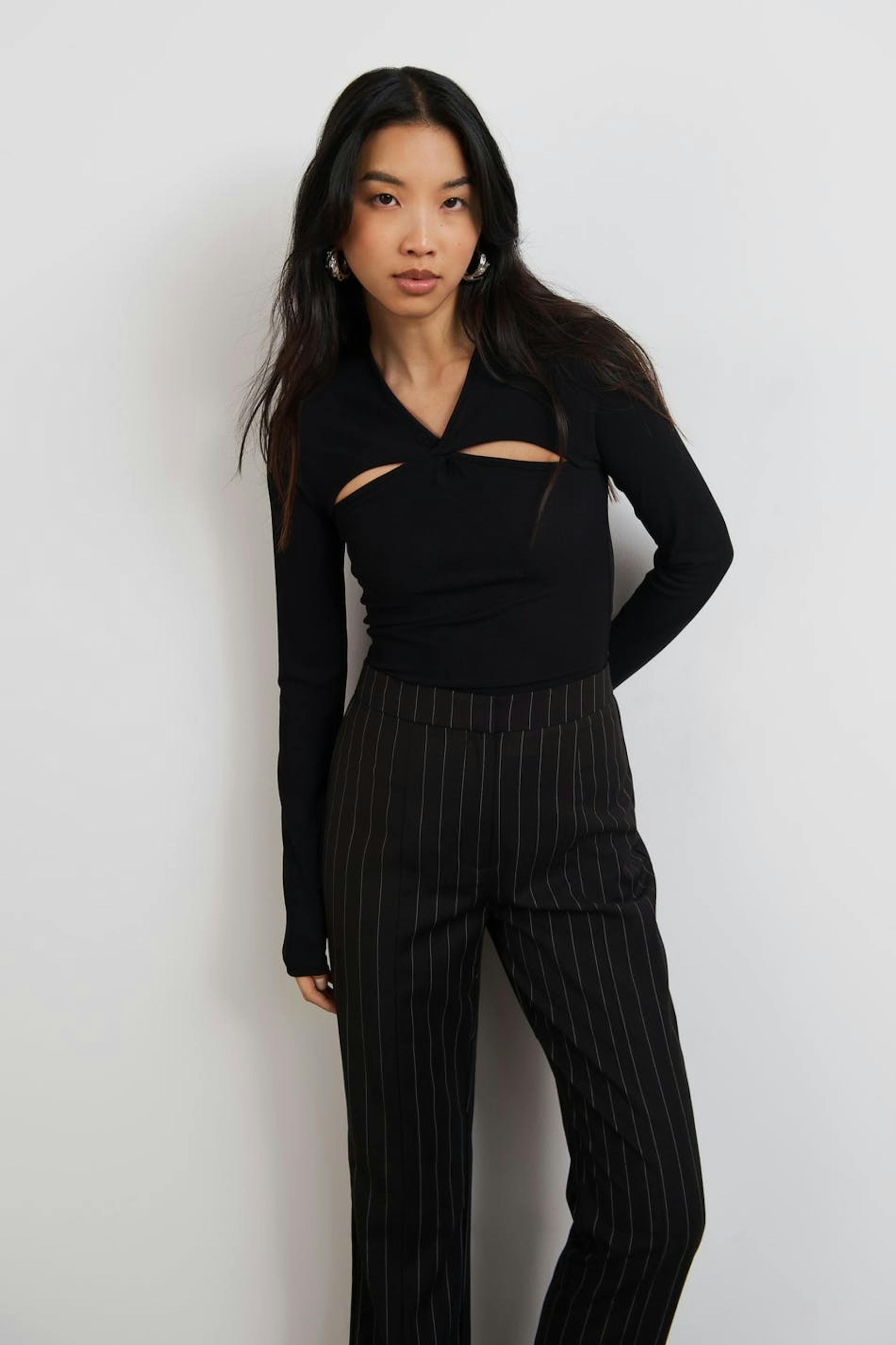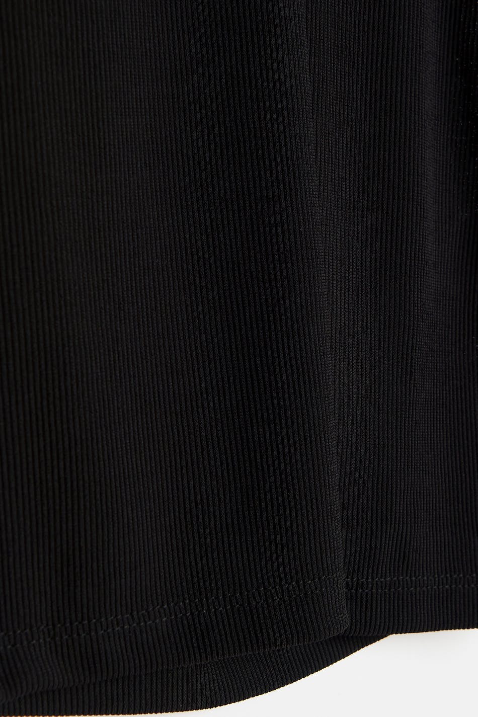 Ribbad topp med cutout detaljer framtill. Toppen är perfekt för festen, svart och långärmad. Den har en figurnära passform, en öppning i ryggen och ett material i återvunnen polyester.