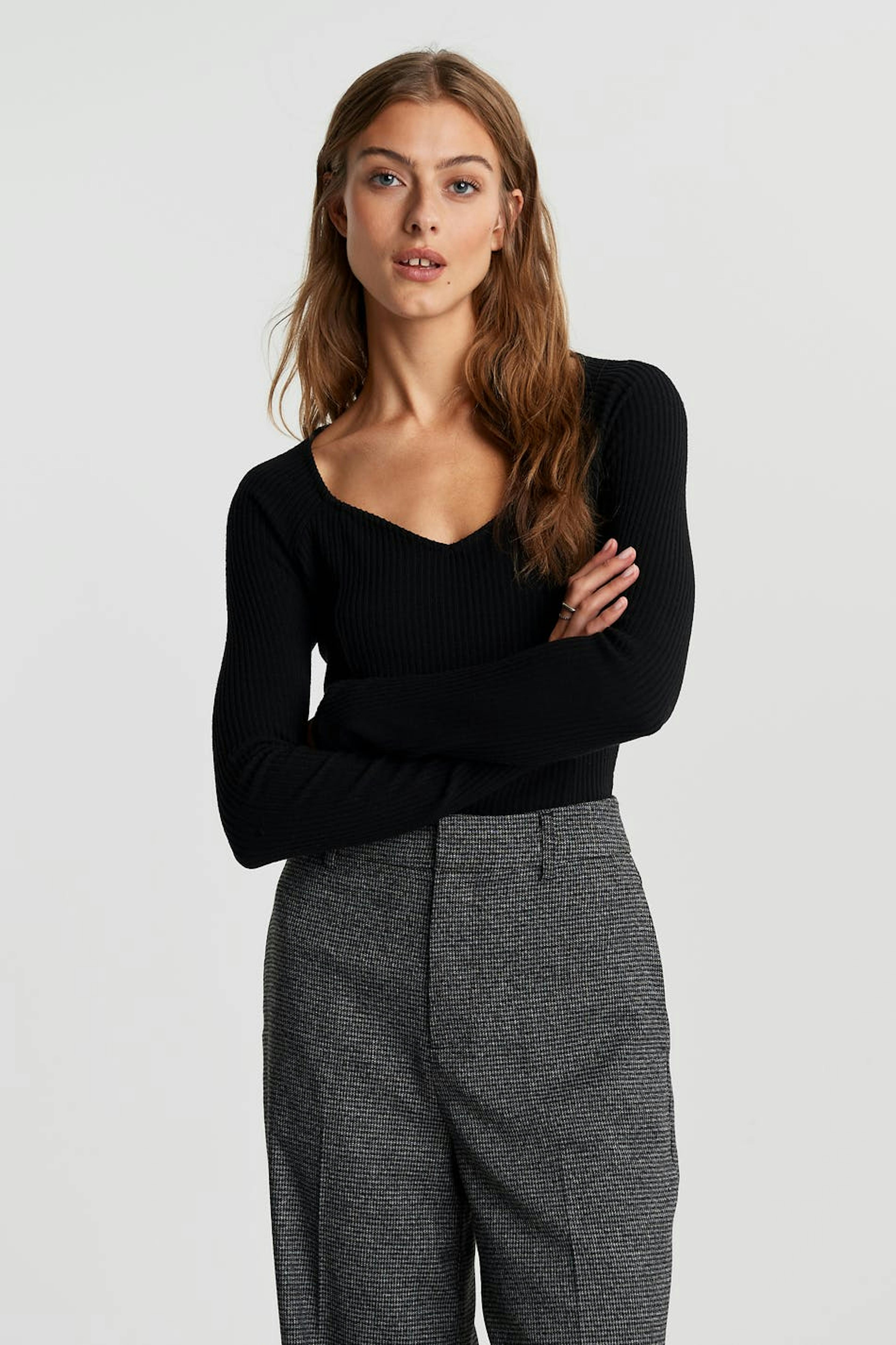 Ribbstickad topp med en figurnära passform. Toppen är svart och långärmad och har en hjärtformad halsringning. Den är gjord av trikå.