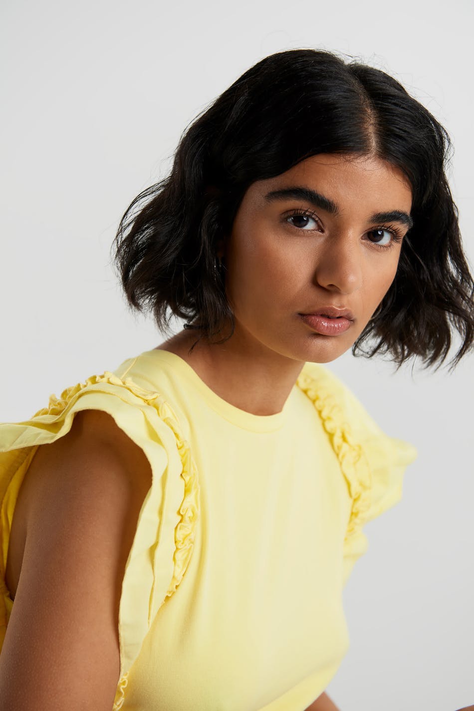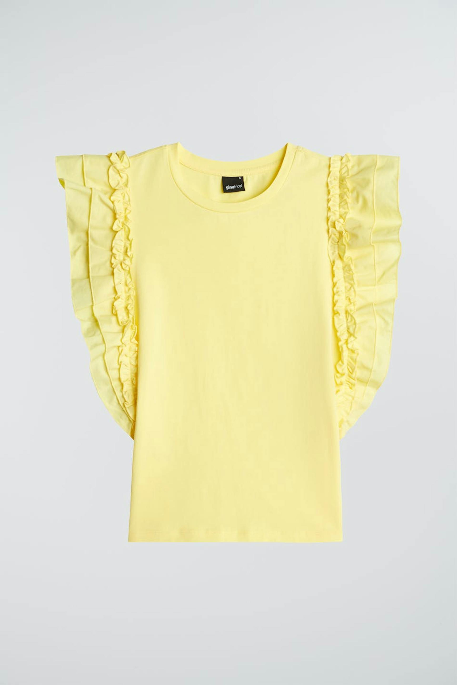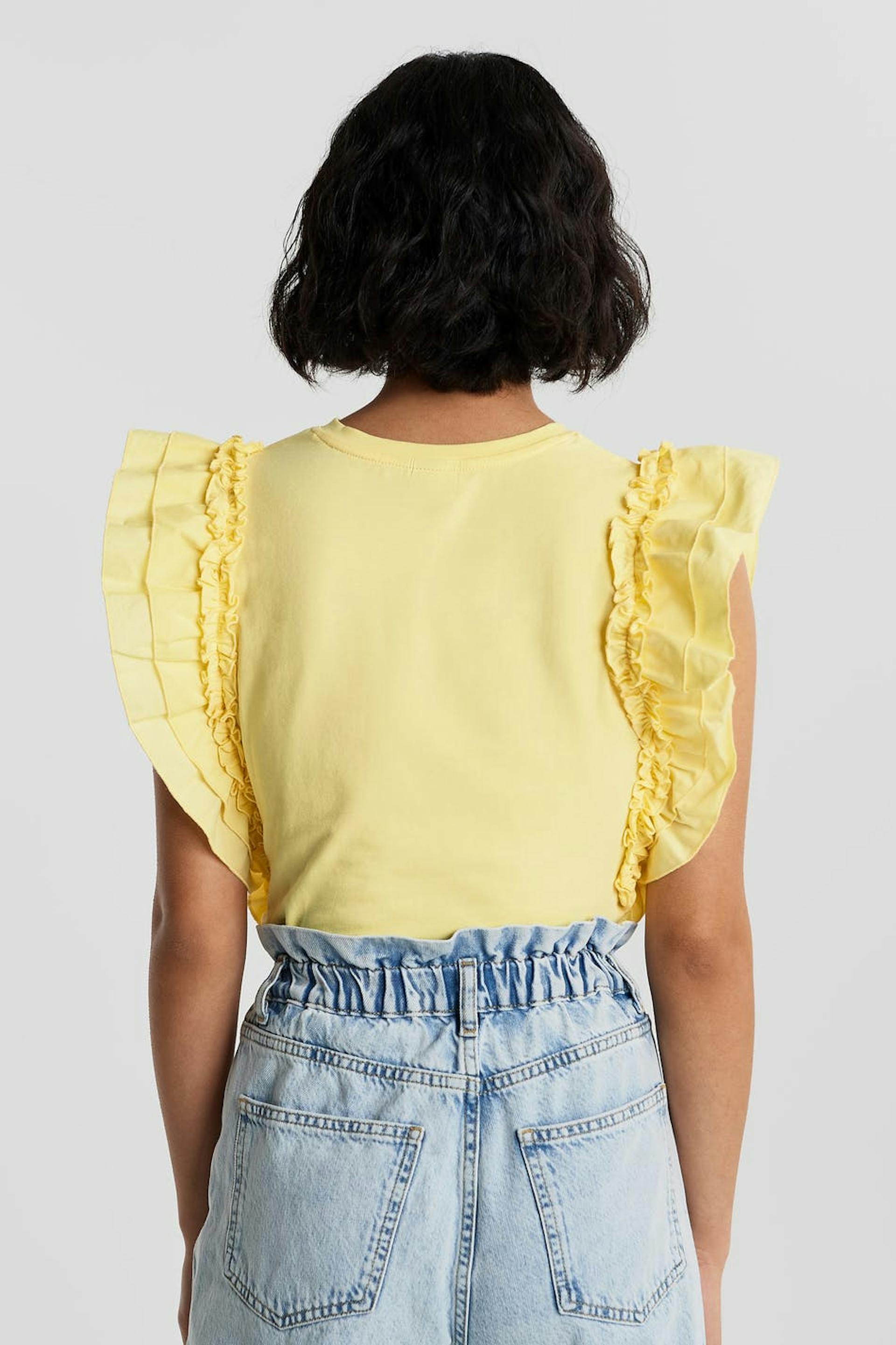 Ärmlös topp med en normal passform. Toppen är gul och har volanger på axlarna. Den är gjord av trikå.
