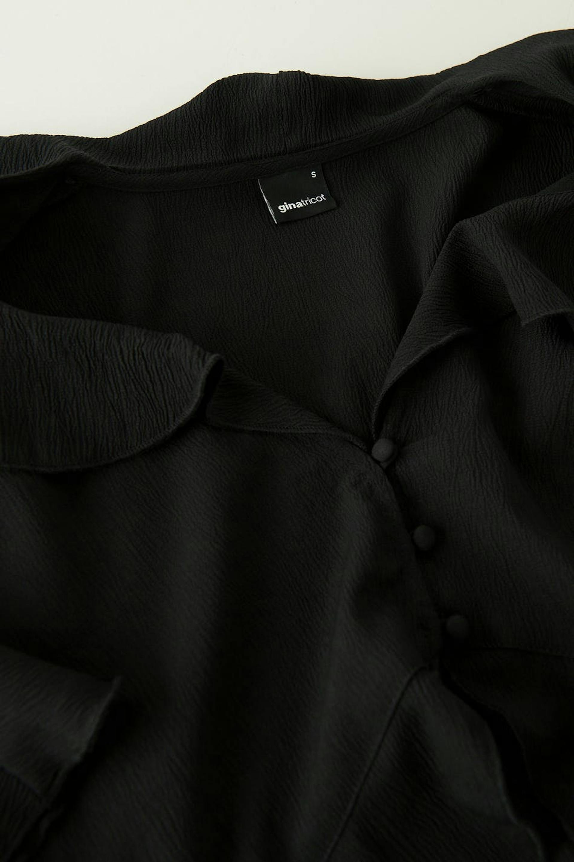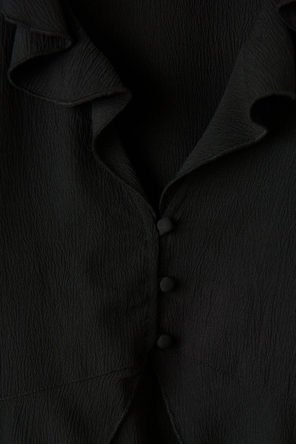 Långärmad topp med djup v-ringning. Toppen är svart och har en figurnära passform. Den har trekvartsärmar, knappstängning fram och volanger framtill, vid ärmslut och i nederkant.