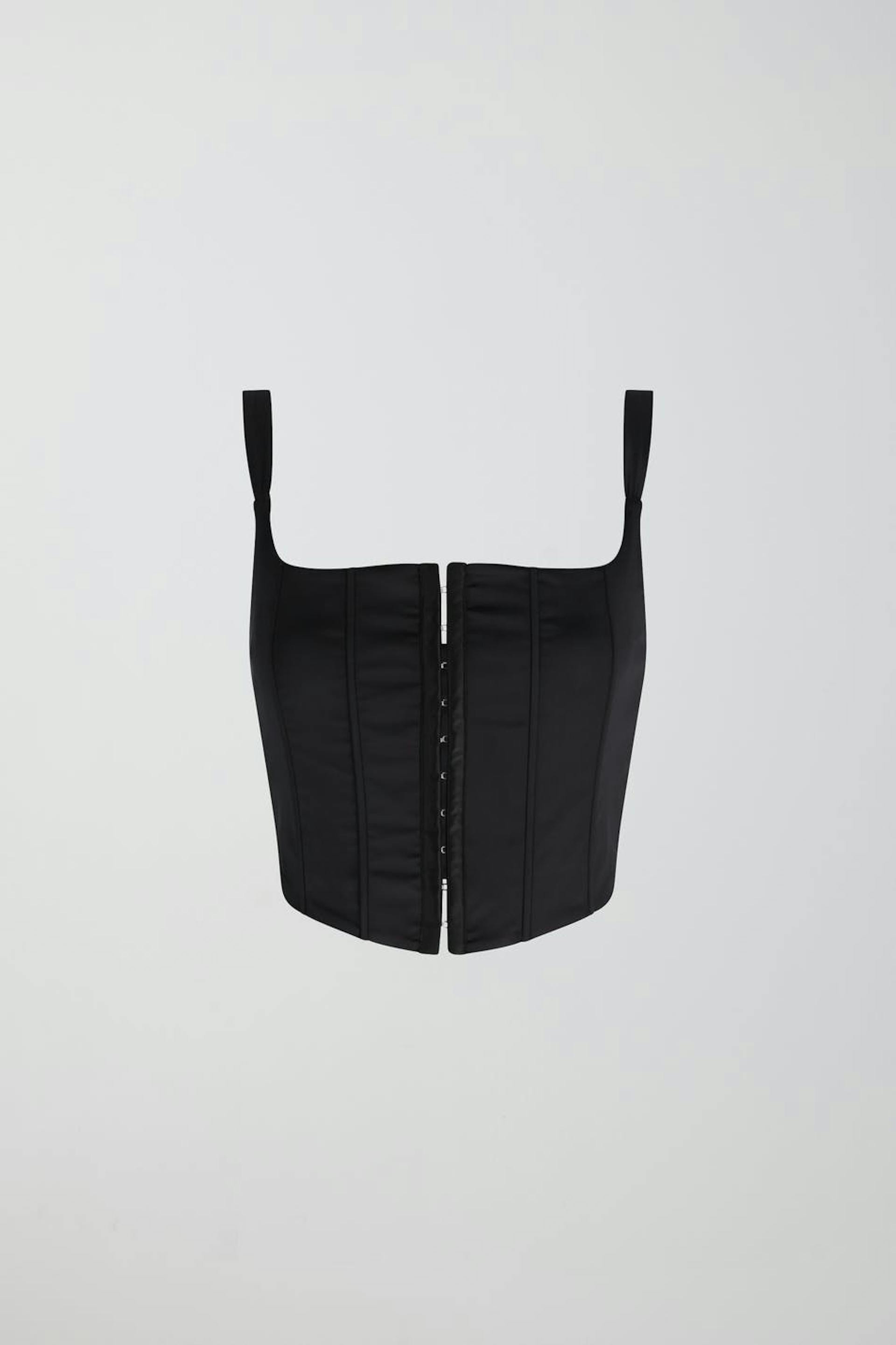 Korsett-topp med hysk- och hakestängning framtill. Toppen är perfekt för festen och svart och har fyrkantig halsringning. Den har axelband och stretchig kvalitet.