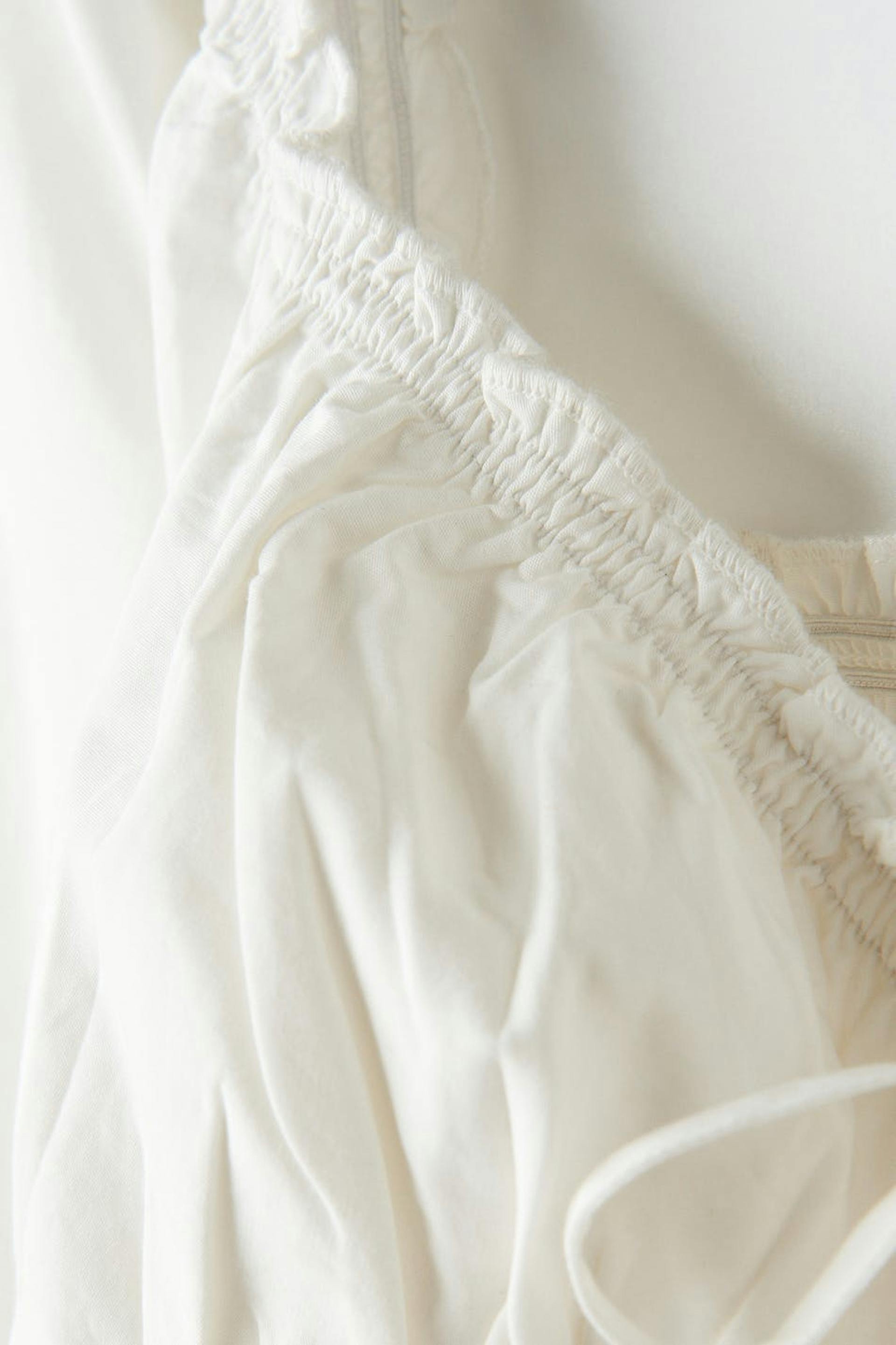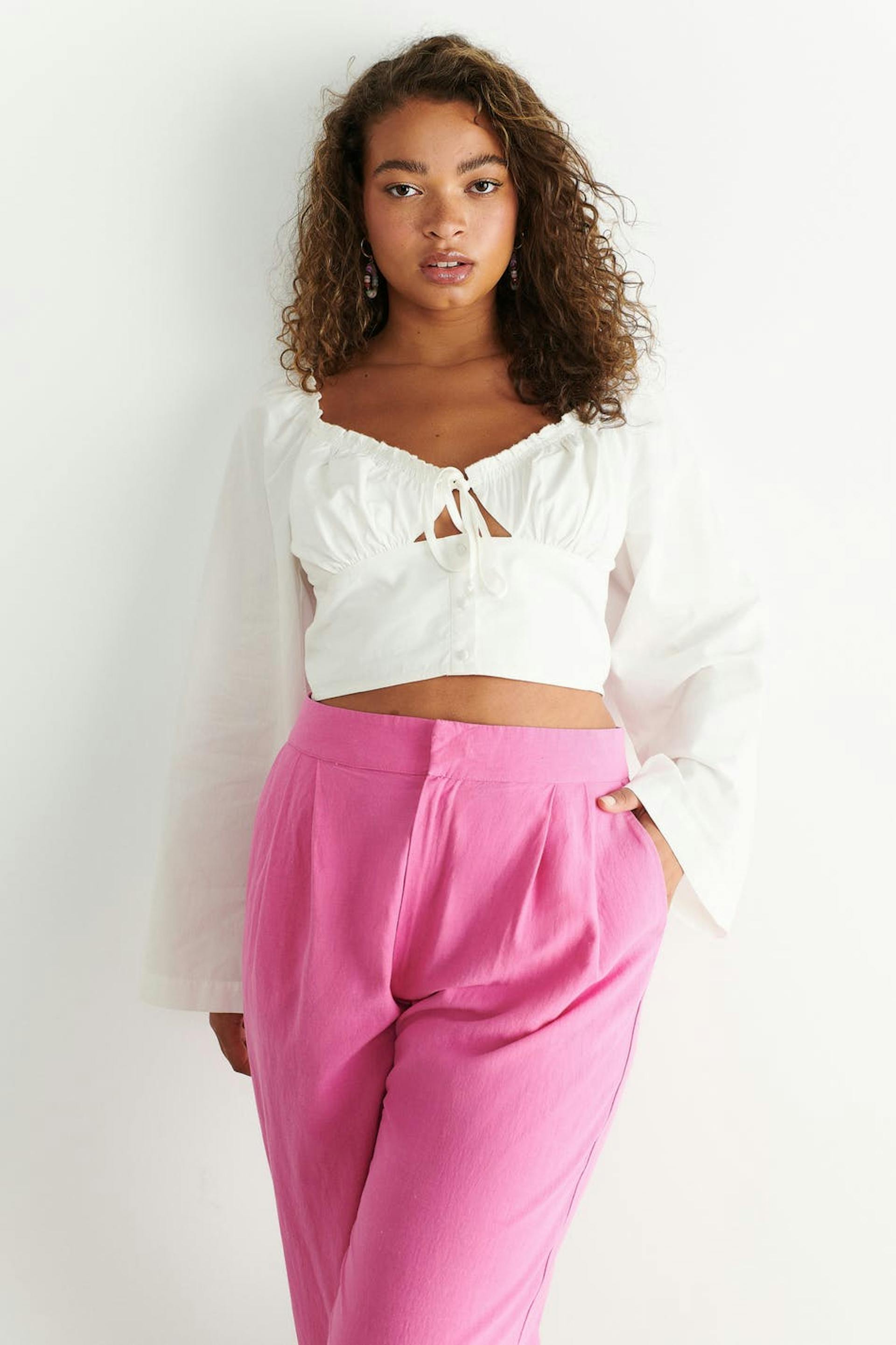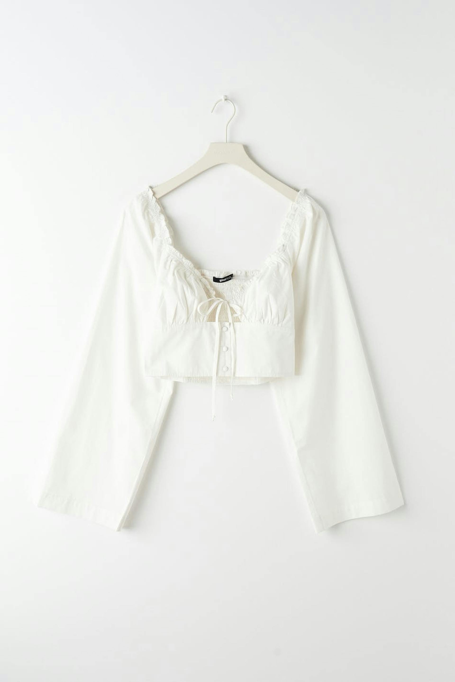 Bustier-topp i 100% återvunnen polyester med utsvängda ärmar. Toppen är vit och har rynkad byst med knytning och cut out-detalj. Den har knappstängning fram, smock i ryggen och en croppad längd.
