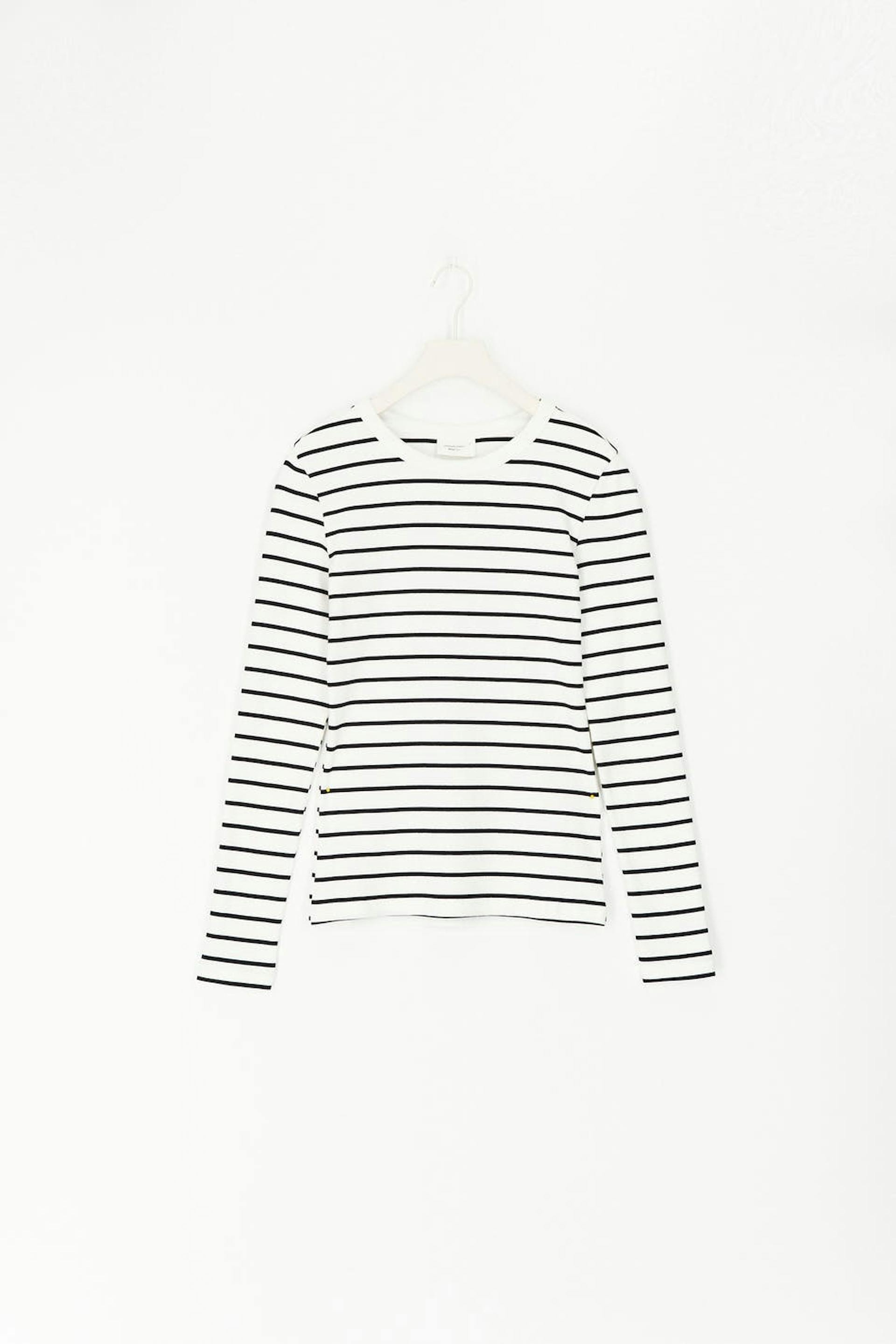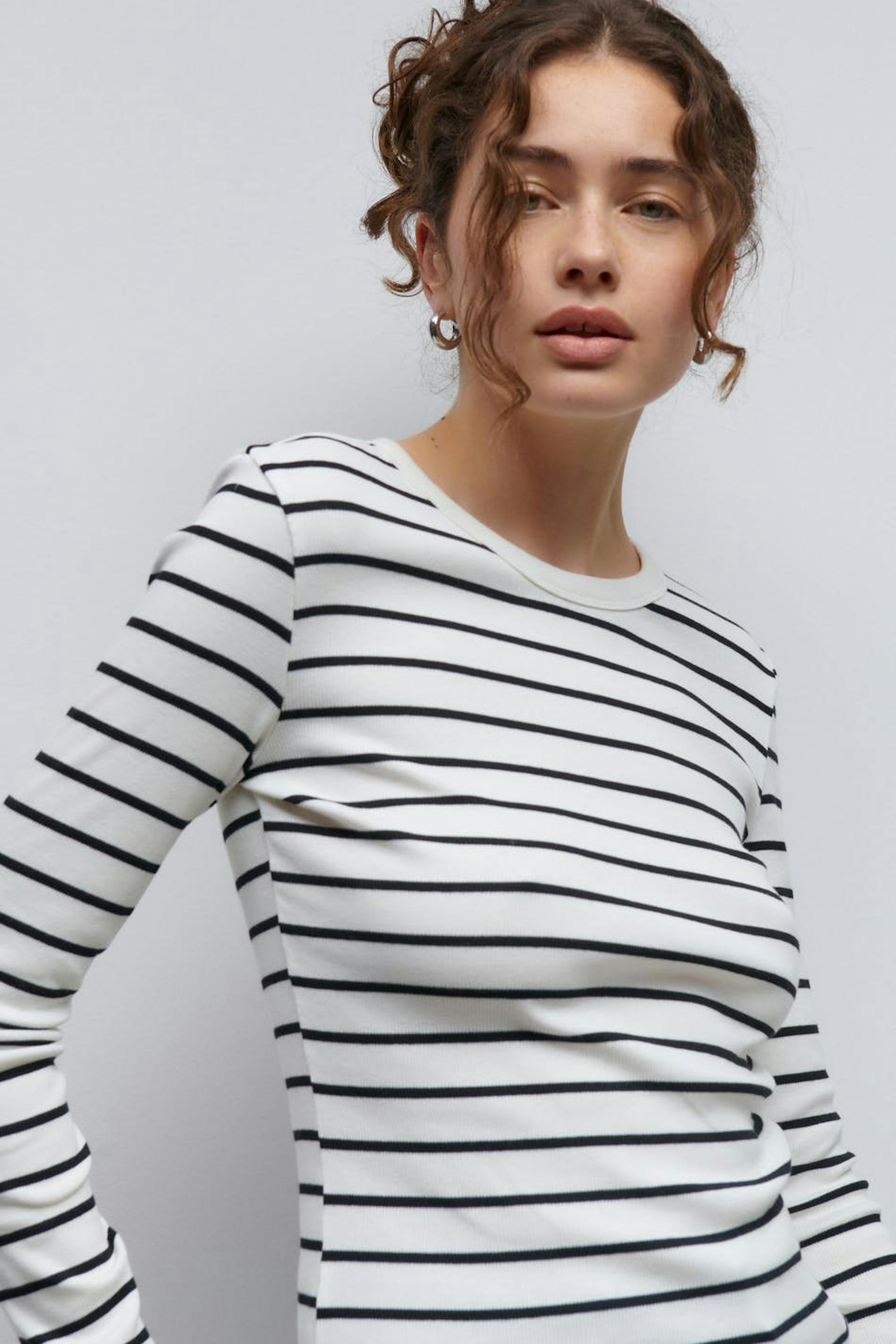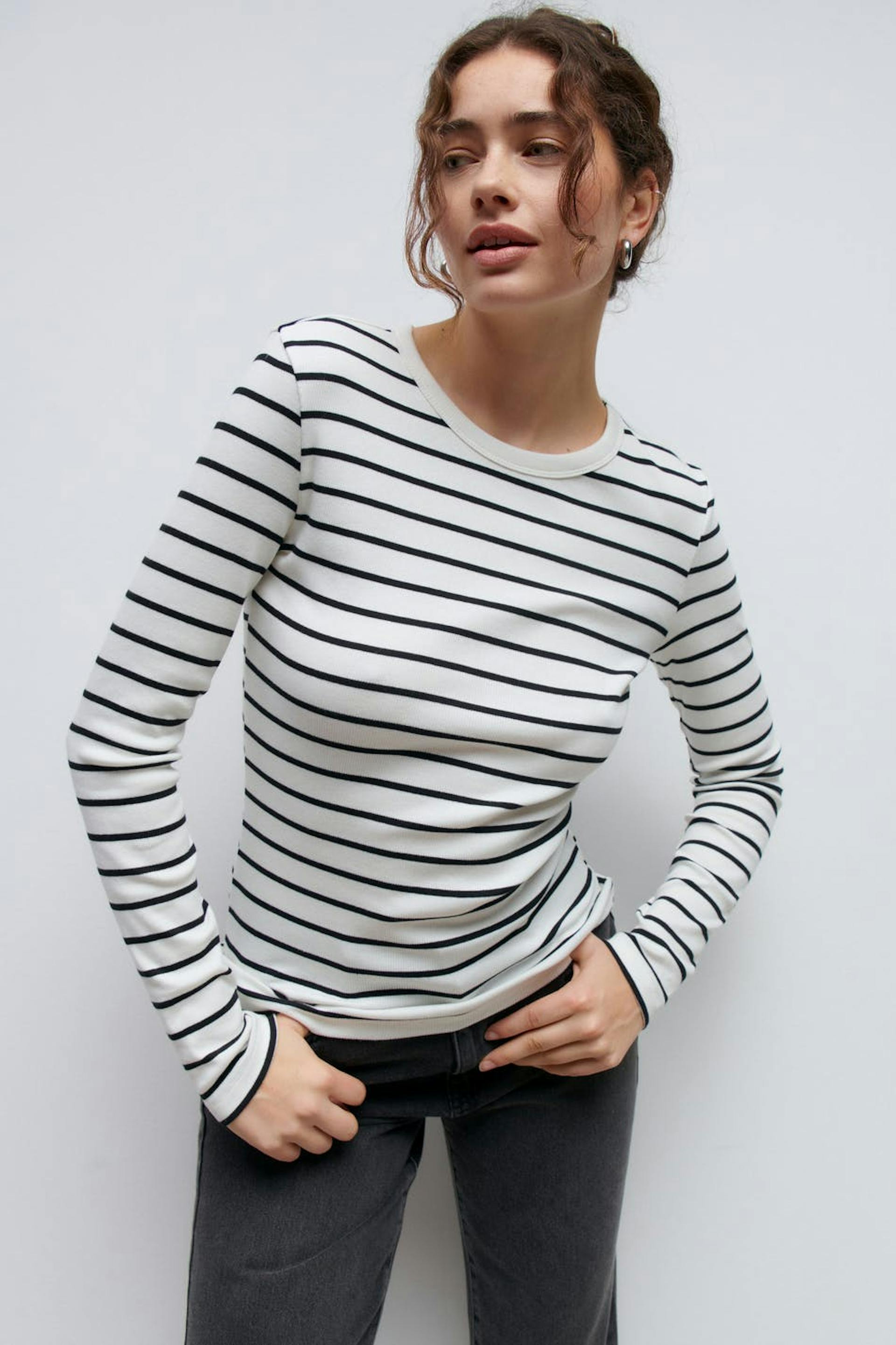 Randig trikåtopp med figurnära passform. Trikåtoppen är vit, långärmad och ribbad. Den har en rund halsringning.