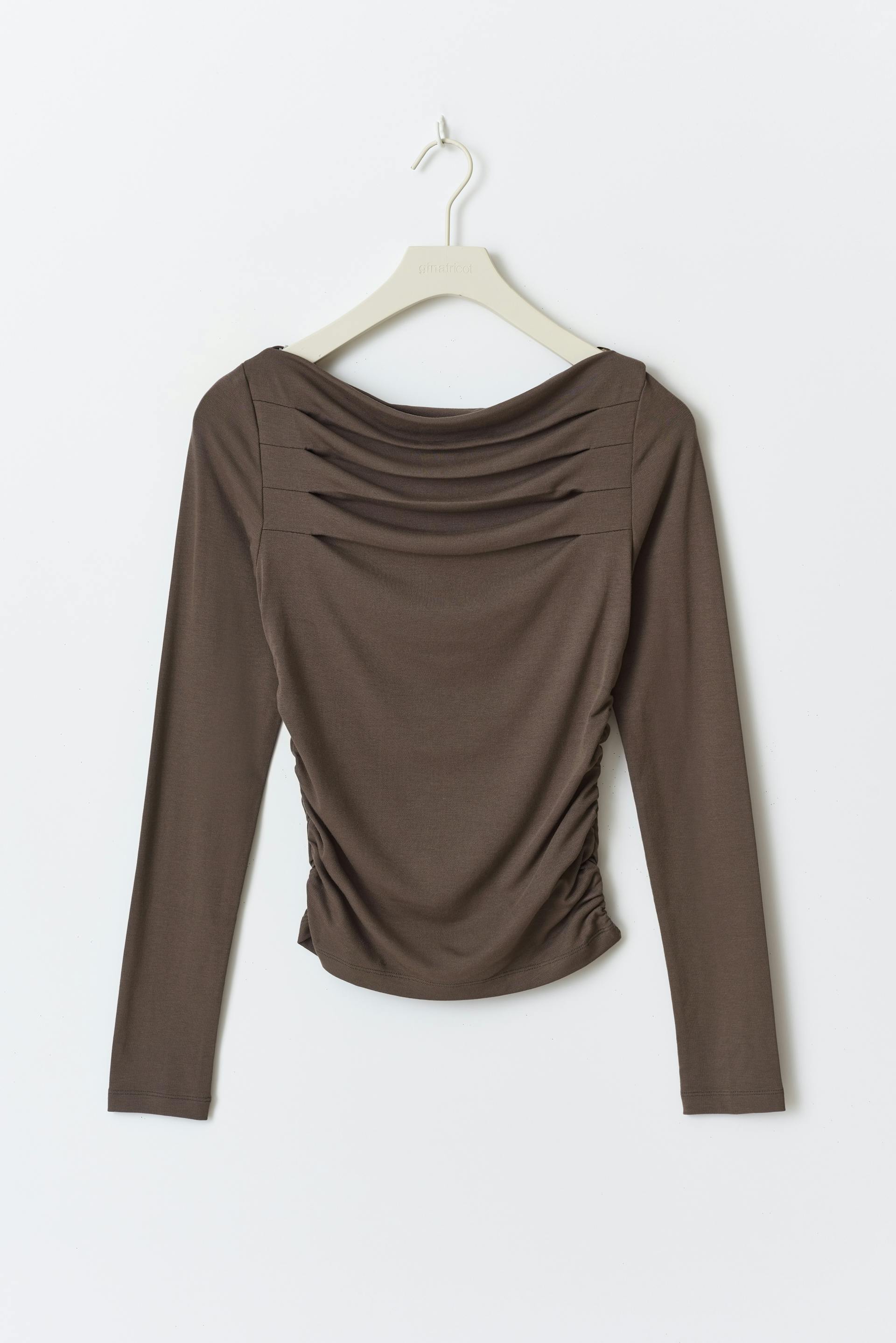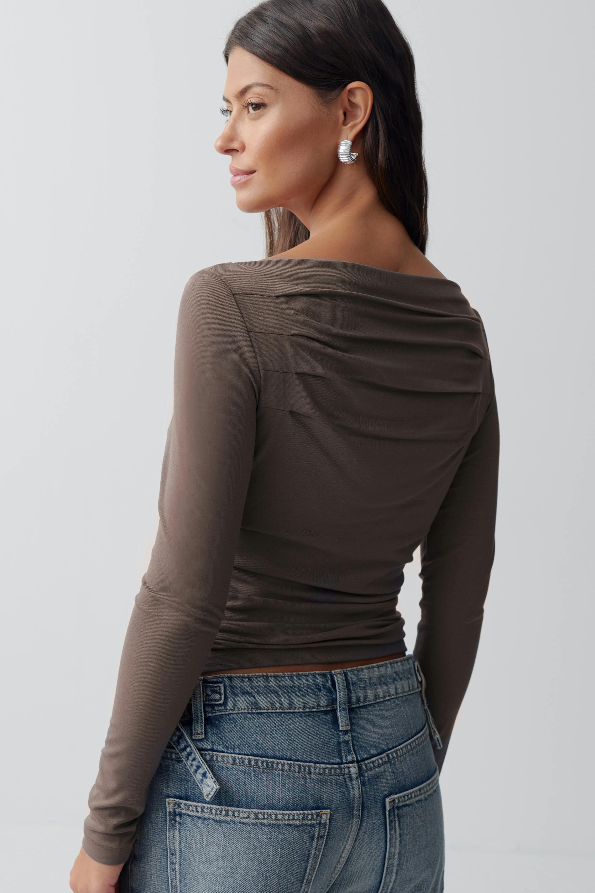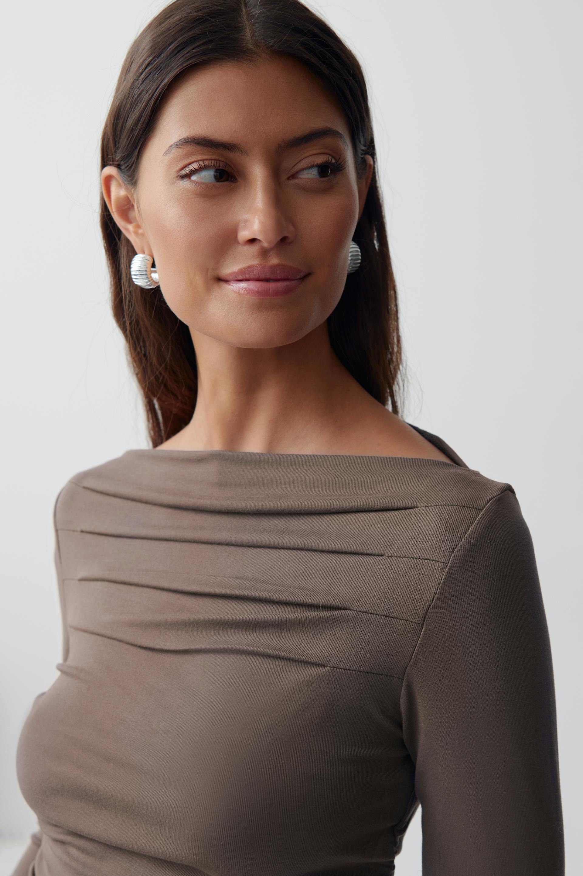 Långärmad topp med veckade detaljer upptill. Toppen är brun och har båtringning. Den har figurnära passform och croppad längd.