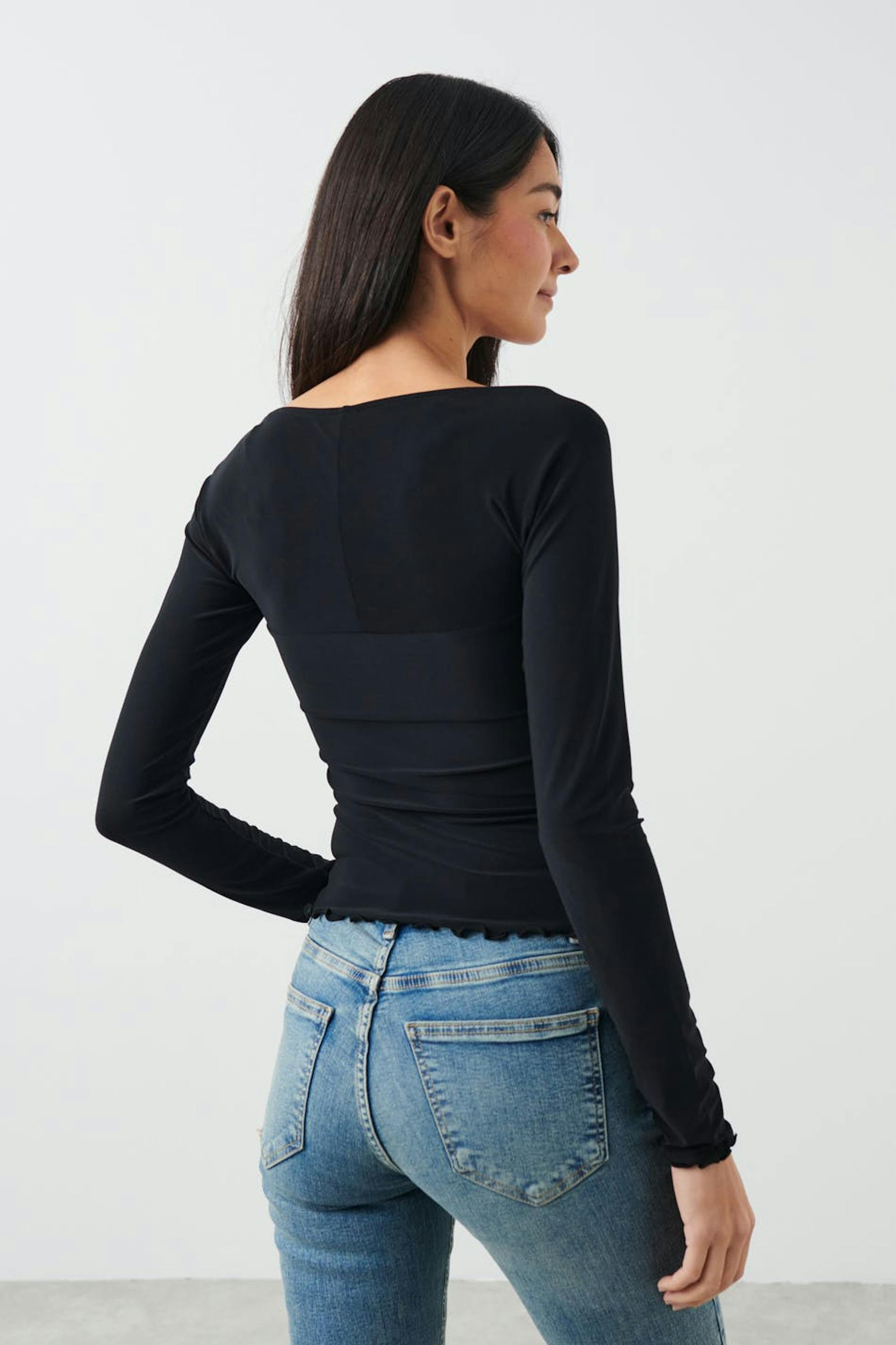 Långärmad topp i boleromodell med figurnära passform. Toppen är svart och har fyrkantig halsringning med kontrastfärgad söm och rosettdetalj. Den har rynkad byst och overlockad nederkant.