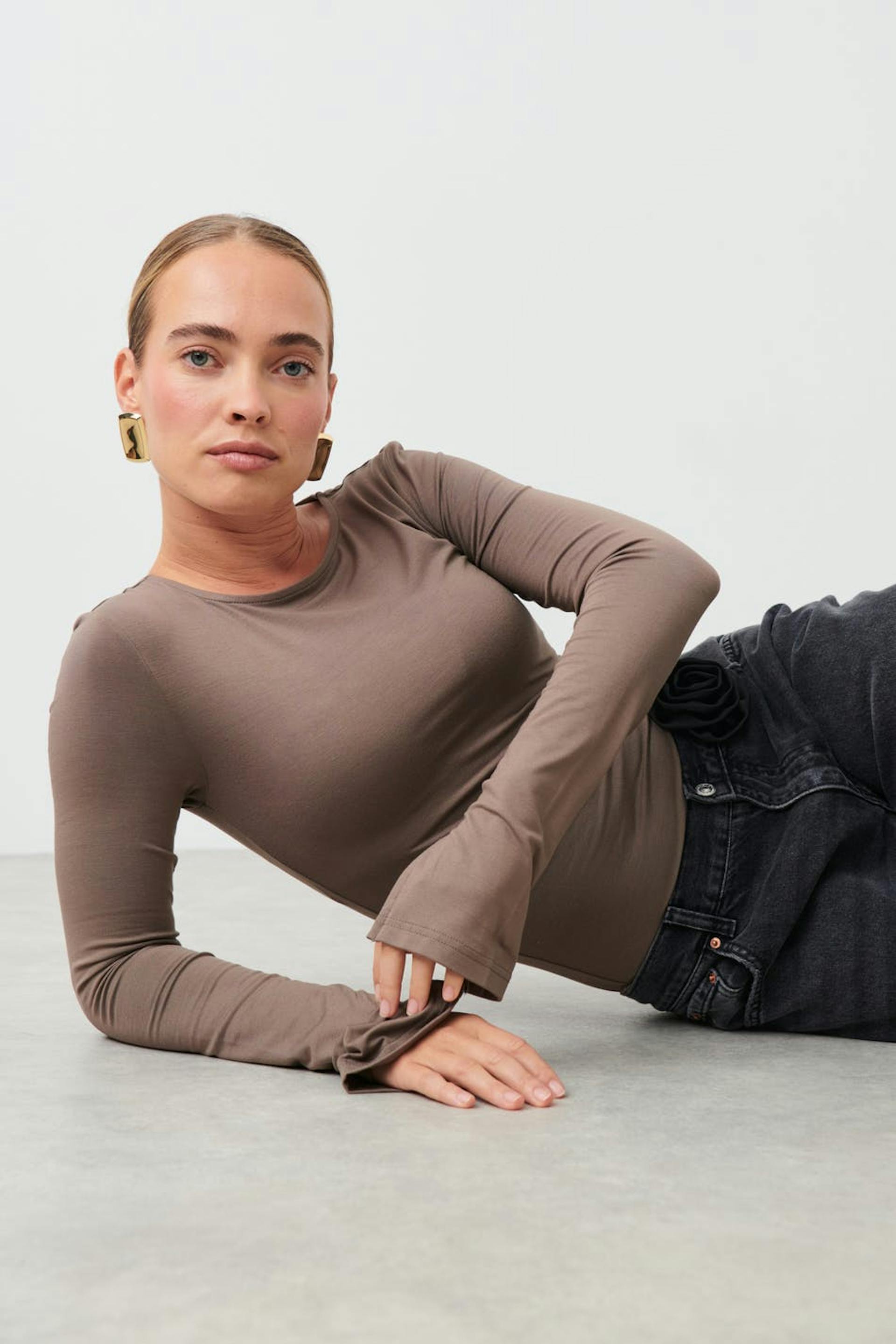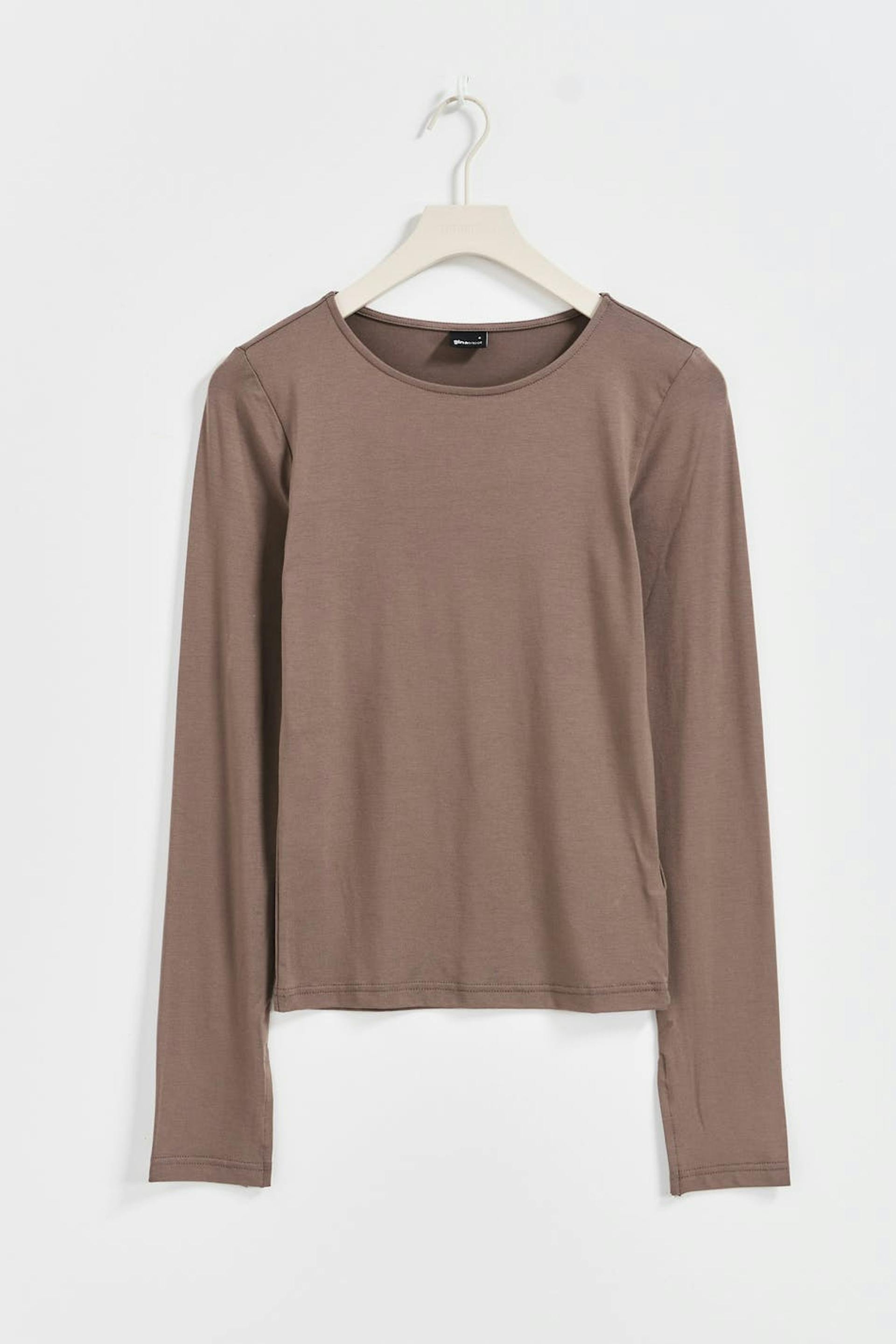 Soft touch – second skin comfort. Långärmad topp i mjuk viskos med figurnära passform. Toppen är beige och har rund halsringning. Den har slits vid ärmsluten.