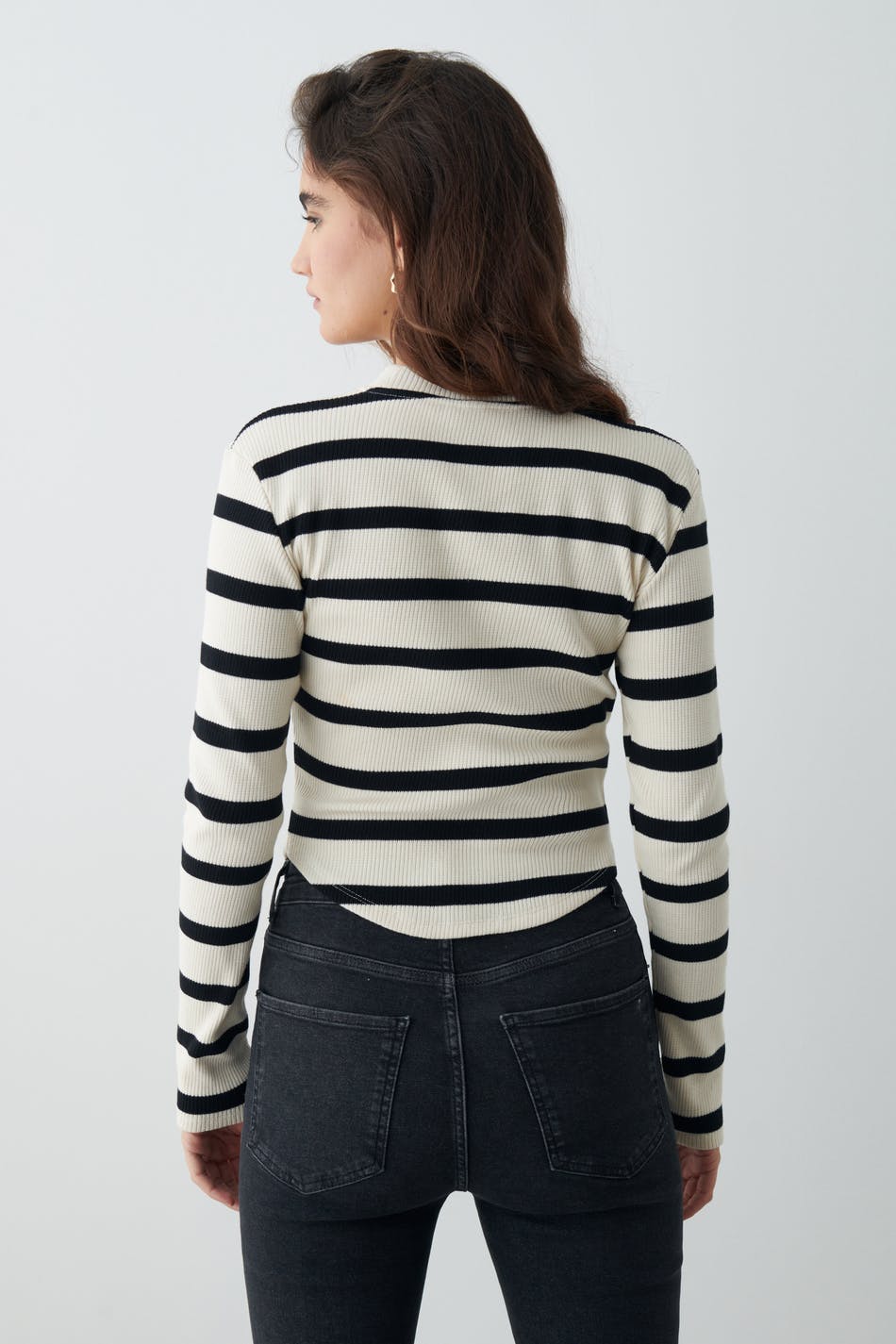 Randig topp i trikå med halvpolo. Toppen är vit, svart och långärmad. Den har ribbad kvalitet, figurnära passform och rundad nederkant.