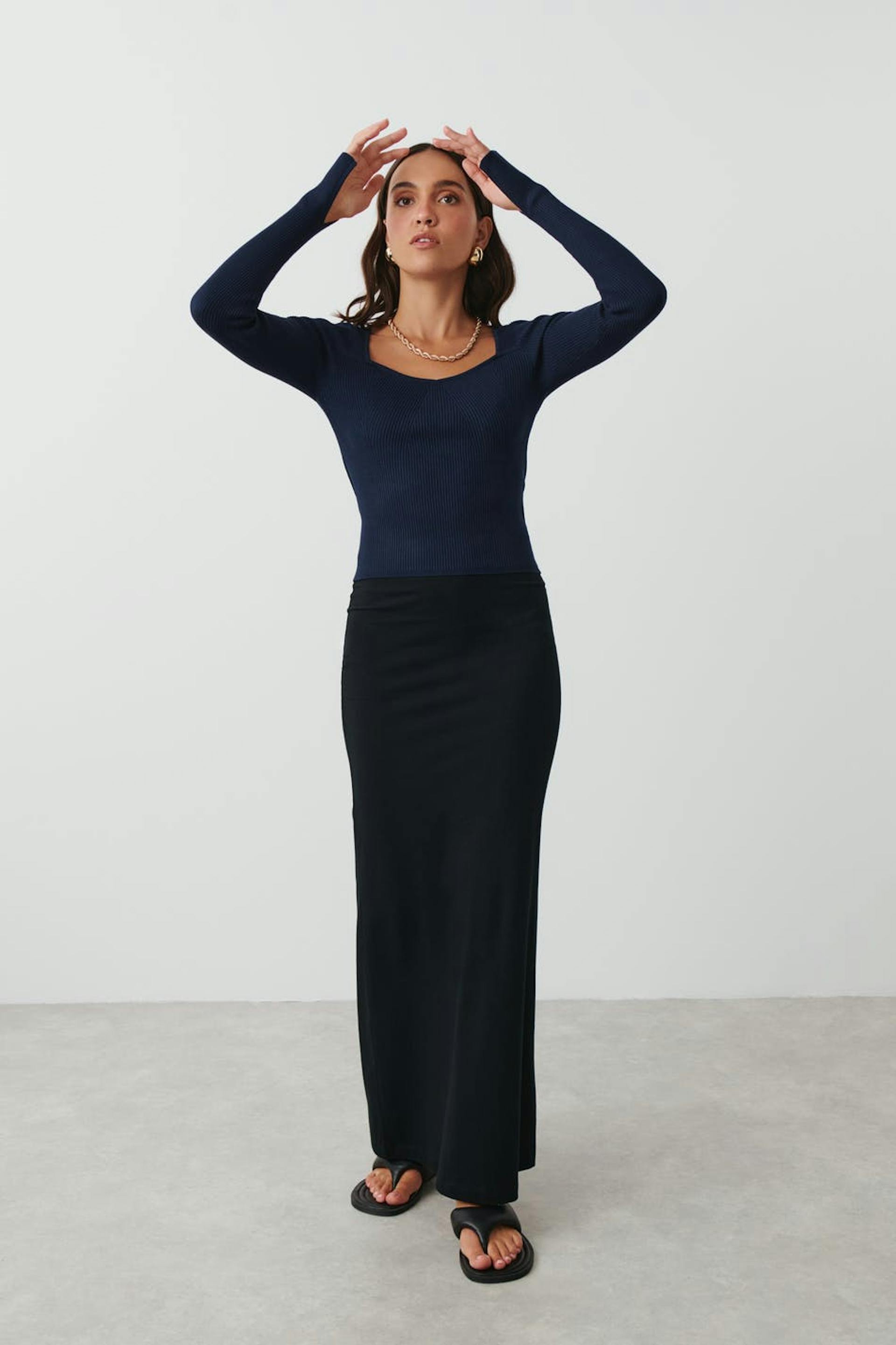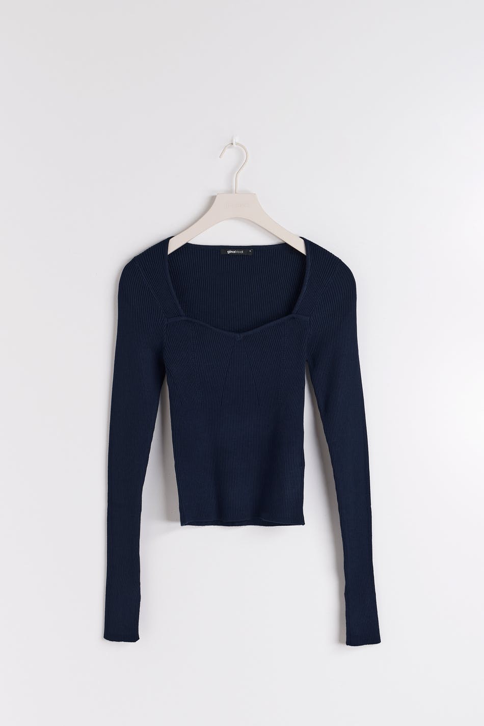 Stickad topp med hjärtformad ringning. Toppen är blå, ribbad och långärmad. Den har figurnära passform, slits vid ärmsluten och formstickade partier framtill.
