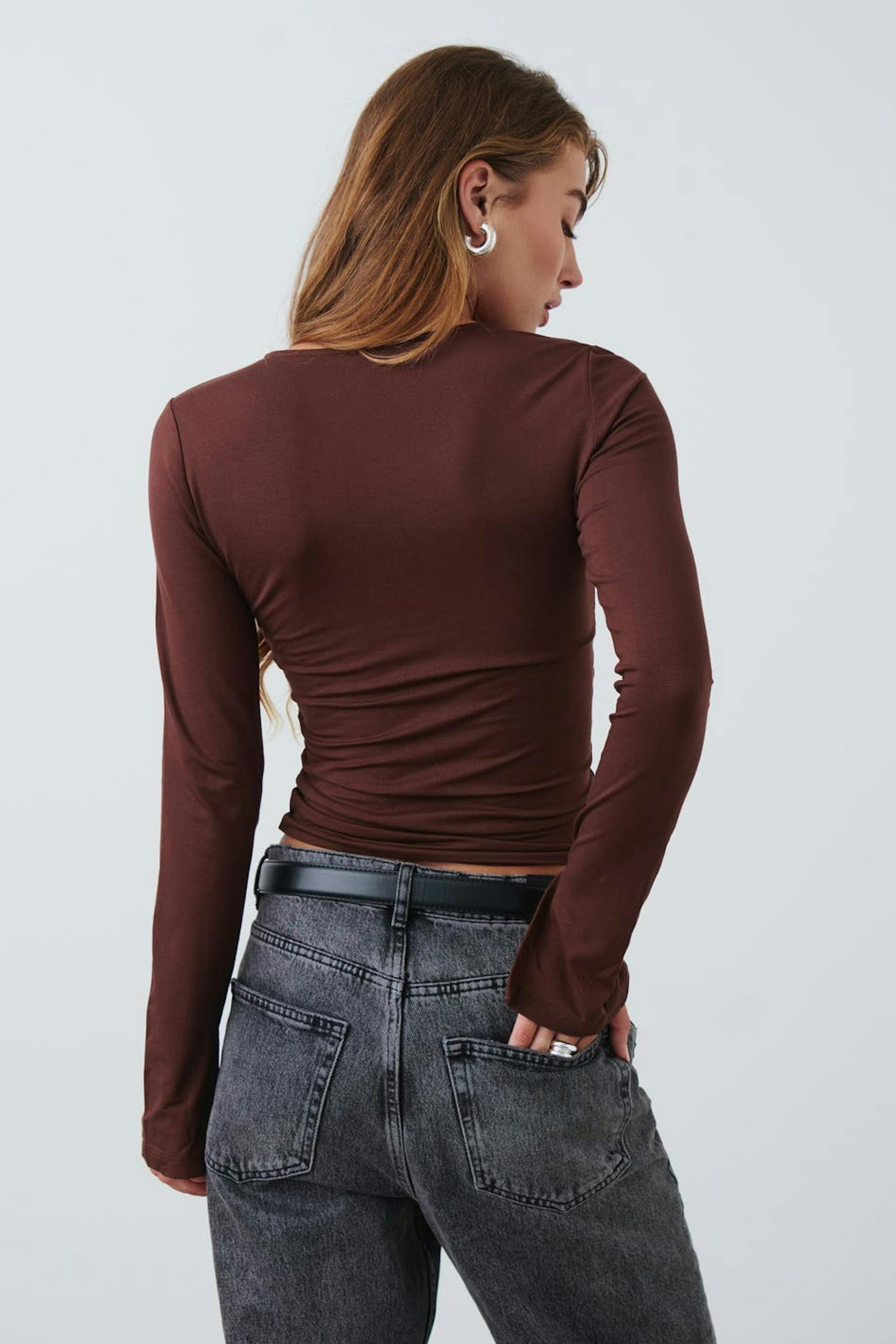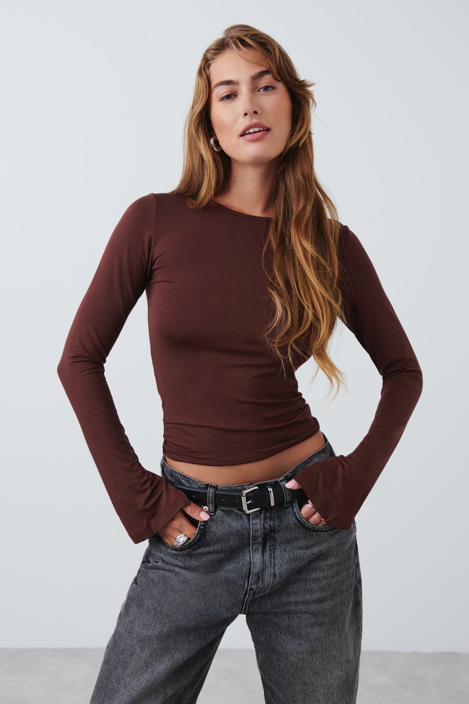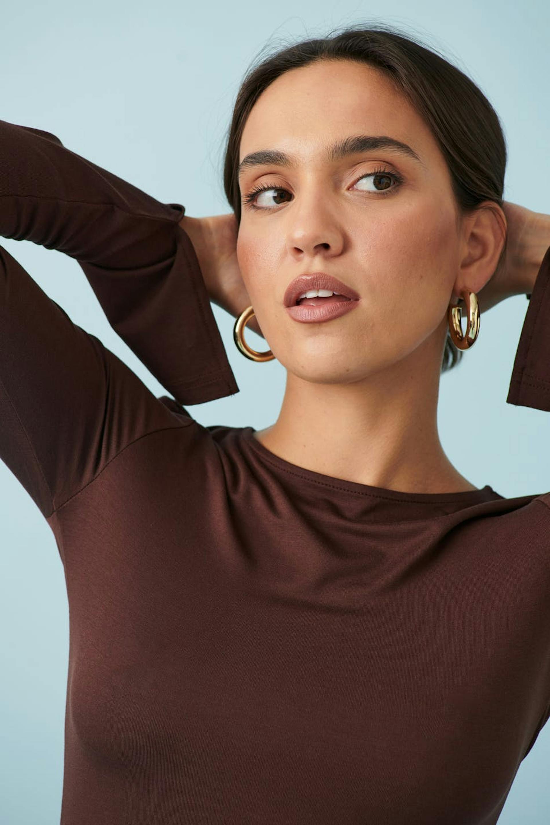 Soft touch – second skin comfort. Långärmad topp i mjuk viskos med figurnära passform. Toppen är röd och har rund halsringning. Den har slits vid ärmsluten.