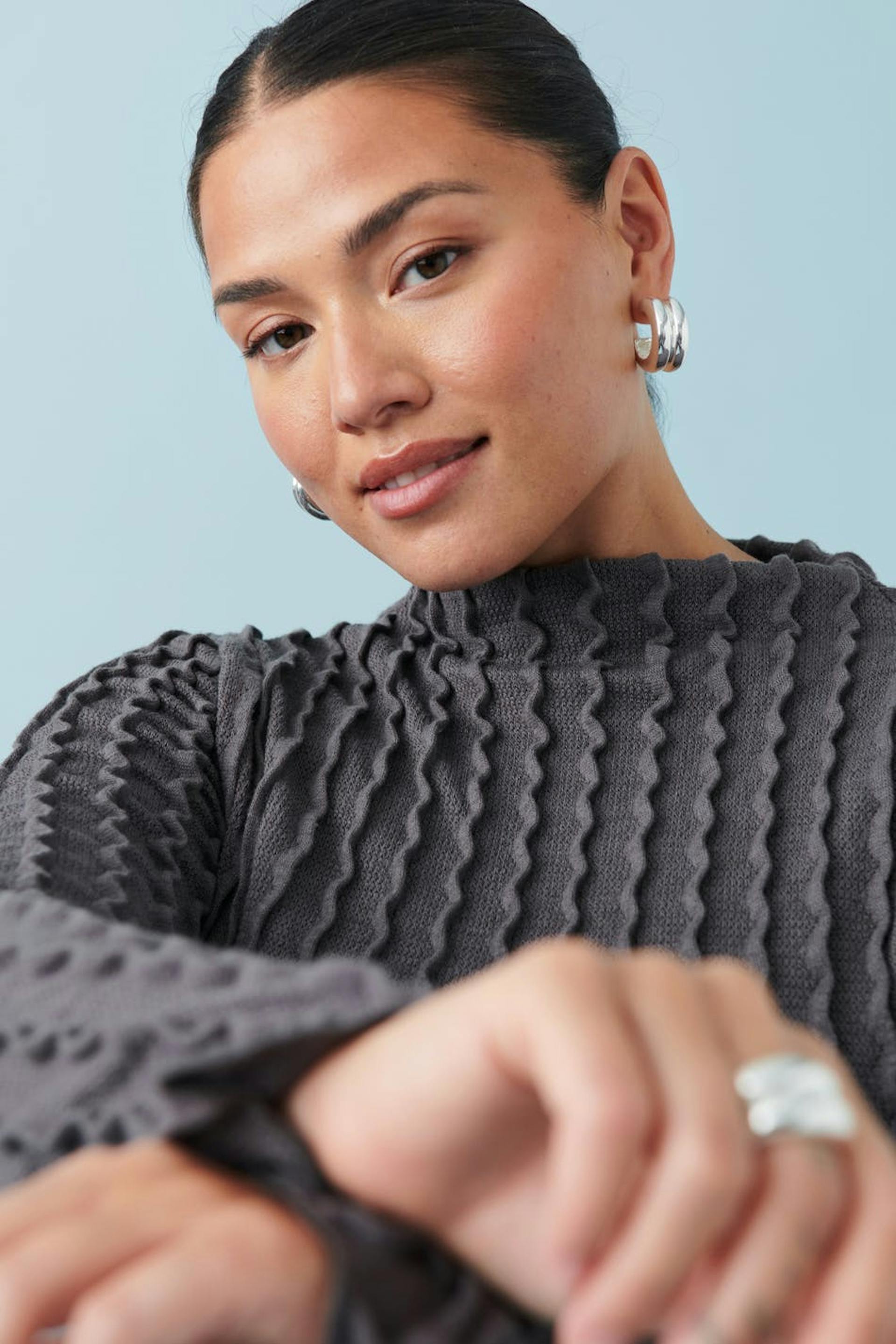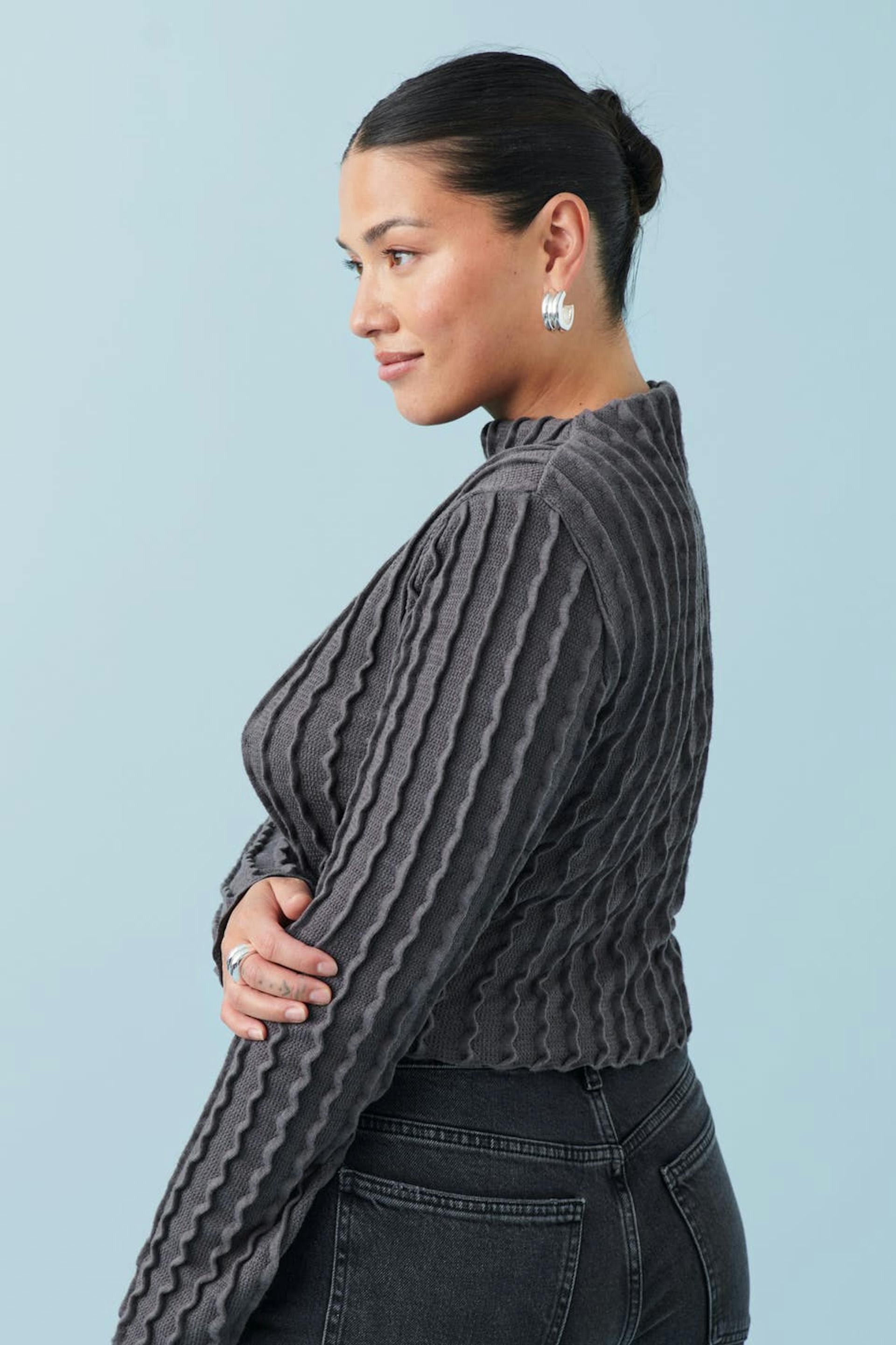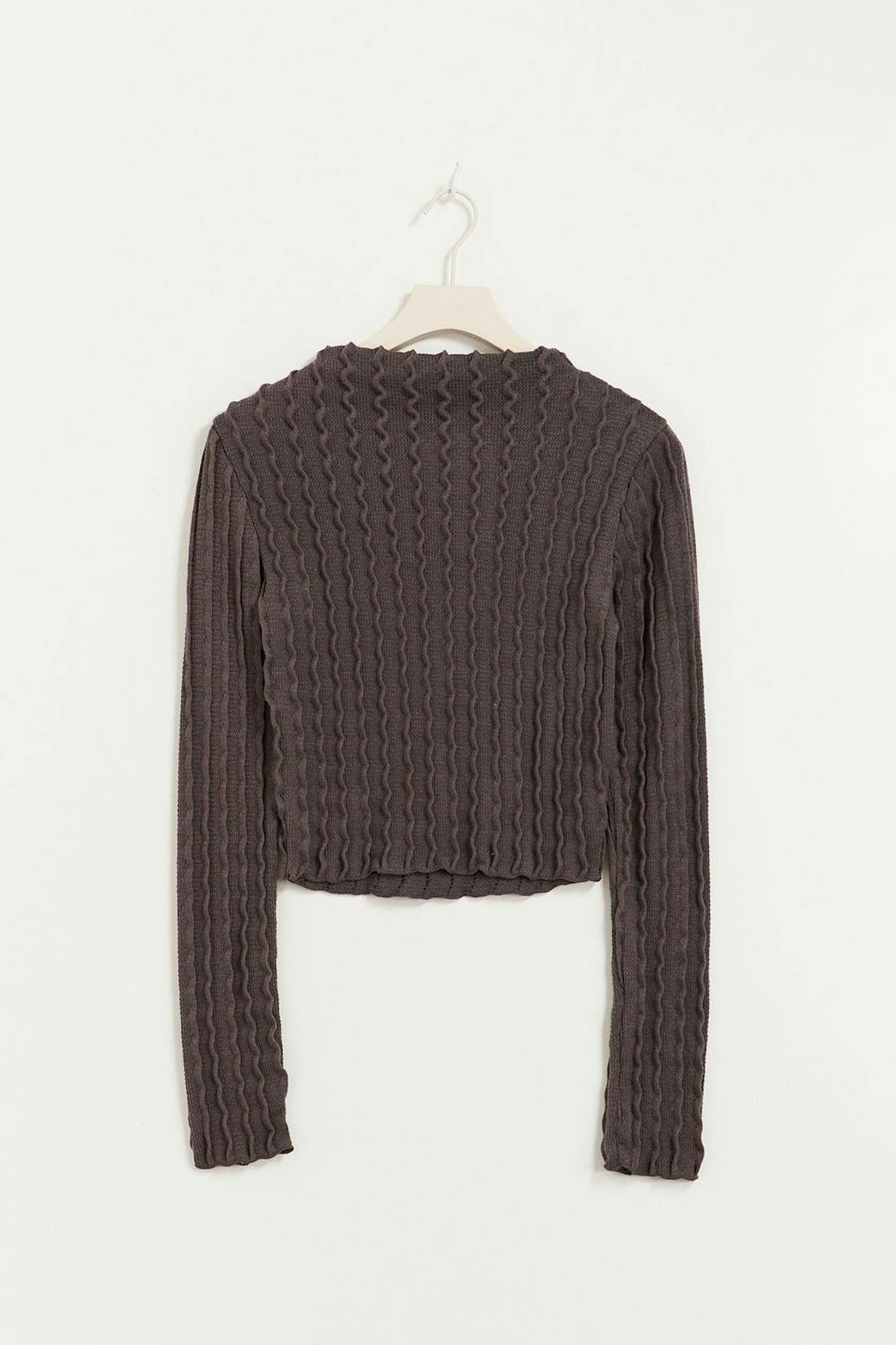 Texturerad topp med trattkrage. Toppen är grå och har figurnära passform. Den har lång ärm och croppad längd.