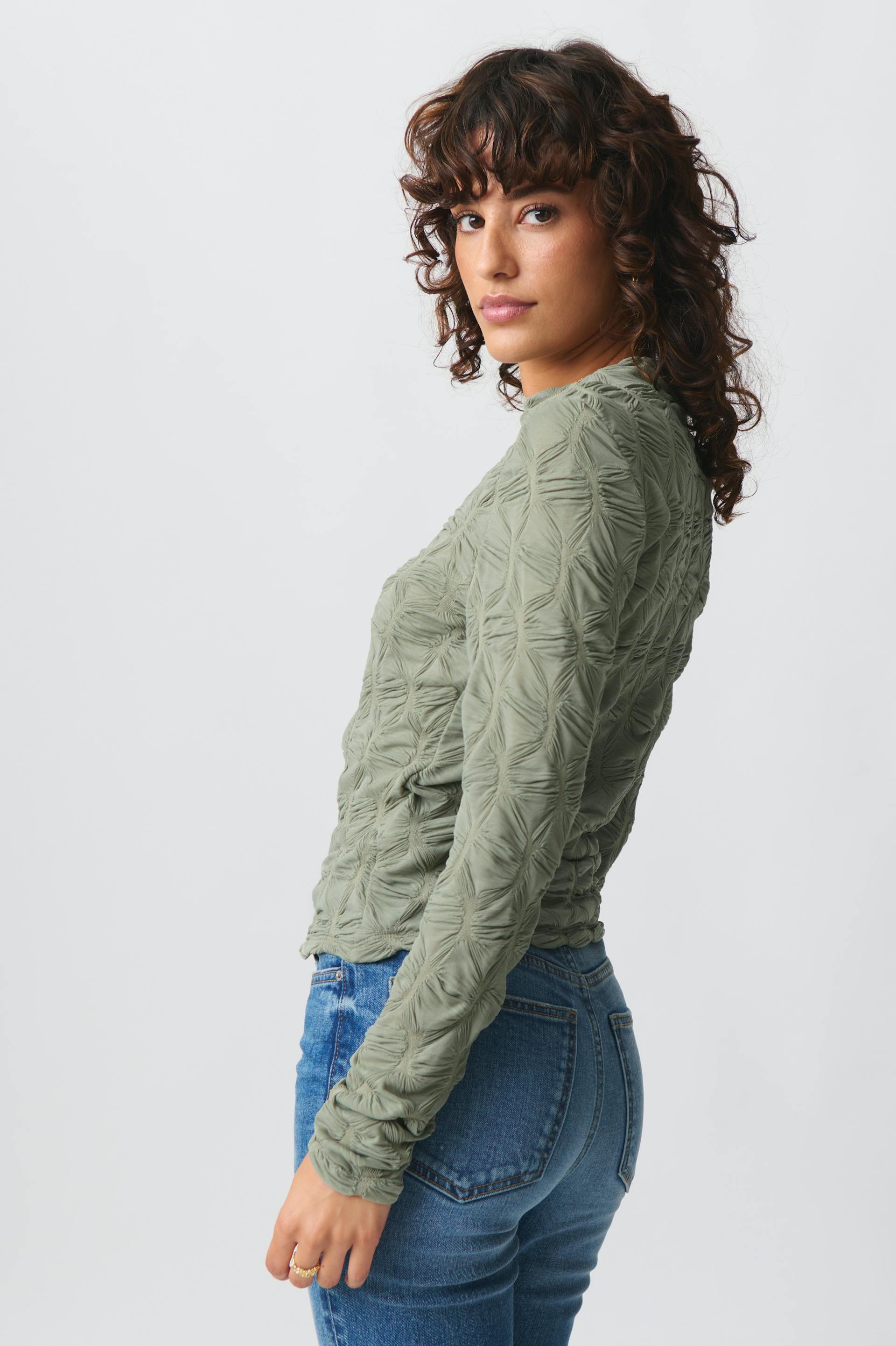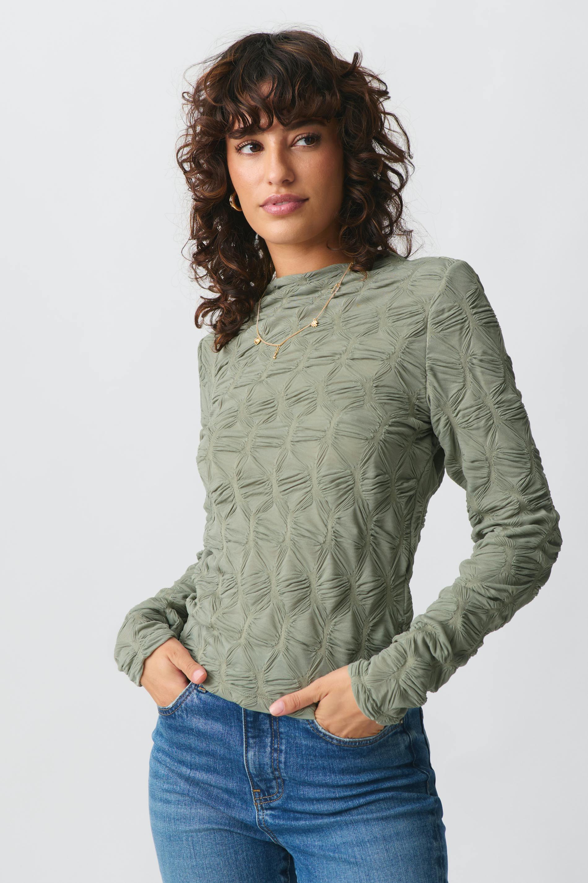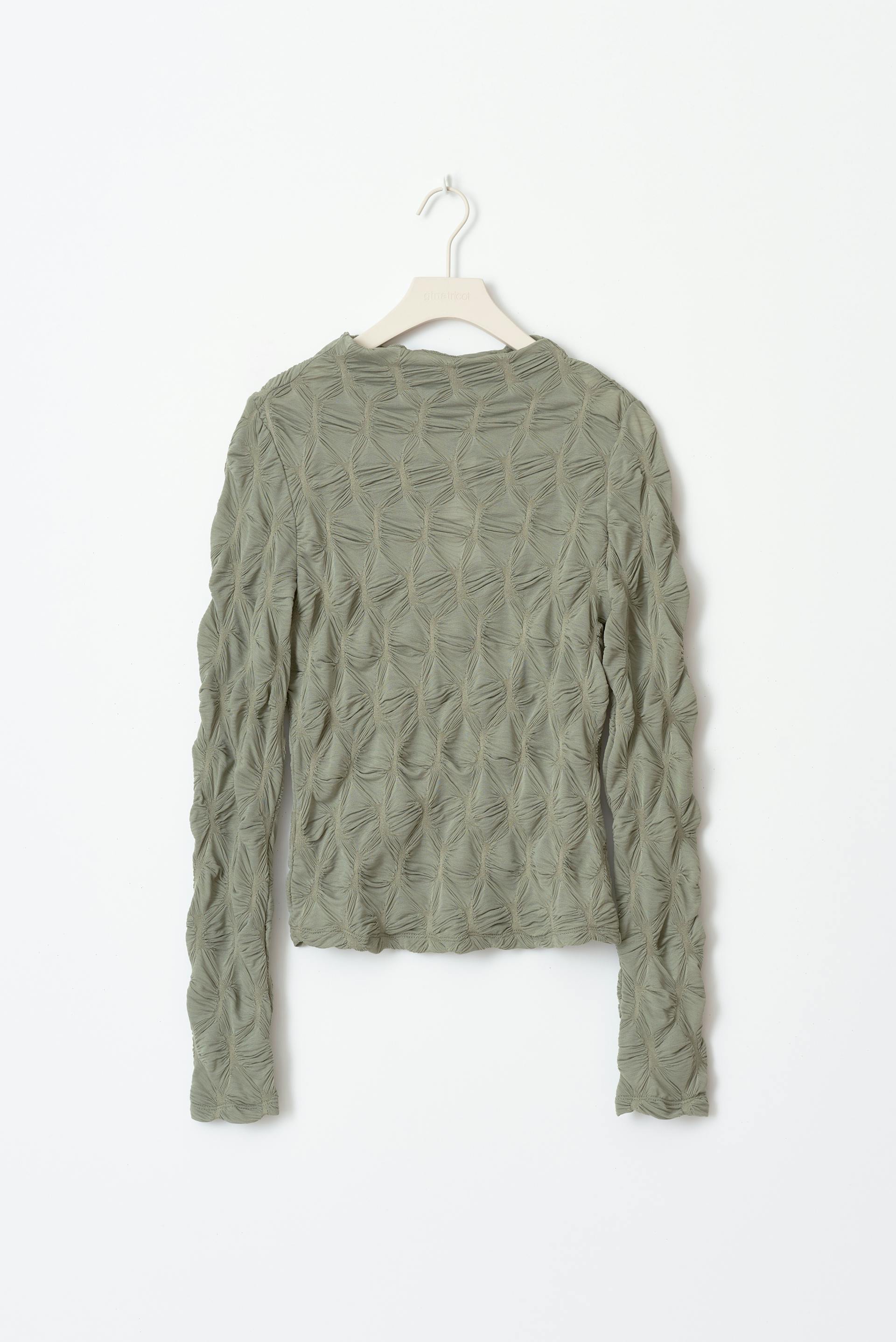 Strukturerad topp med trattkrage. Toppen är grön och har figurnära passform. Den har lång ärm och normallängd.