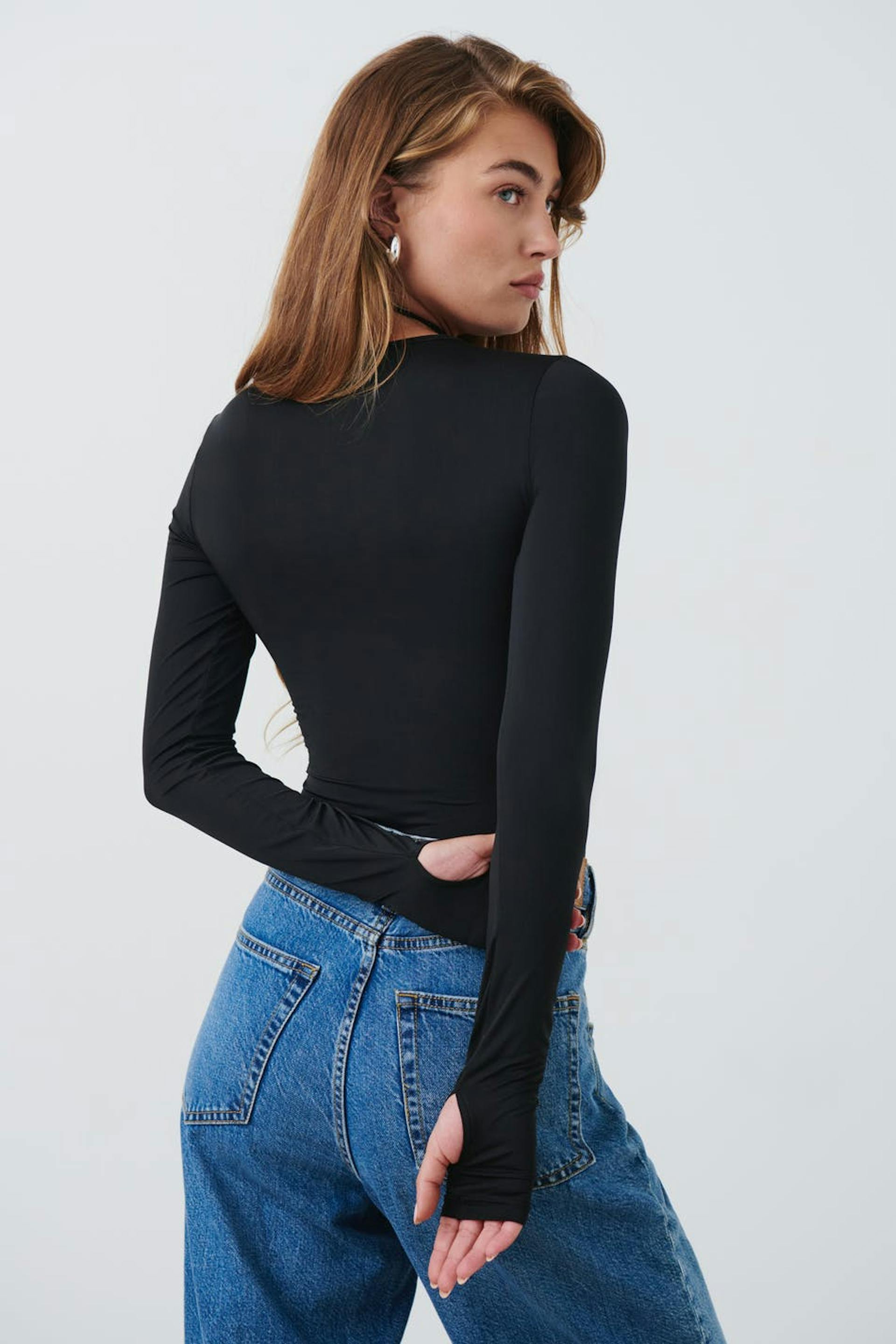 Långärmad topp i trikå med tumhål. Toppen är svart och har figurnära passform. Den har rund halsringning och stretchig kvalitet.
