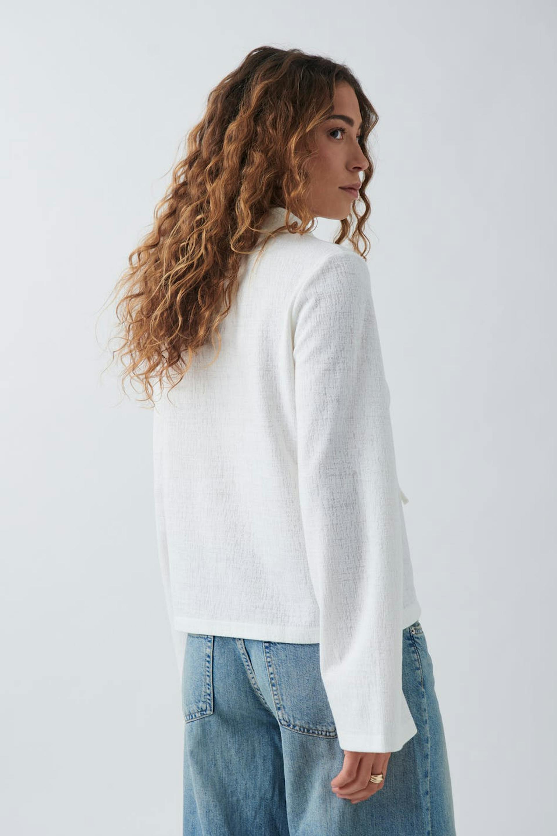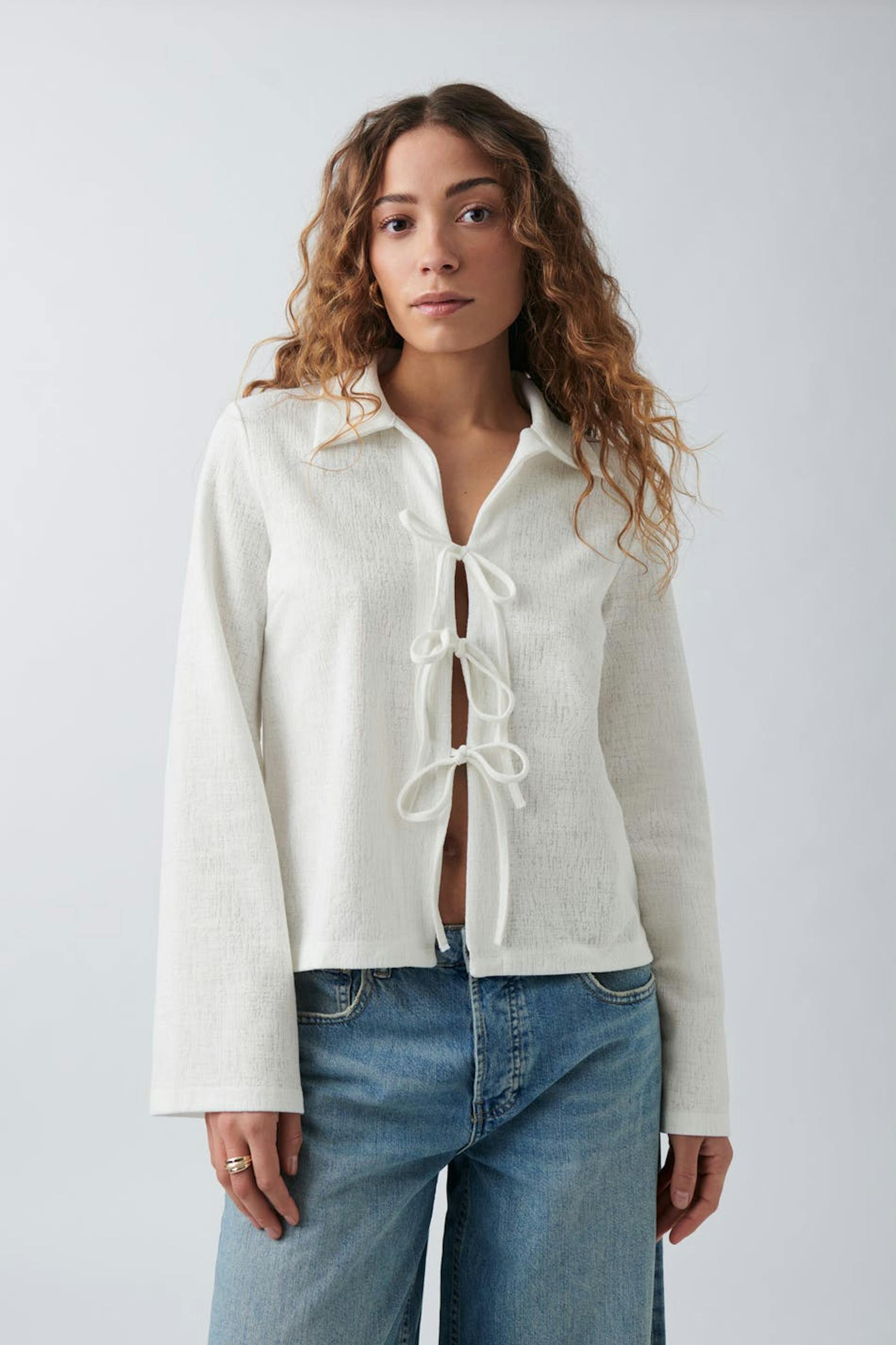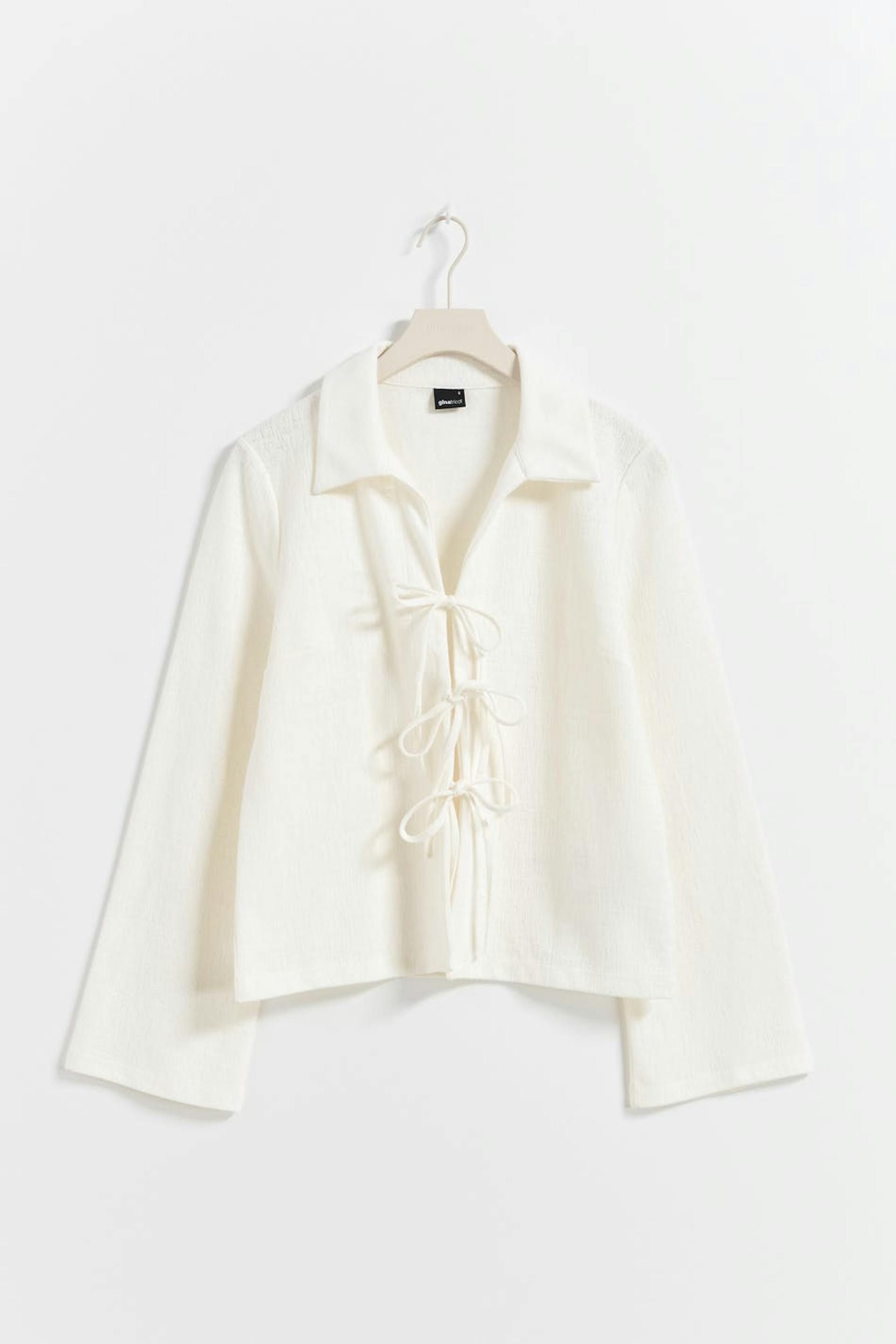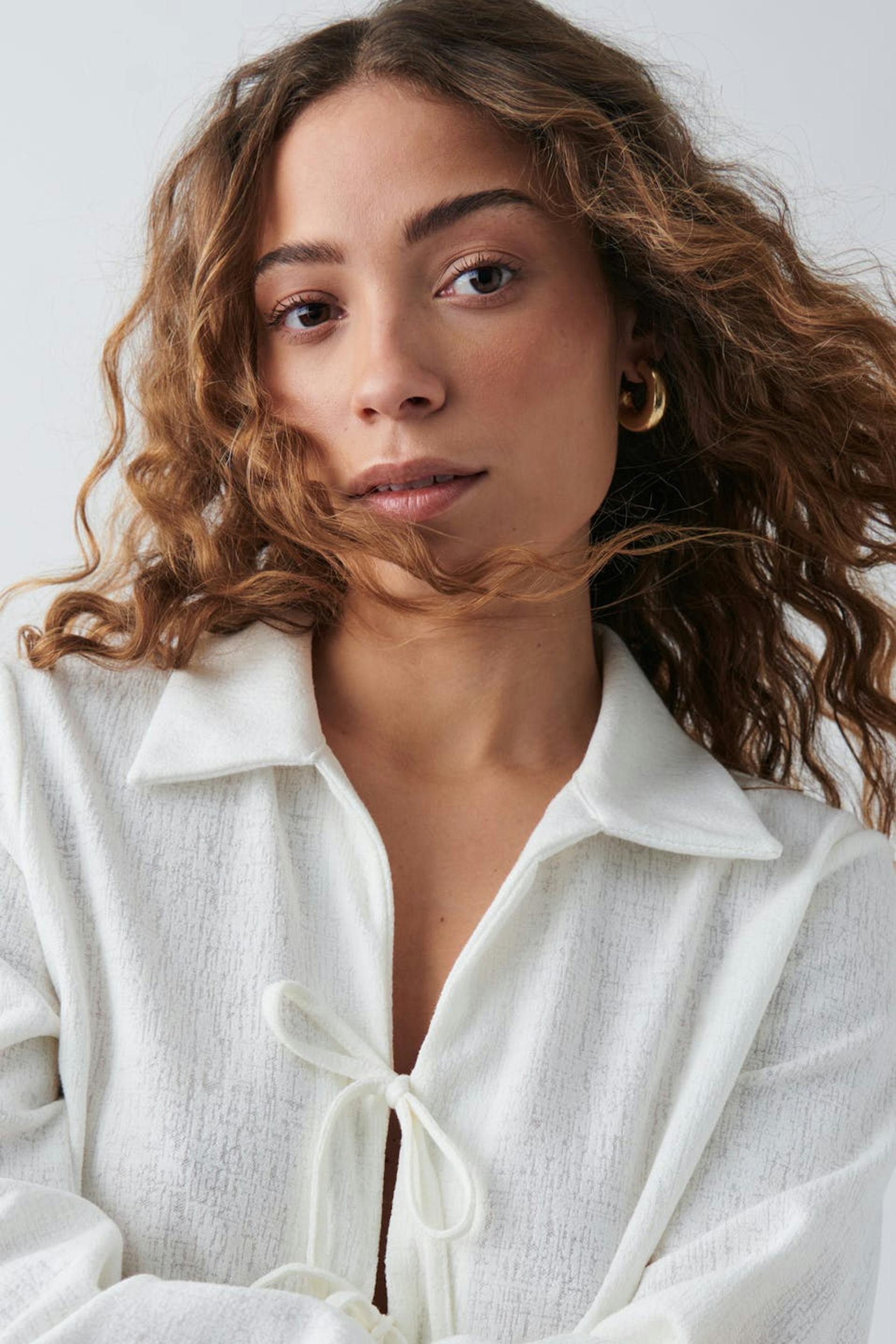 Långärmad knytblus i trikå med lös passform. Blusen är vit och har ett strukturerat material. Den har krage, normallängd och knytstängning framtill.