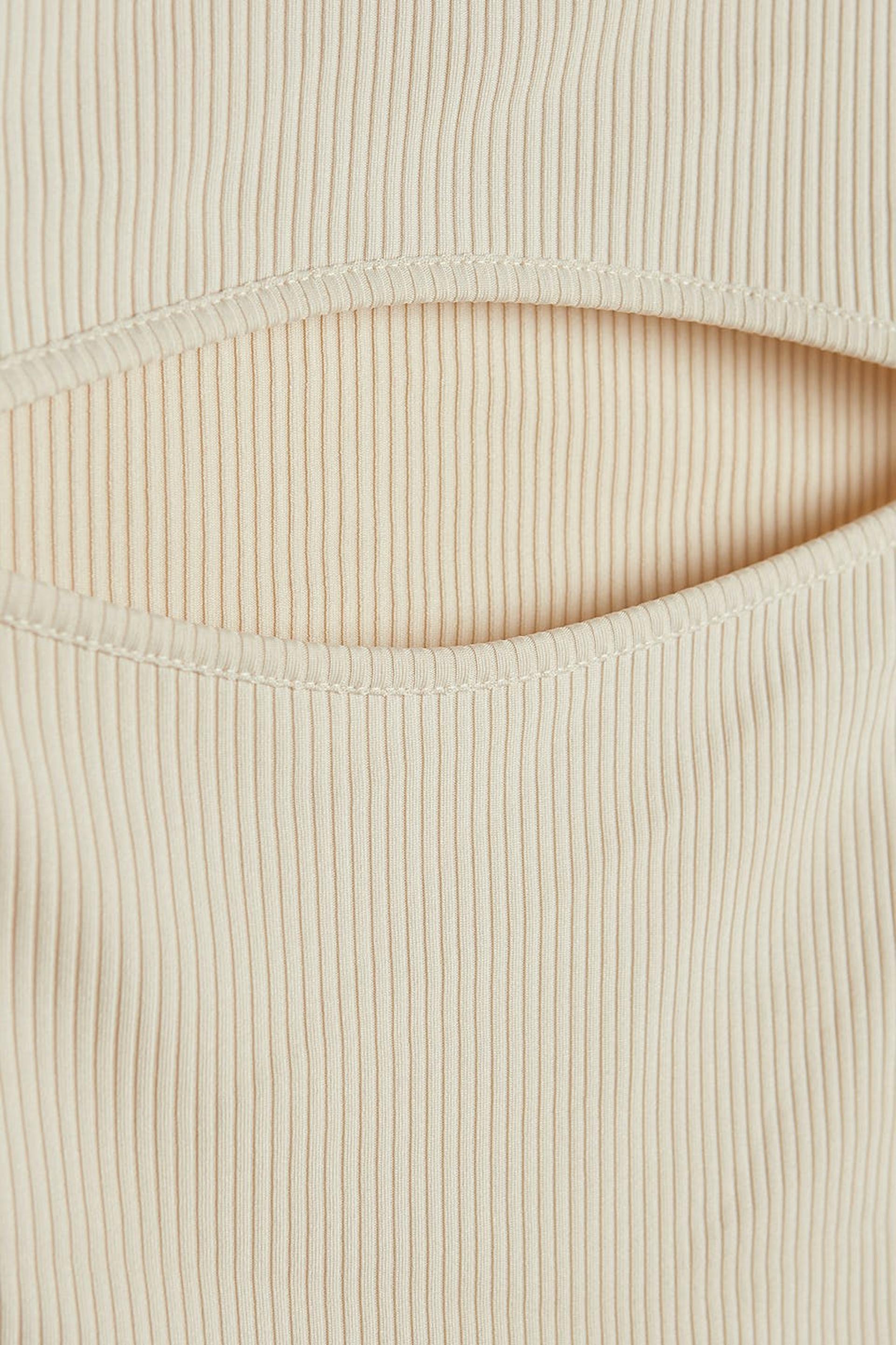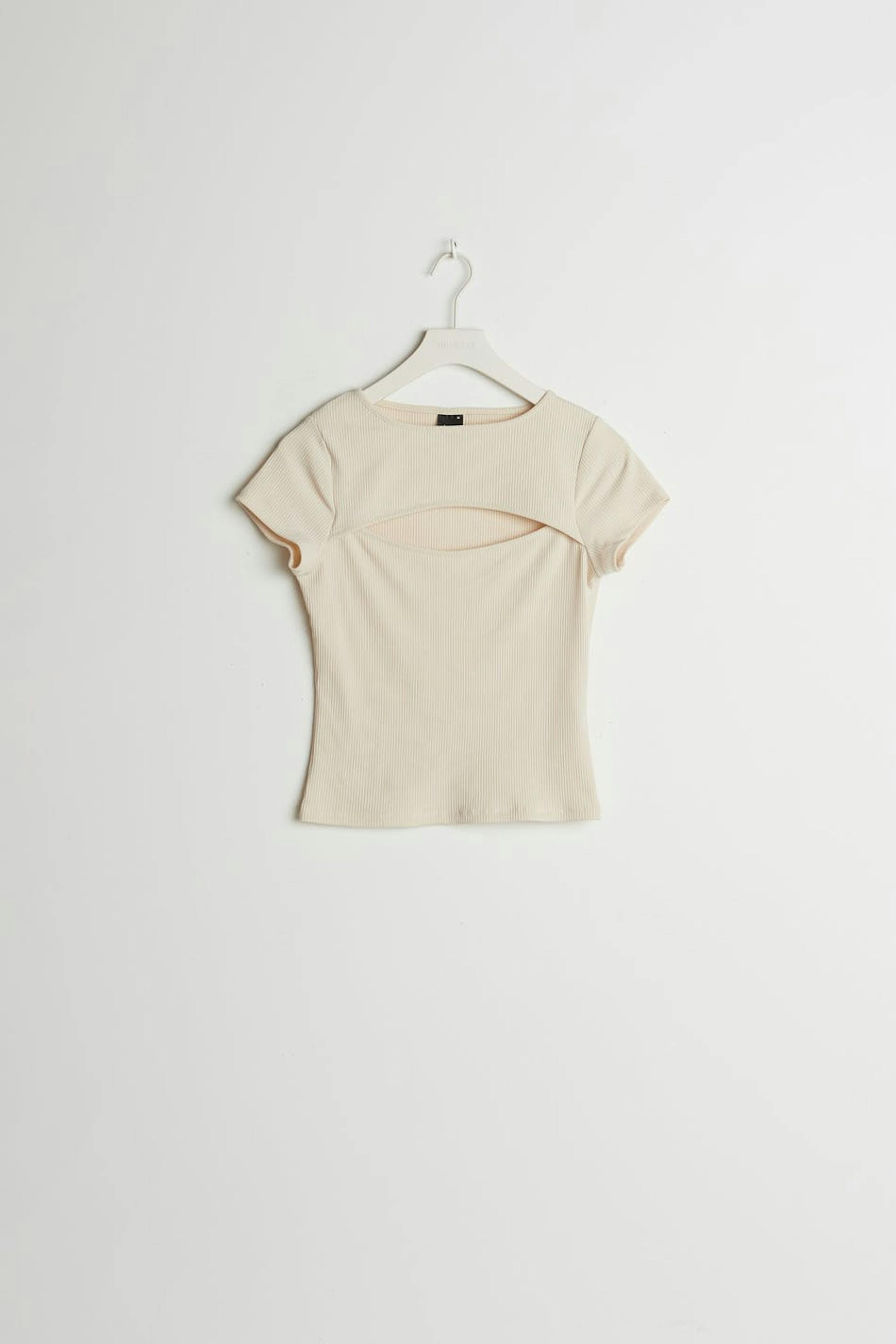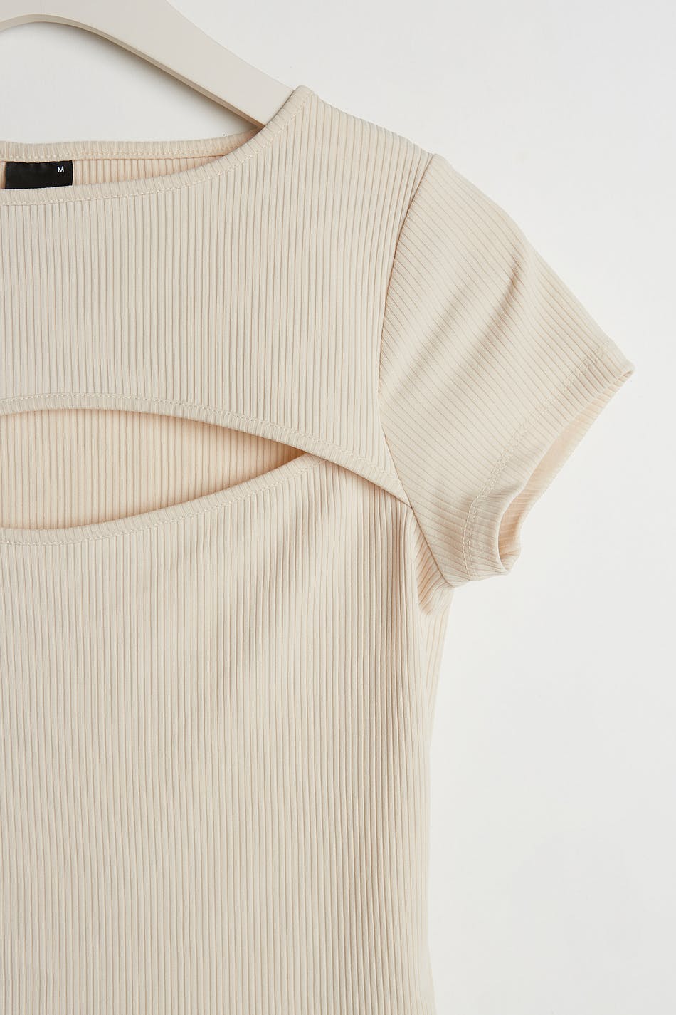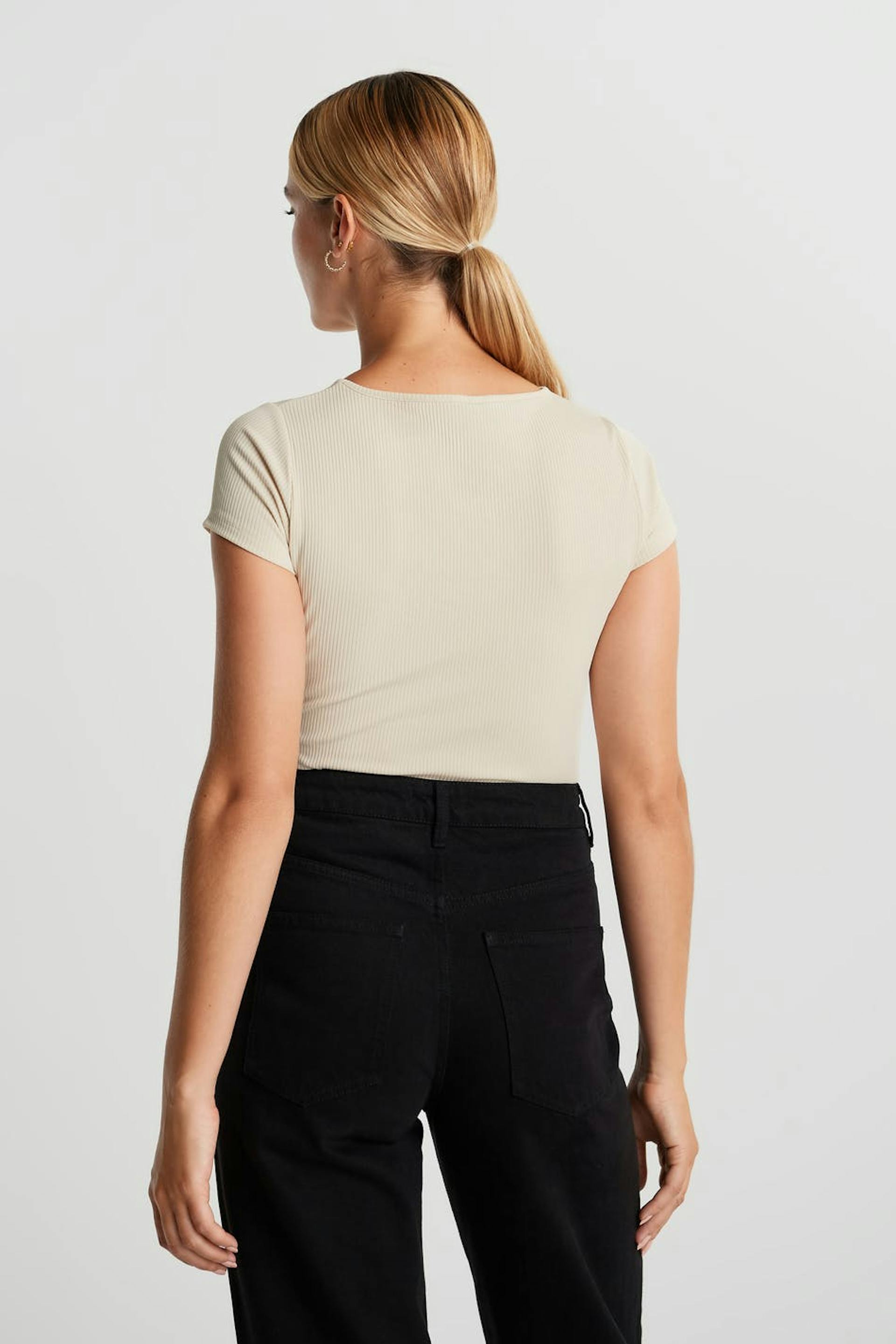 Kortärmad topp med en normal passform. Toppen är beige och har en utskärningsdetalj ovanför bröstet.