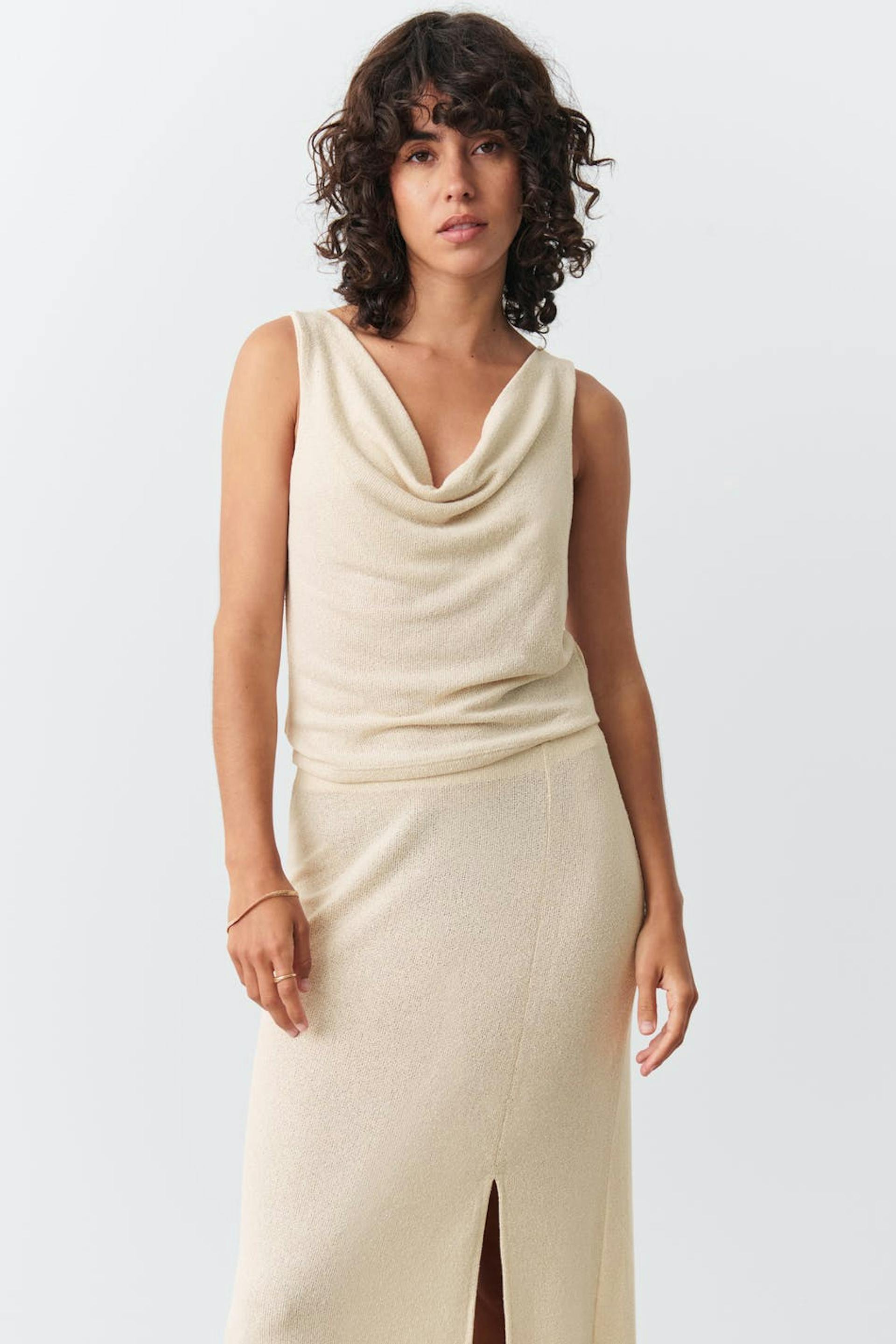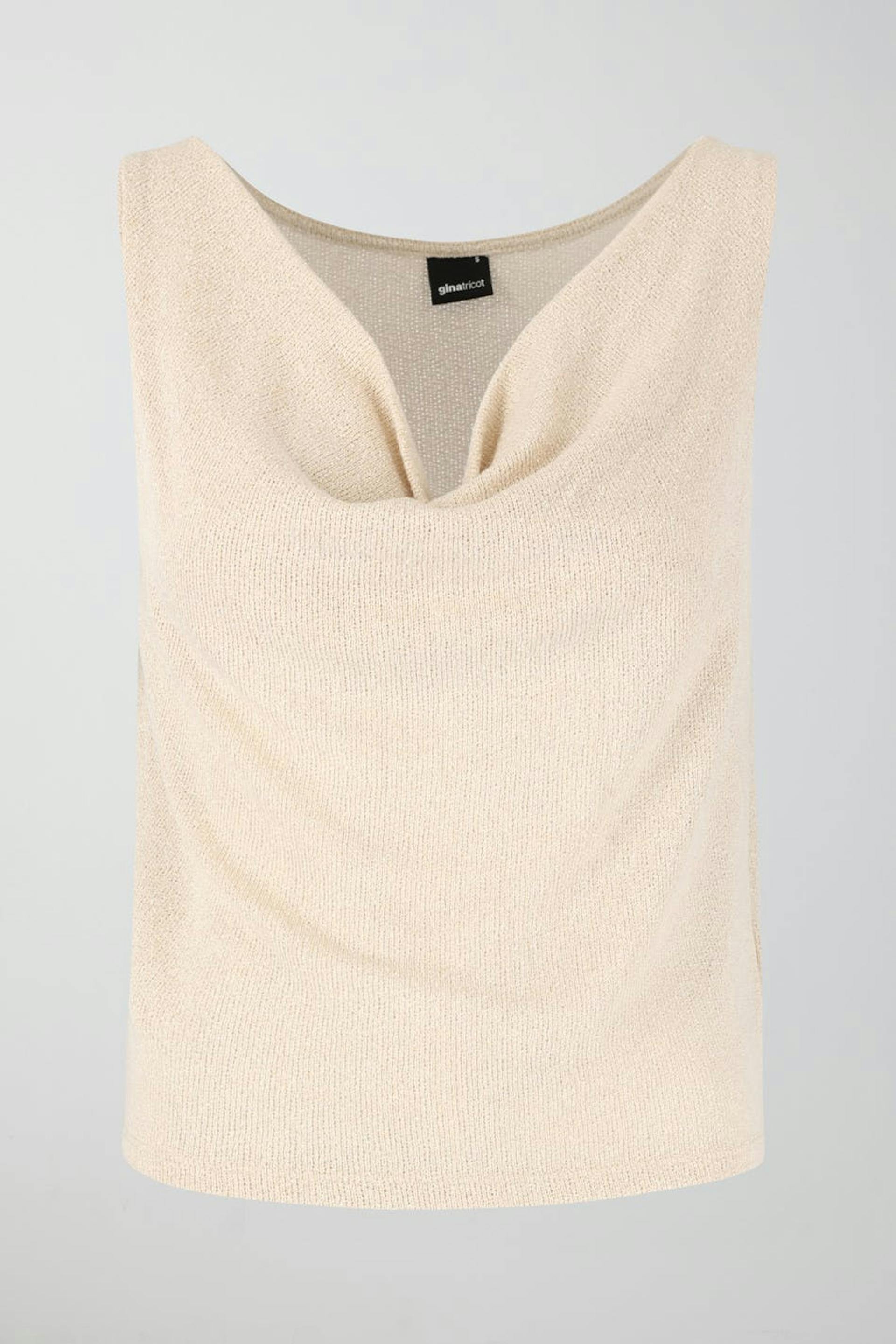 Stickat linne med draperad halsringning. Linnet är beige och har normal passform.