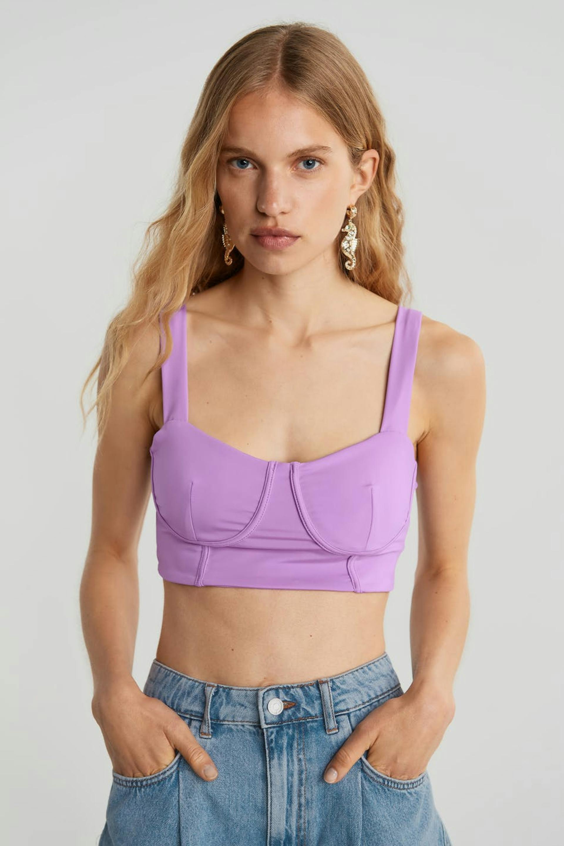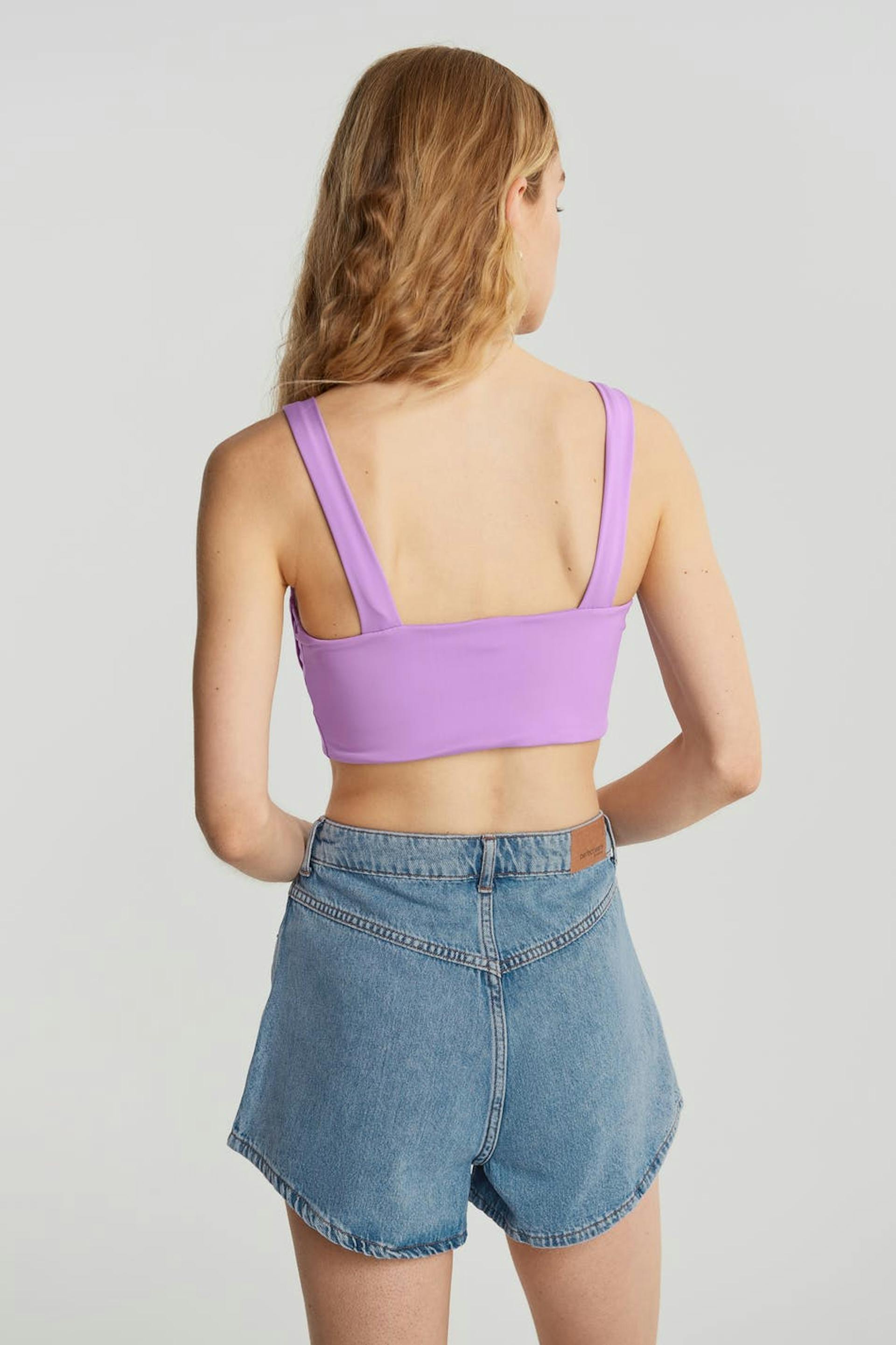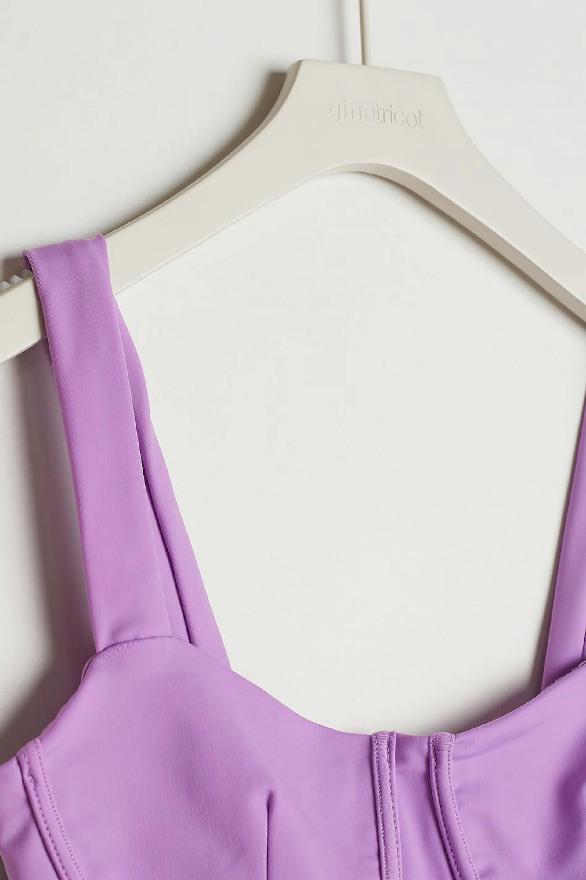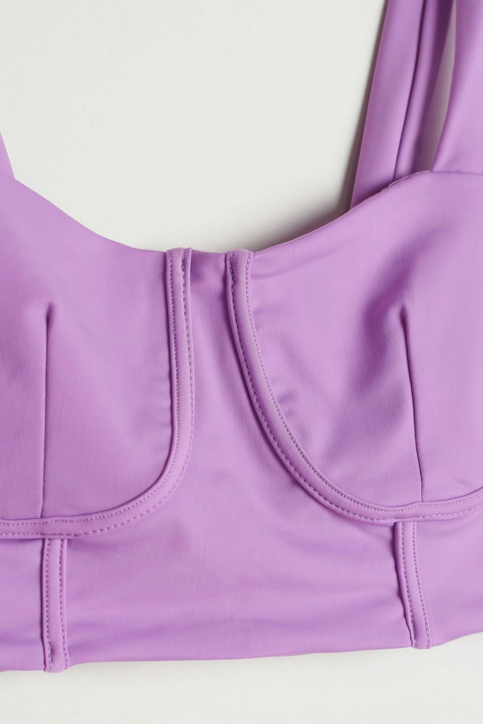 Croppad topp med markerade kupor med en bygel under bysten. Toppen är lila och ärmlös.