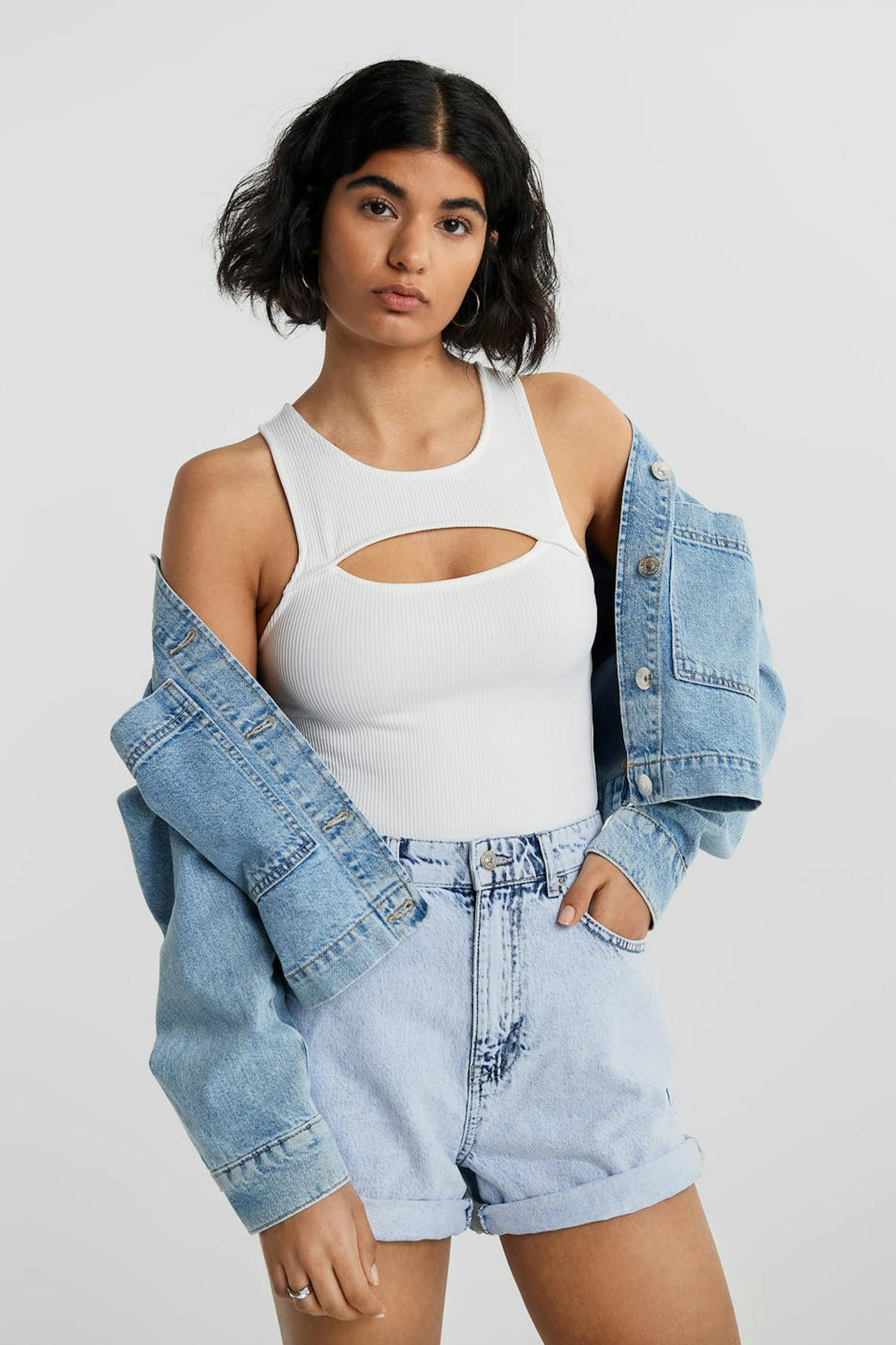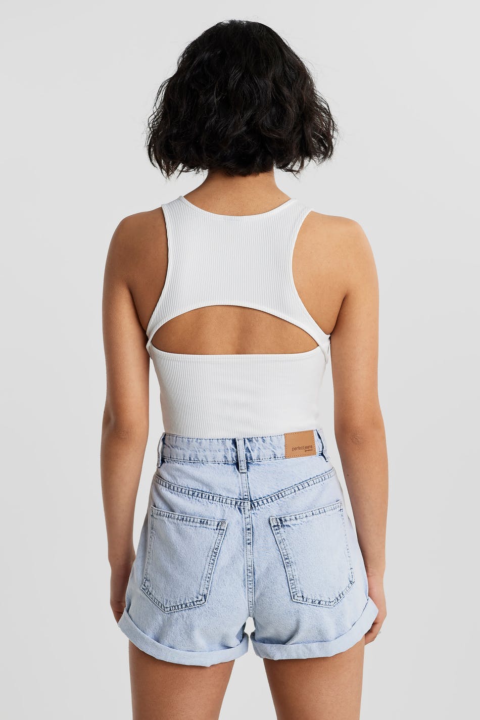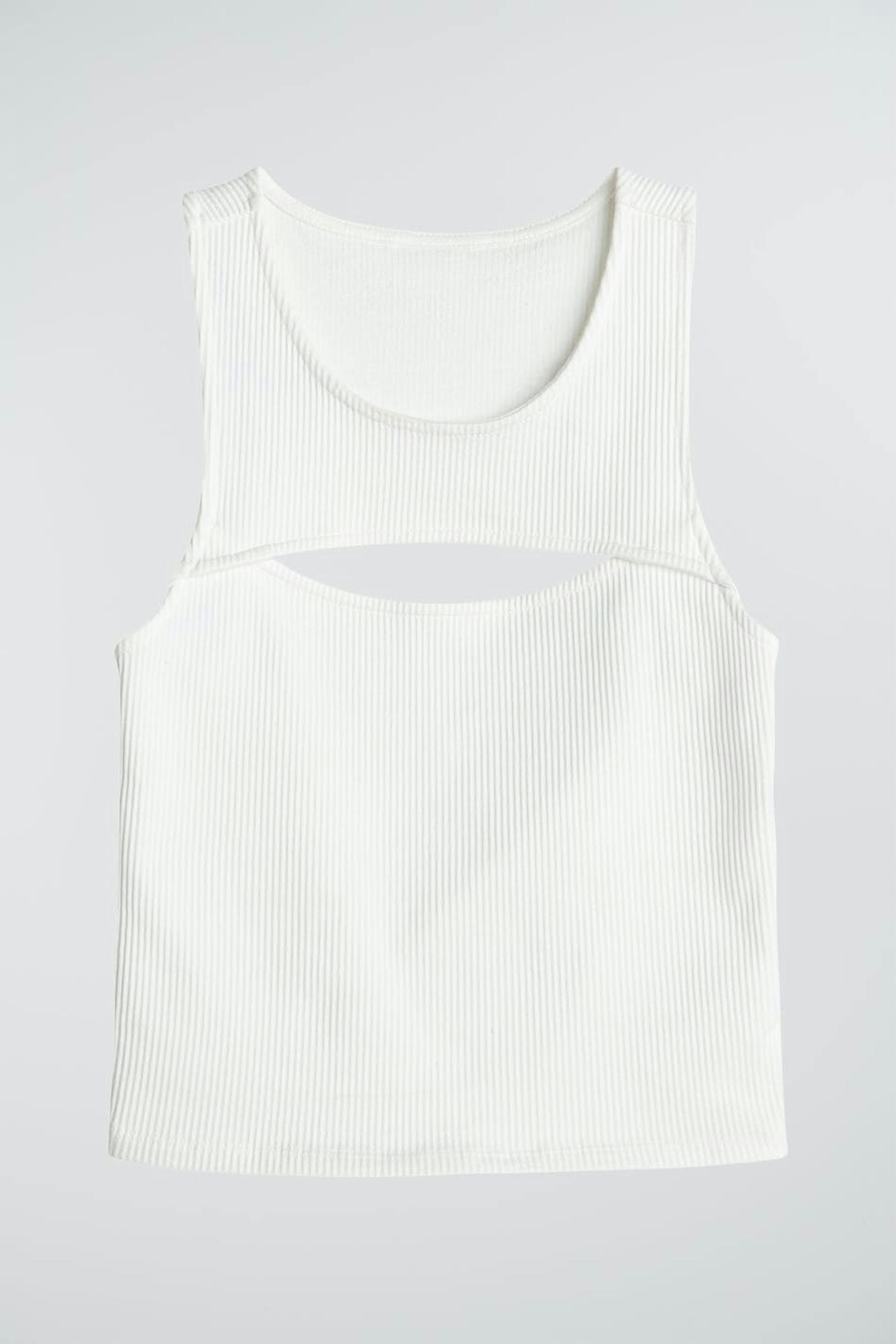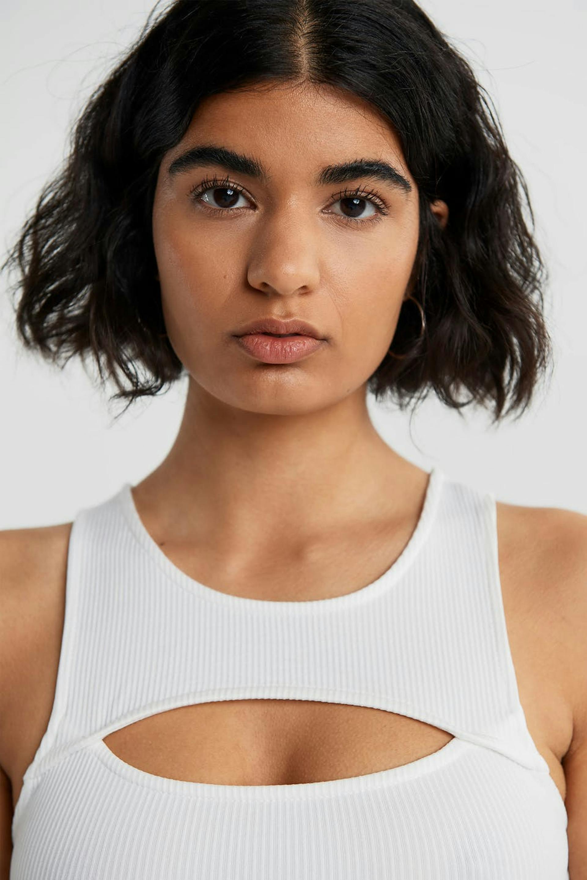Ribbat linne med en figurnära passform. Toppen är vit och har cut out på framsidan och på baksidan.