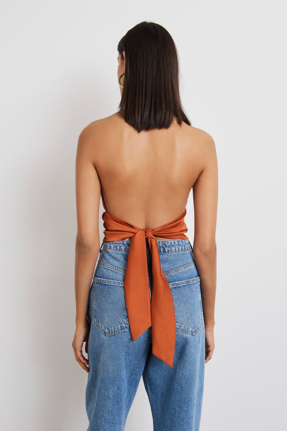 Ärmlös topp med en halterneckdesign. Toppen är perfekt för festen, orange och croppad. Den har ett strukturerat material i satin, en figurnära passform, en knytning i ryggen, rynkningar i midjan och en öppning framtill.