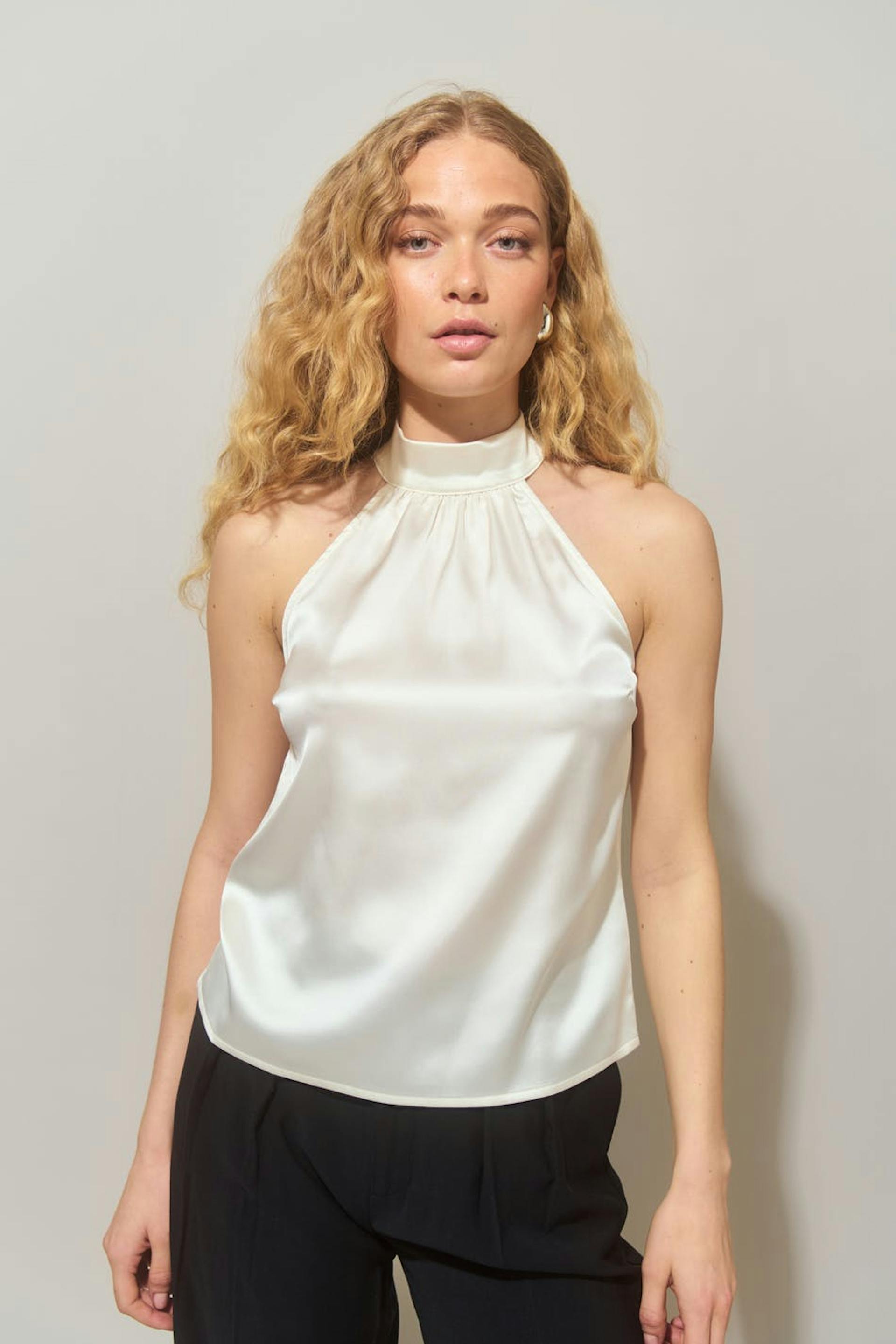 Ärmlös topp i satin med halterneckdesign. Toppen är vit och har öppning bak. Den har lös passform och knäppning i nacken.