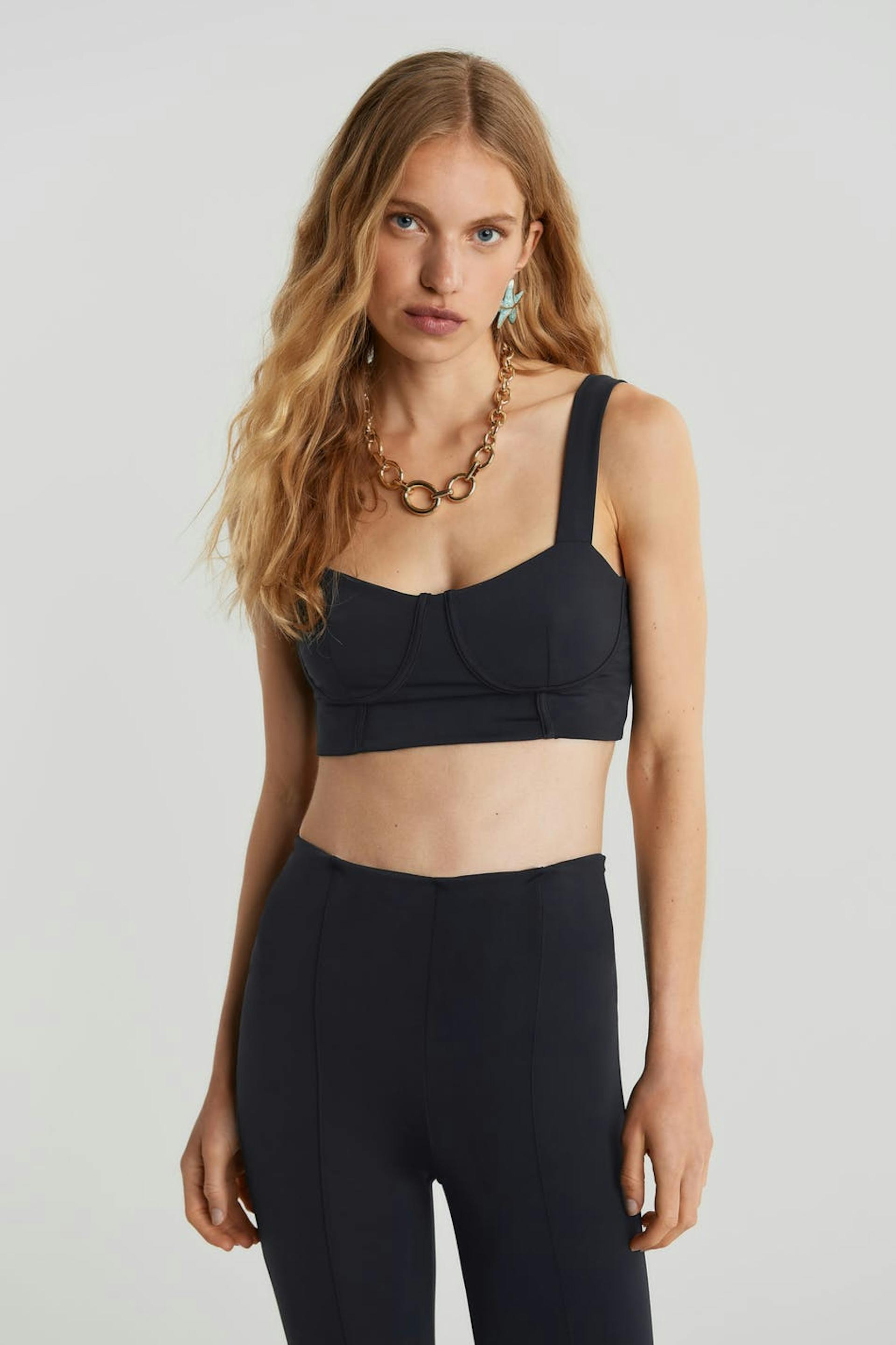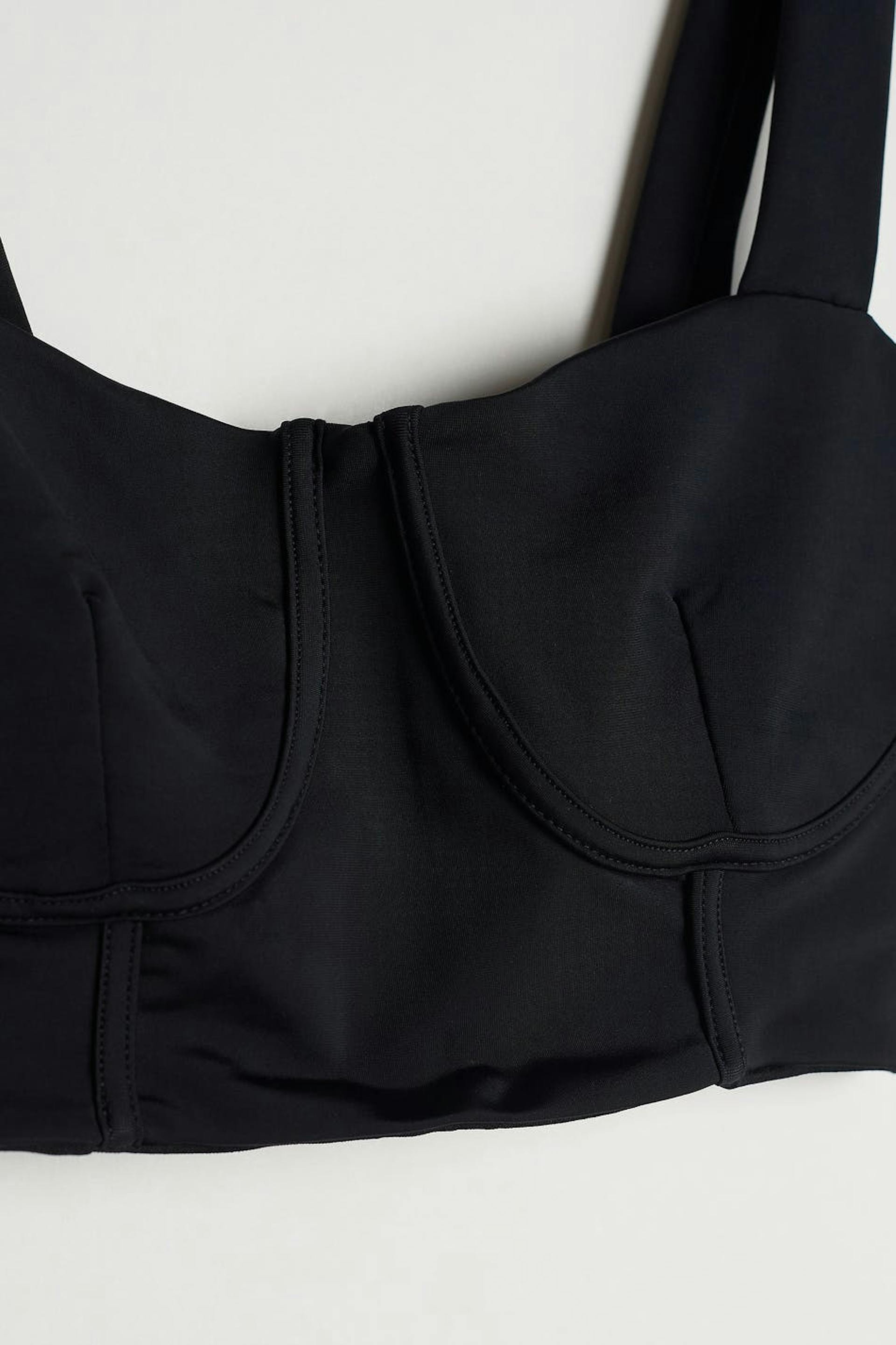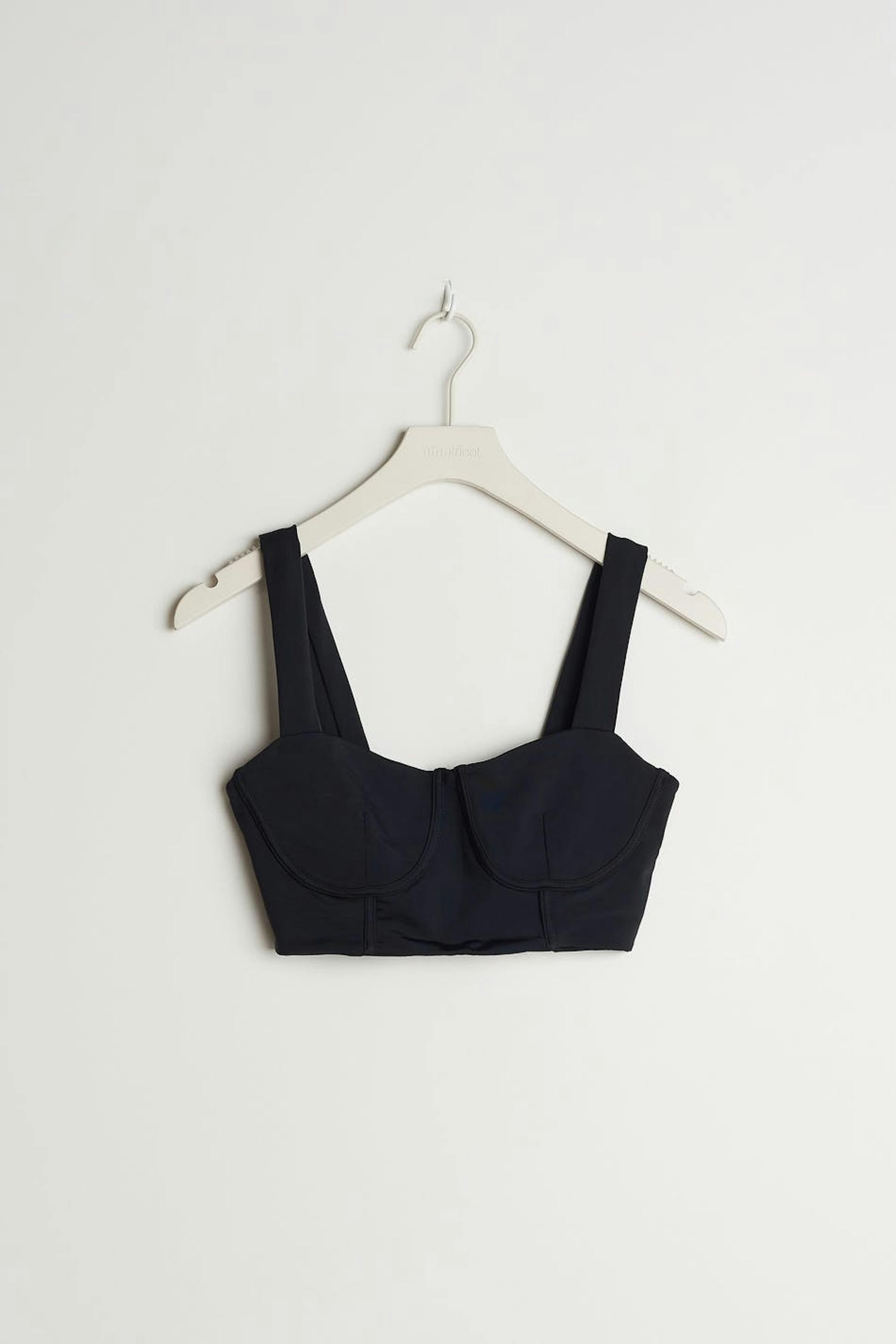 Croppad topp med markerade kupor med en bygel under bysten. Toppen är svart och ärmlös.