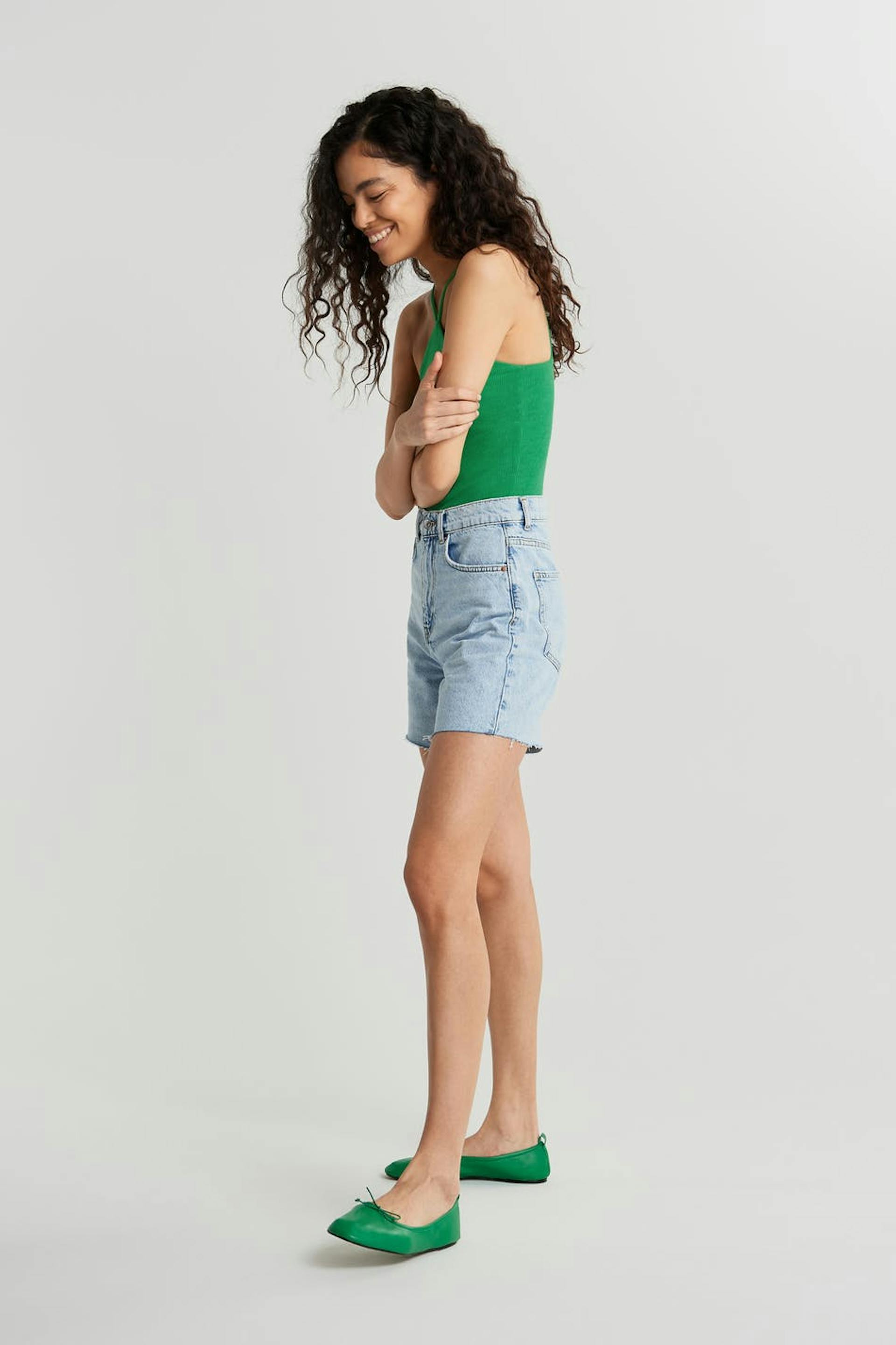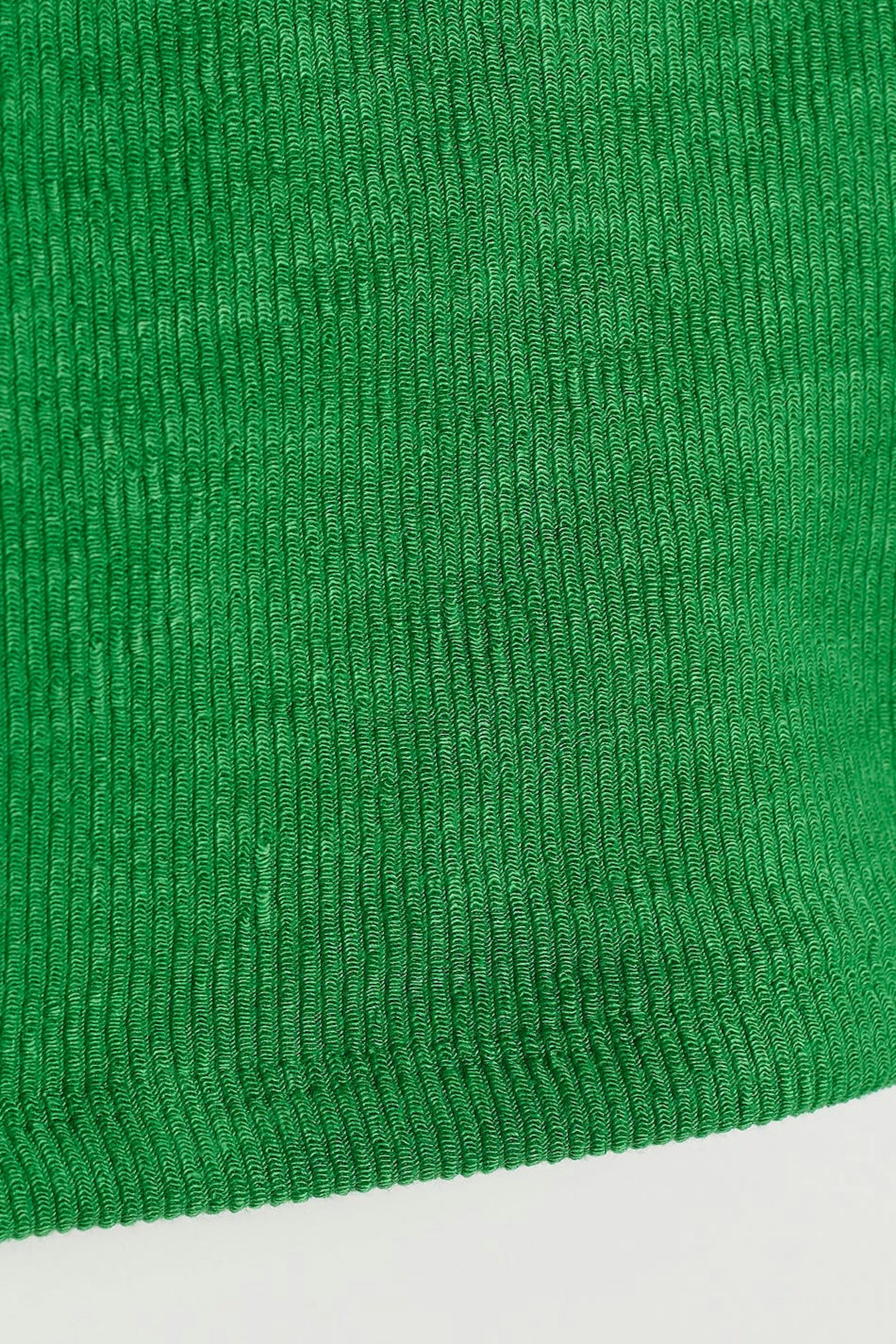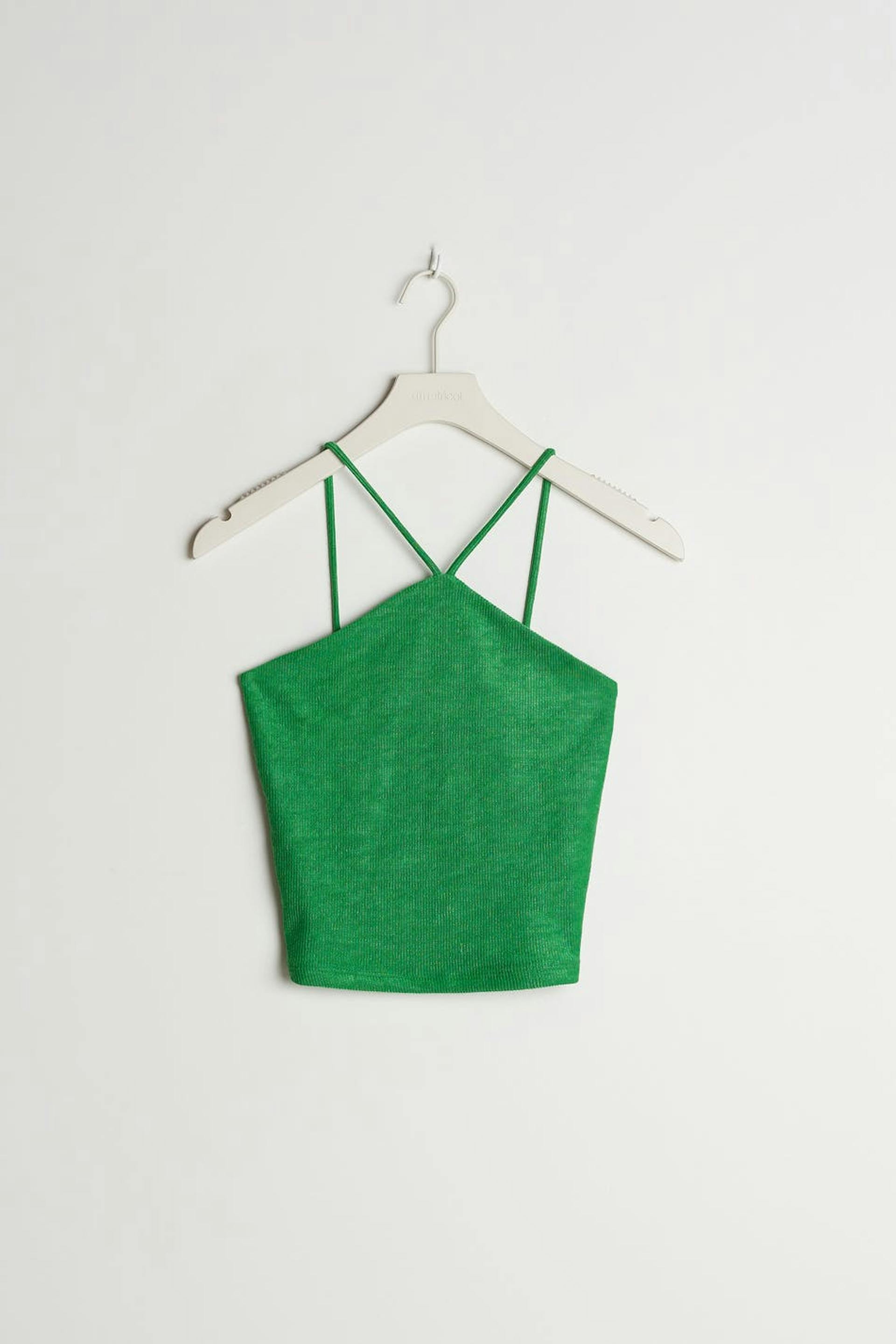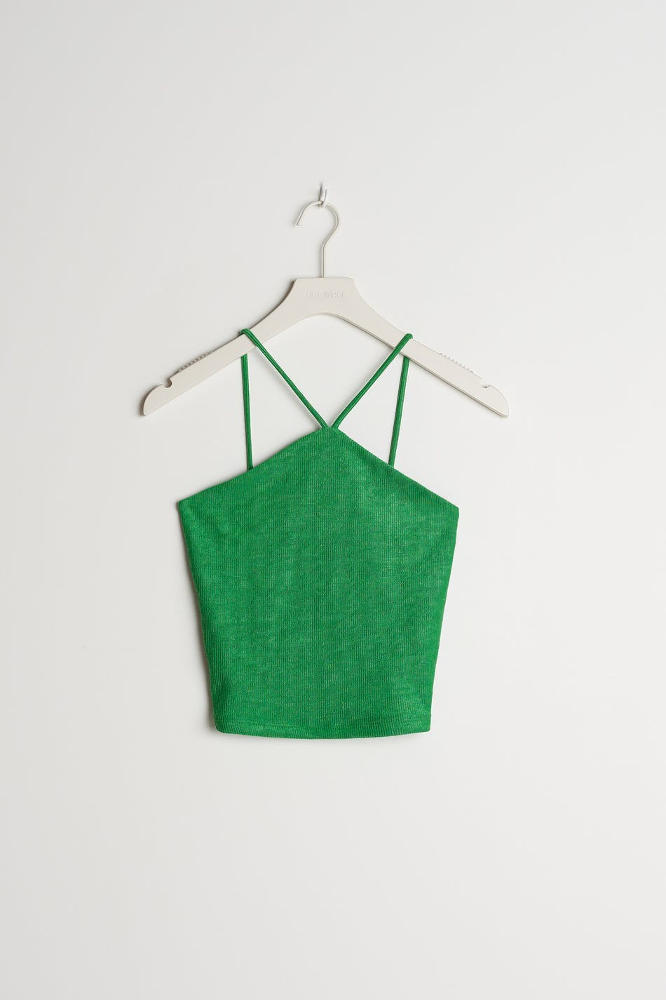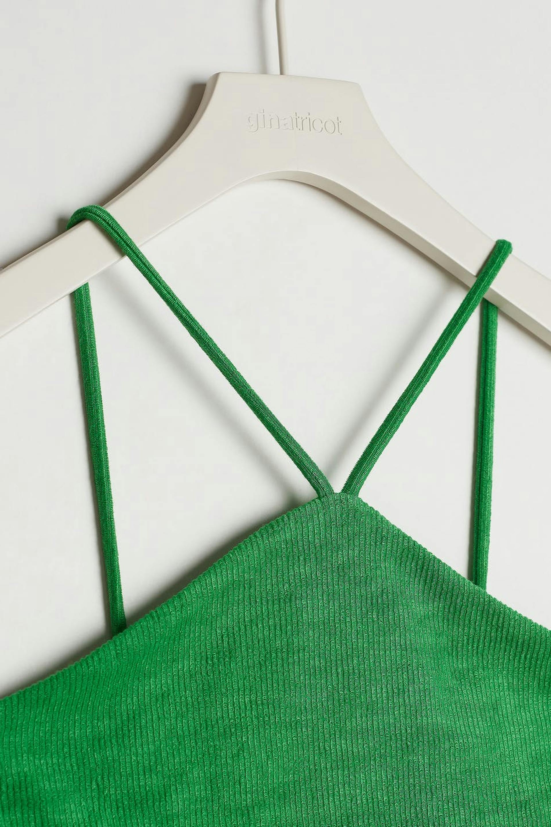 Kort linne med en figurnära passform. Linnet är grön och ribbad och har en spetsig halsringning. Den har tunna axelband.