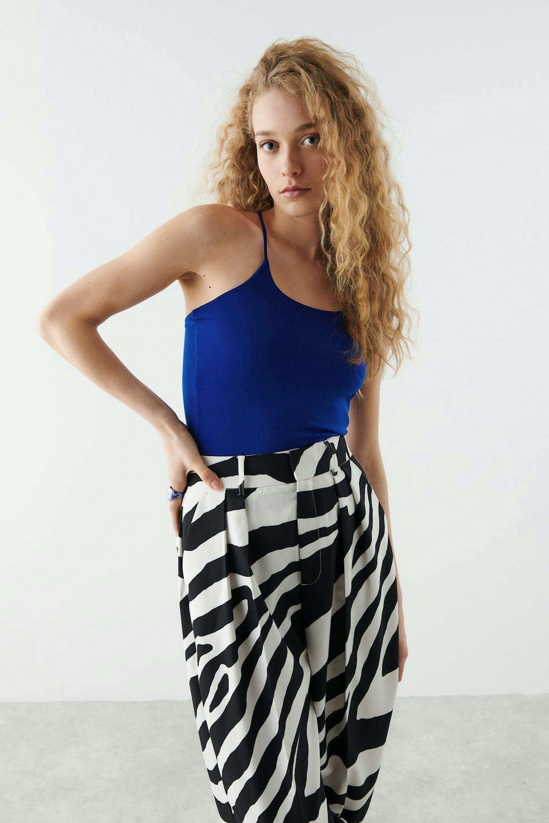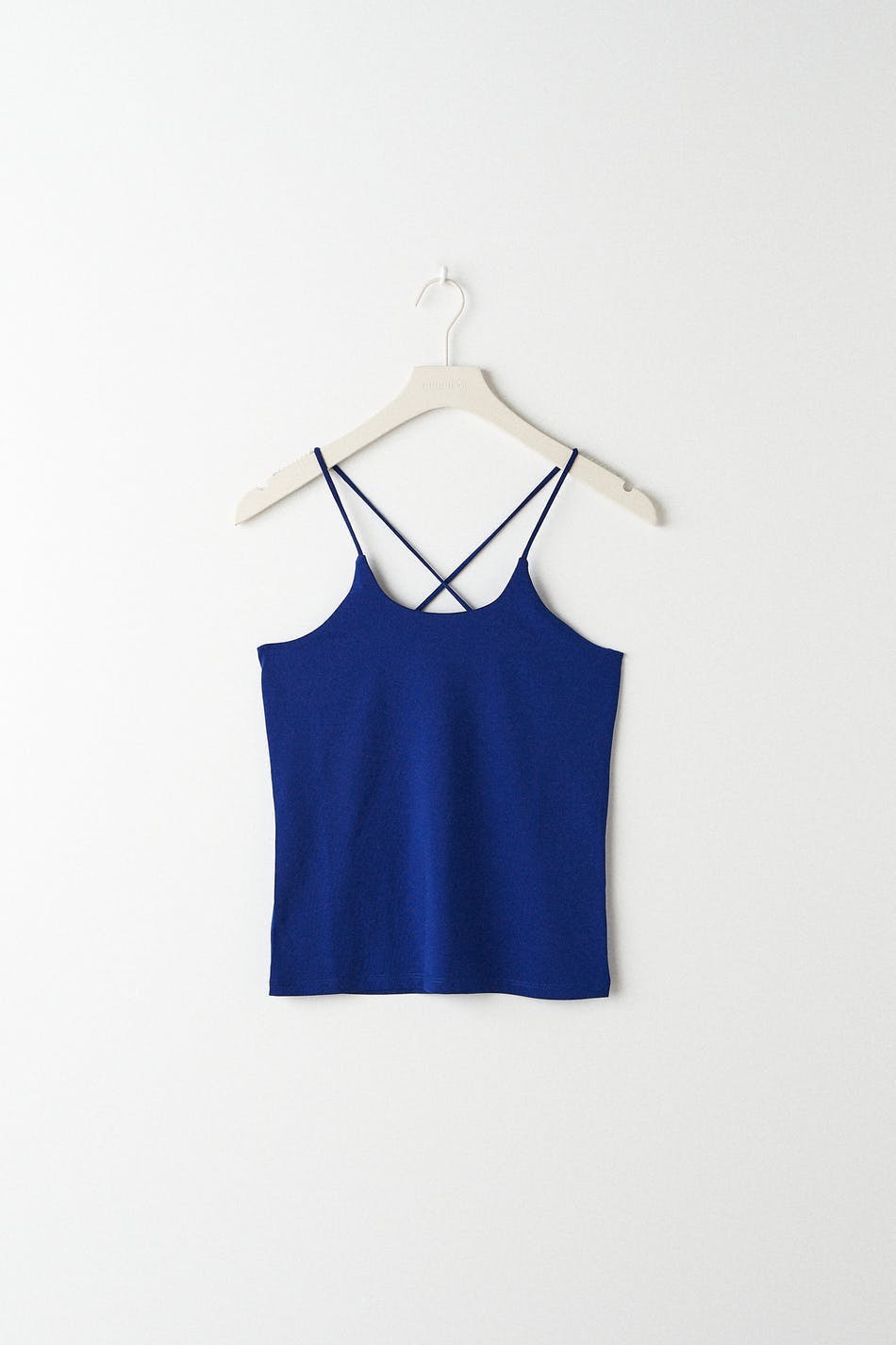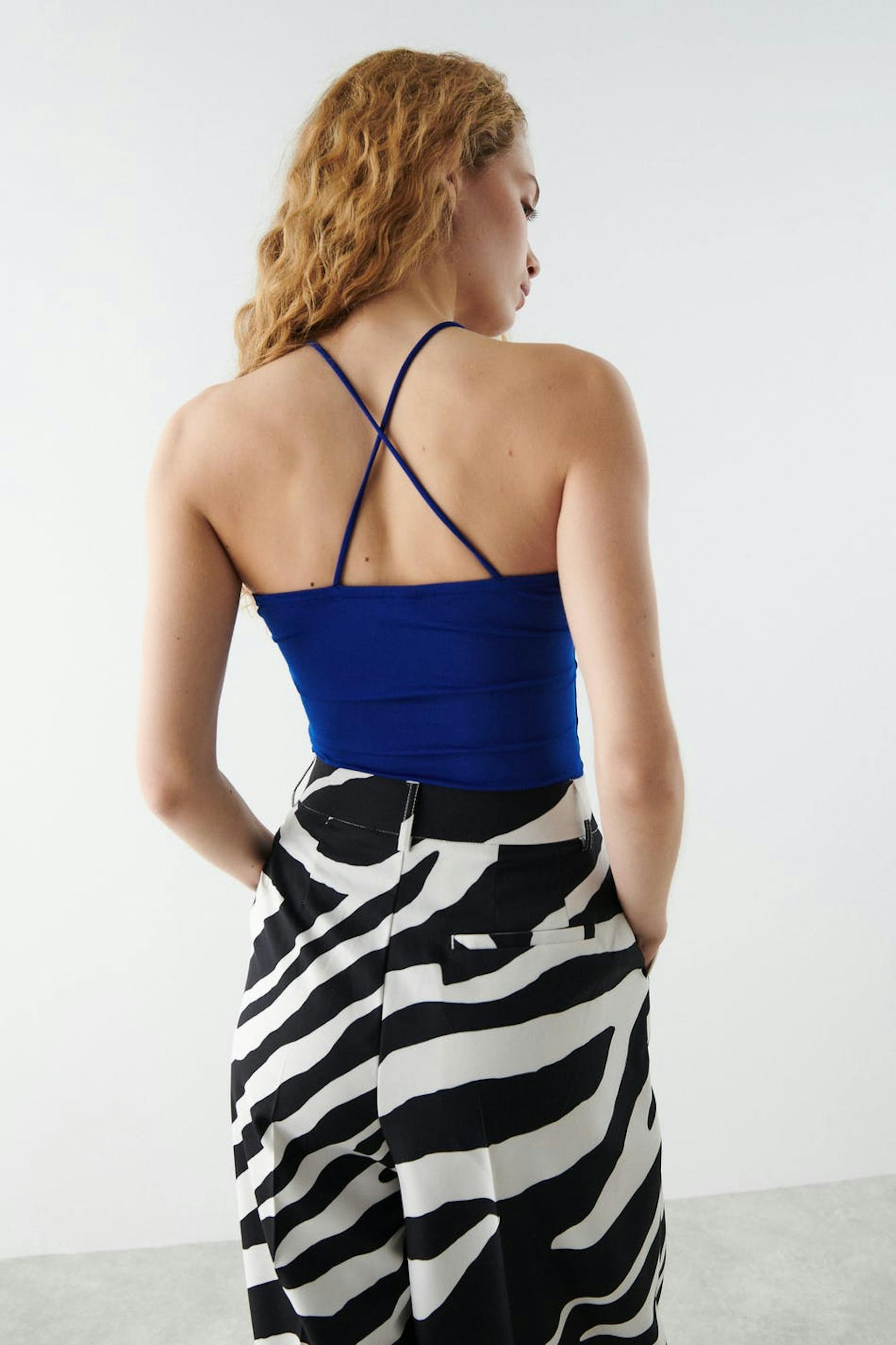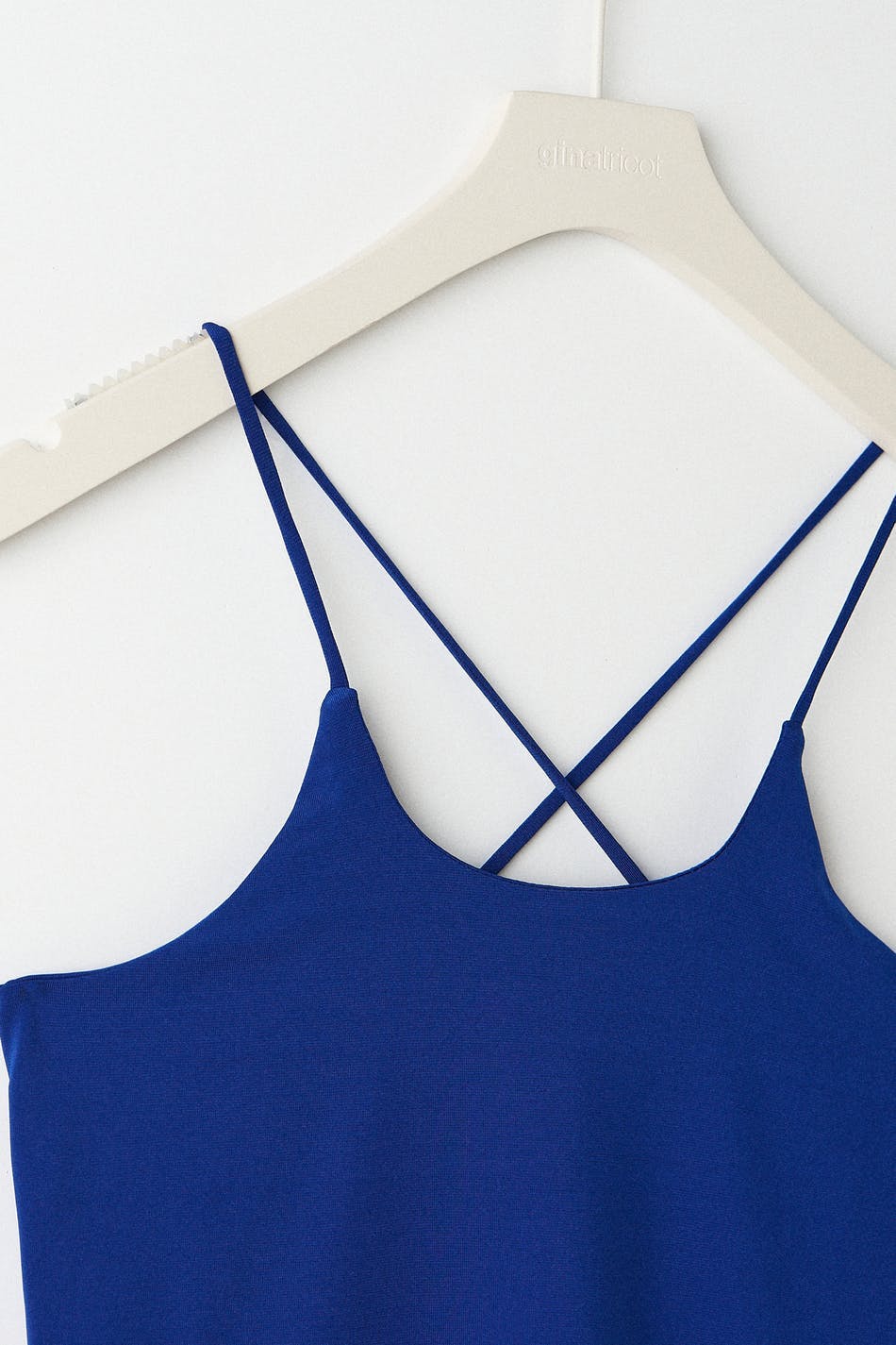 Linne med halterneckdesign. Linnet är blått och har korsade axelband framtill. Det har en figurnära passform.