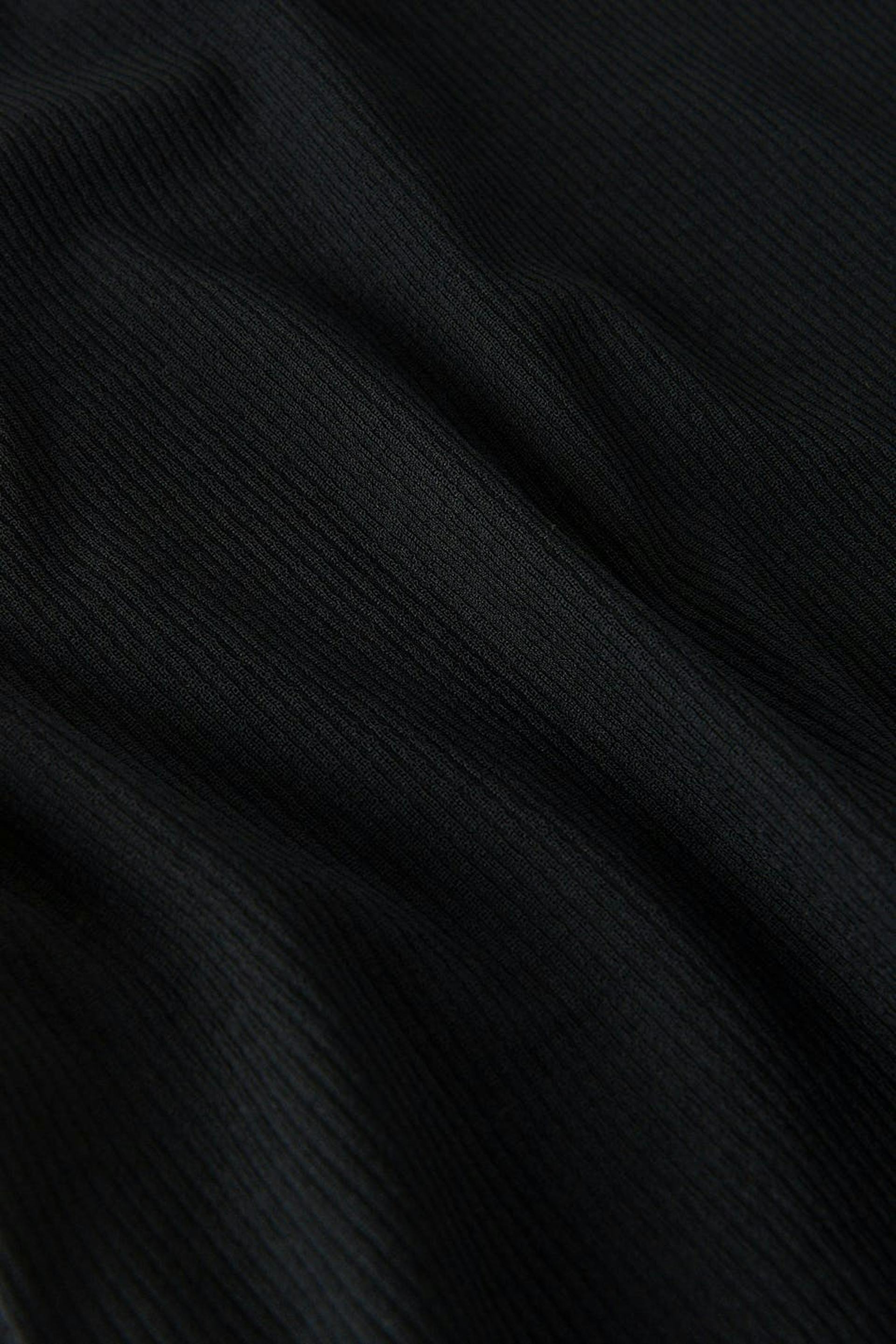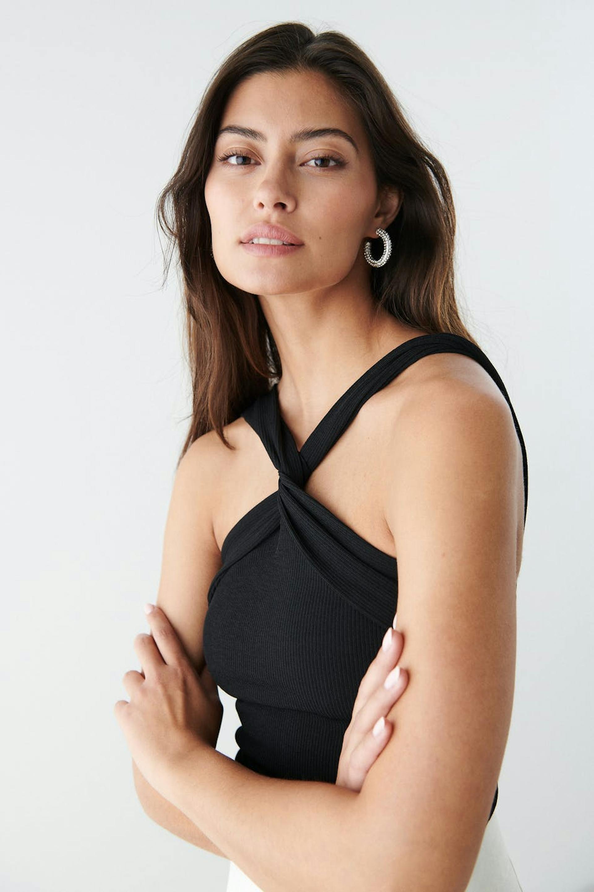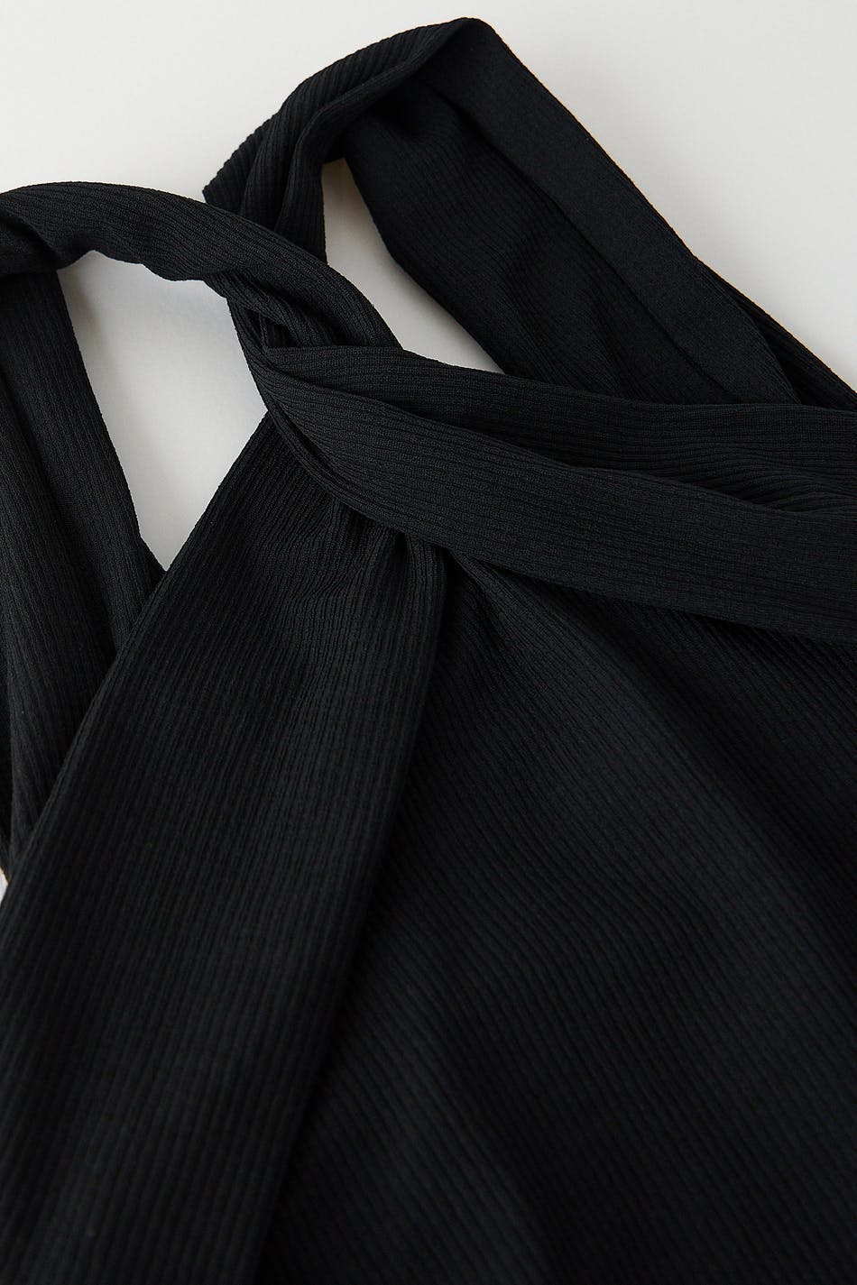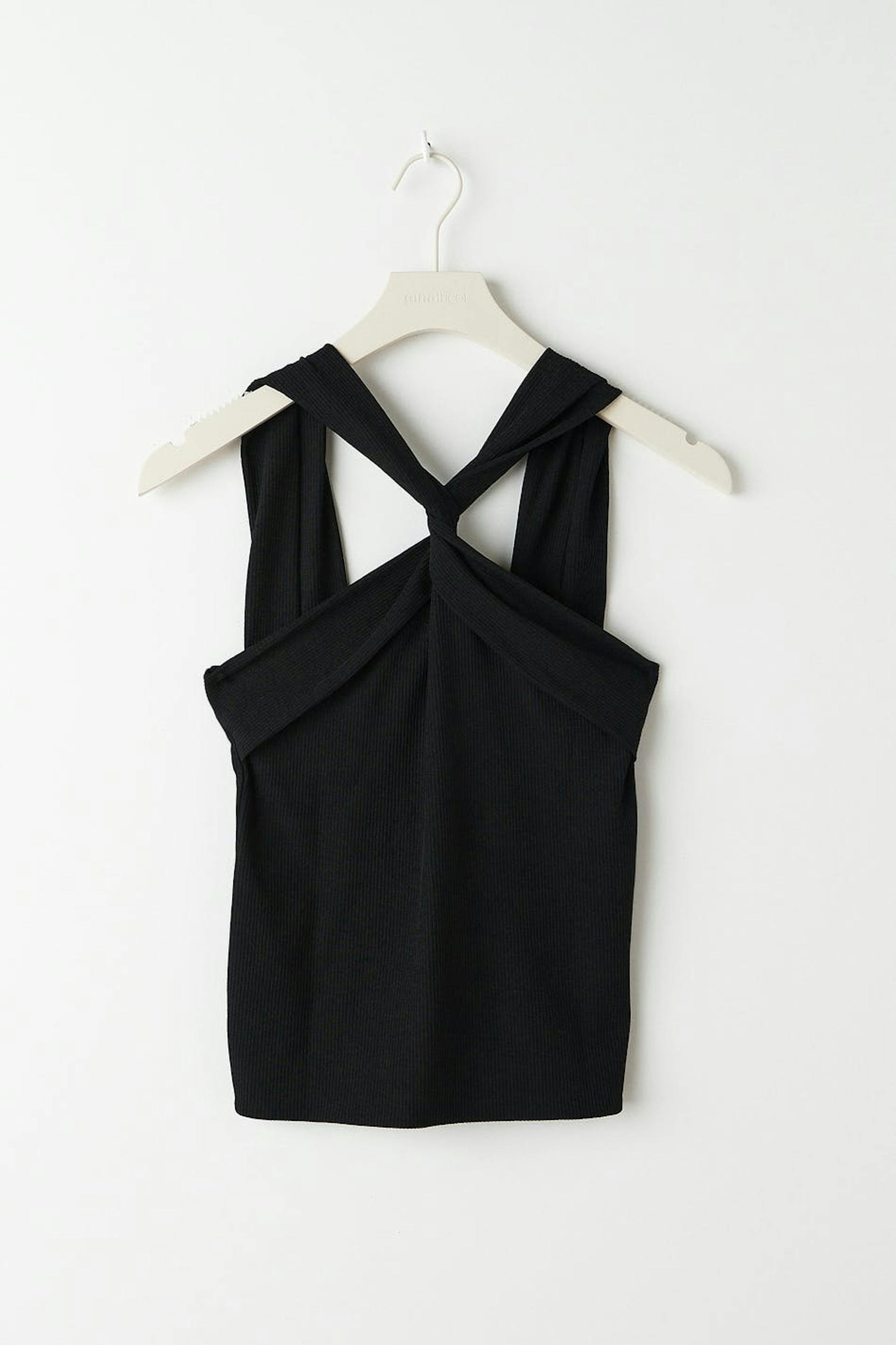 Ribbat linne med en figurnära passform. Linnet är svart och har vida, korsade axelband med en tvinnad detalj framtill.