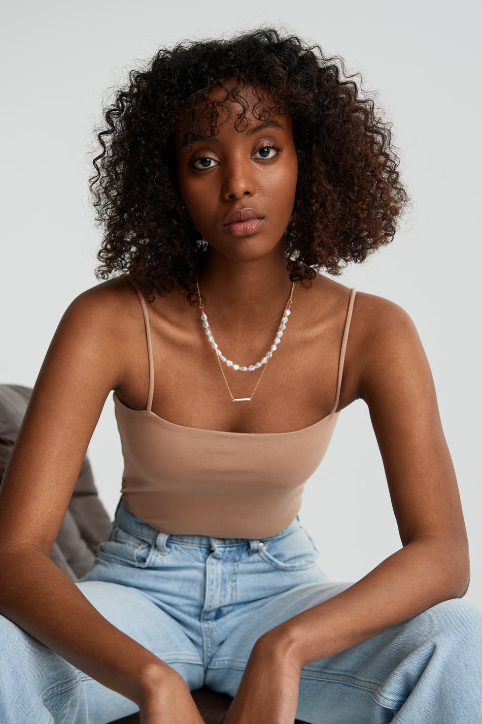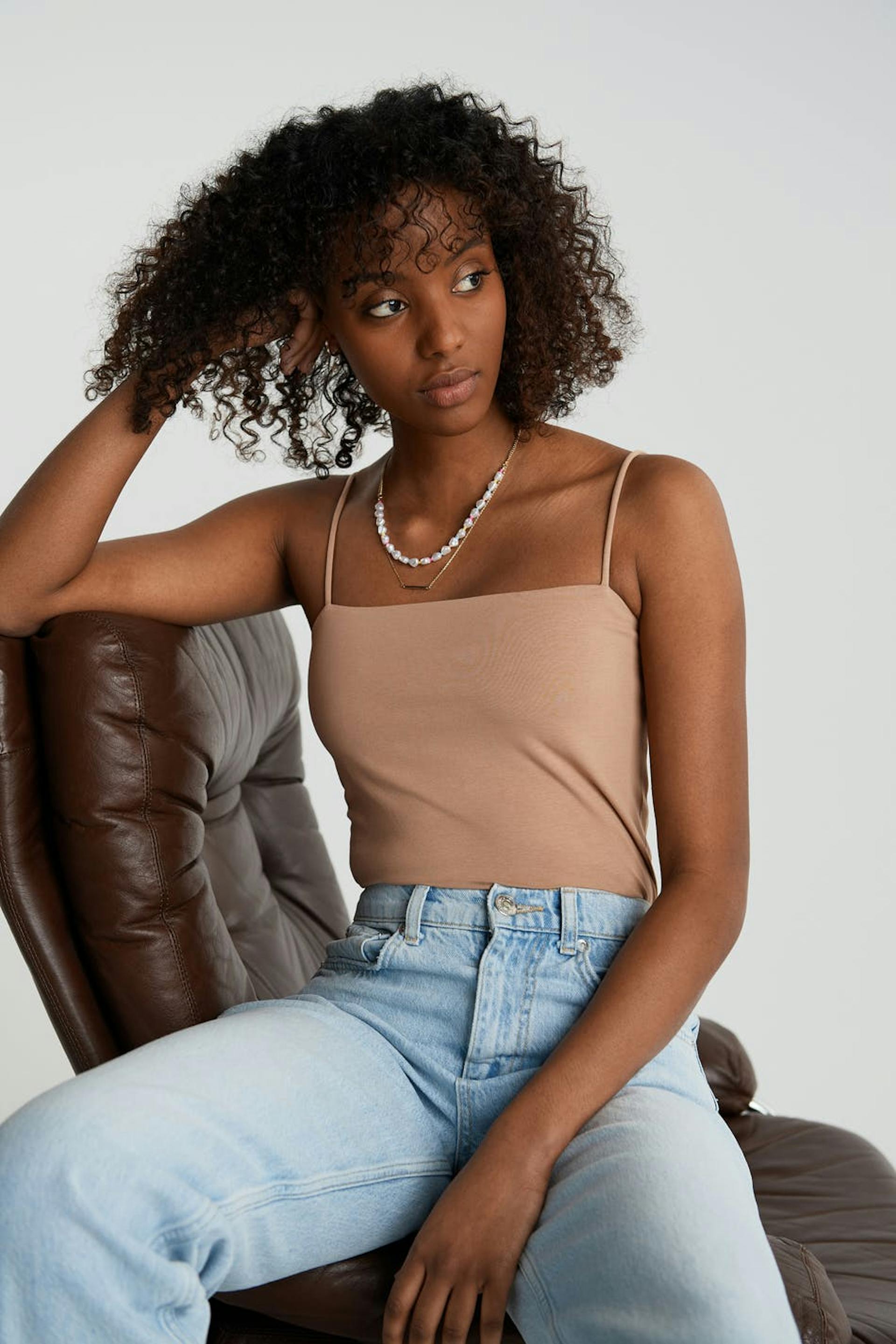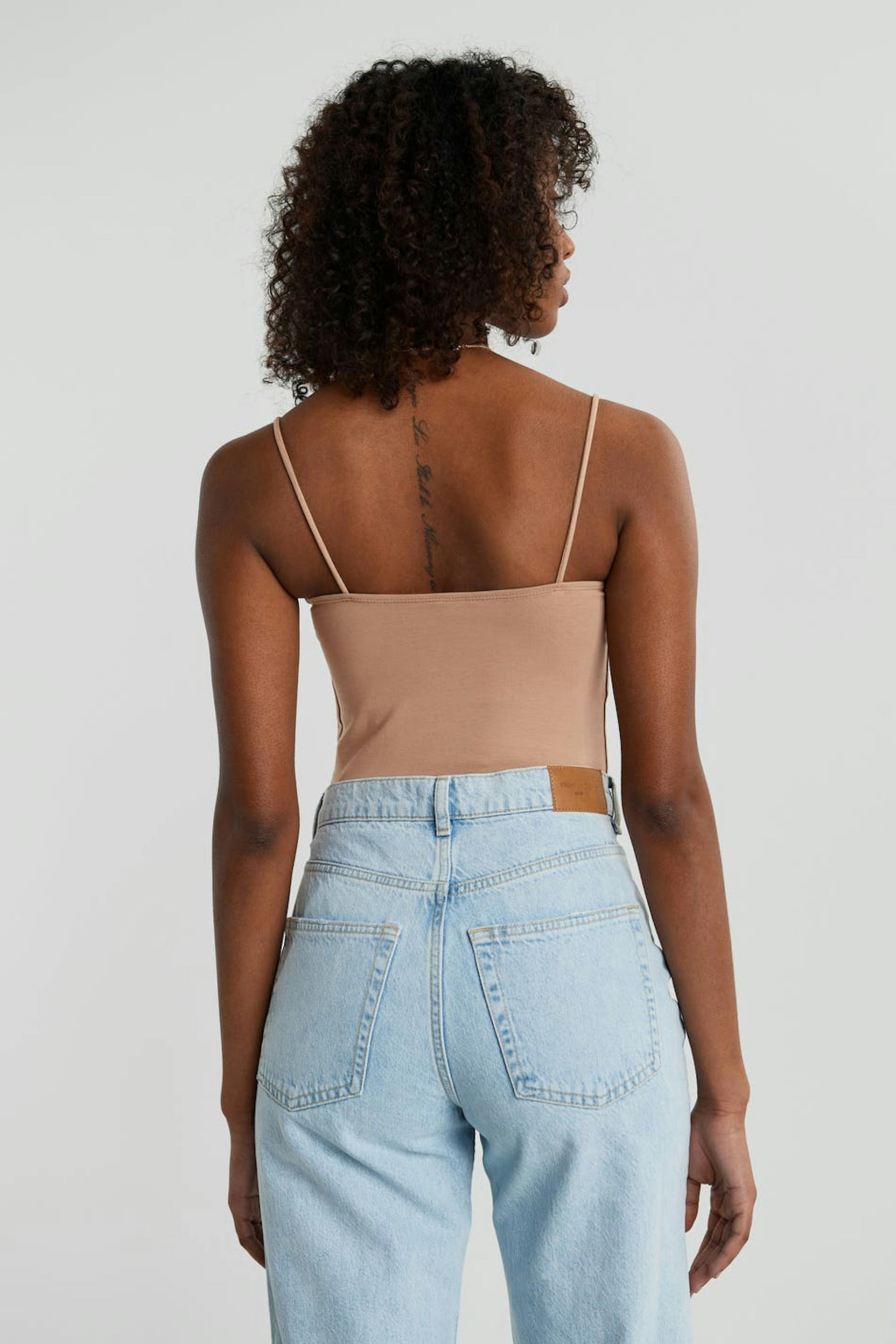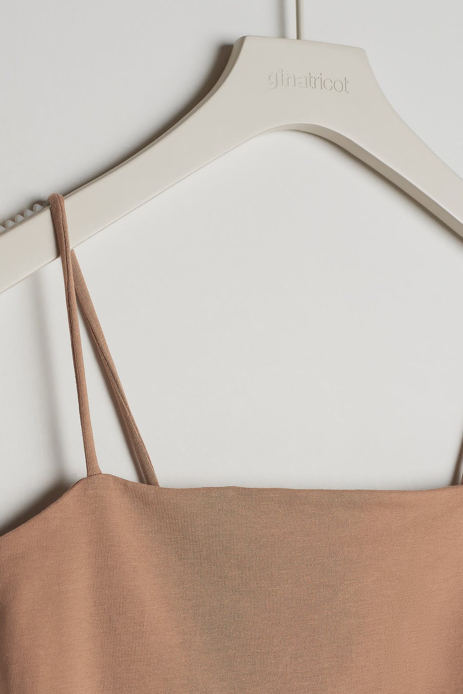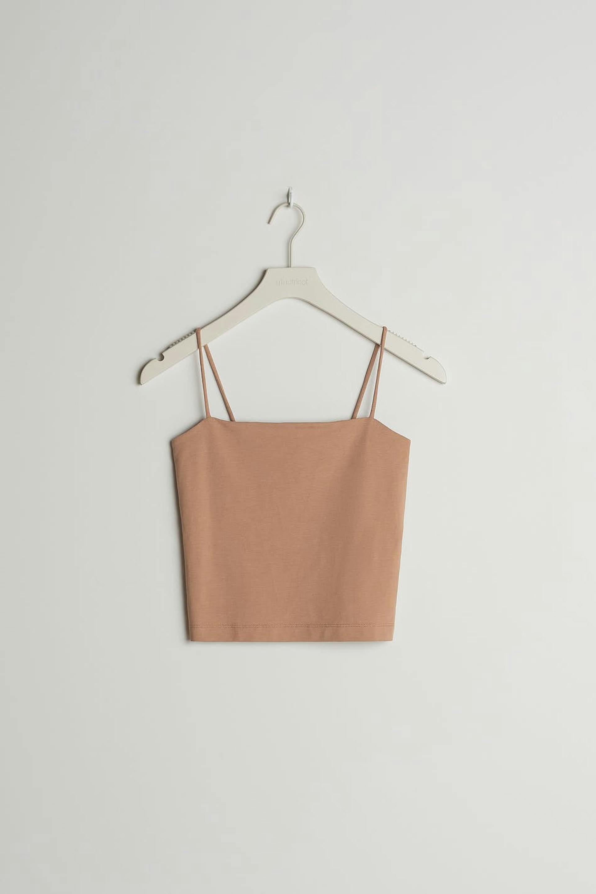 Kort crop top med en figurnära passform. Toppen är beige och har en rak övre kant. Den har tunna axelband.