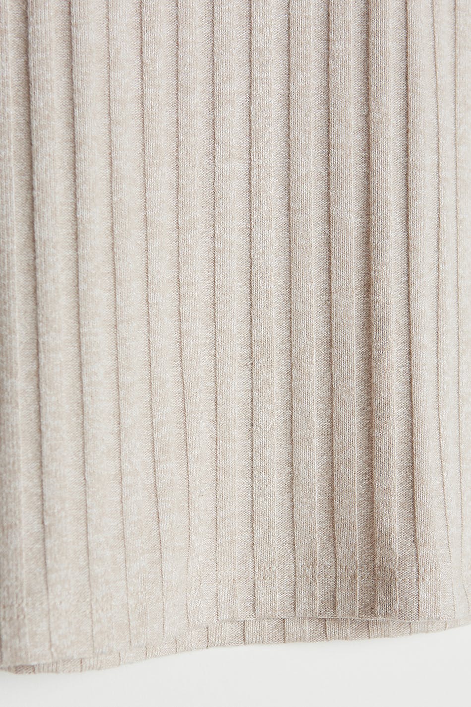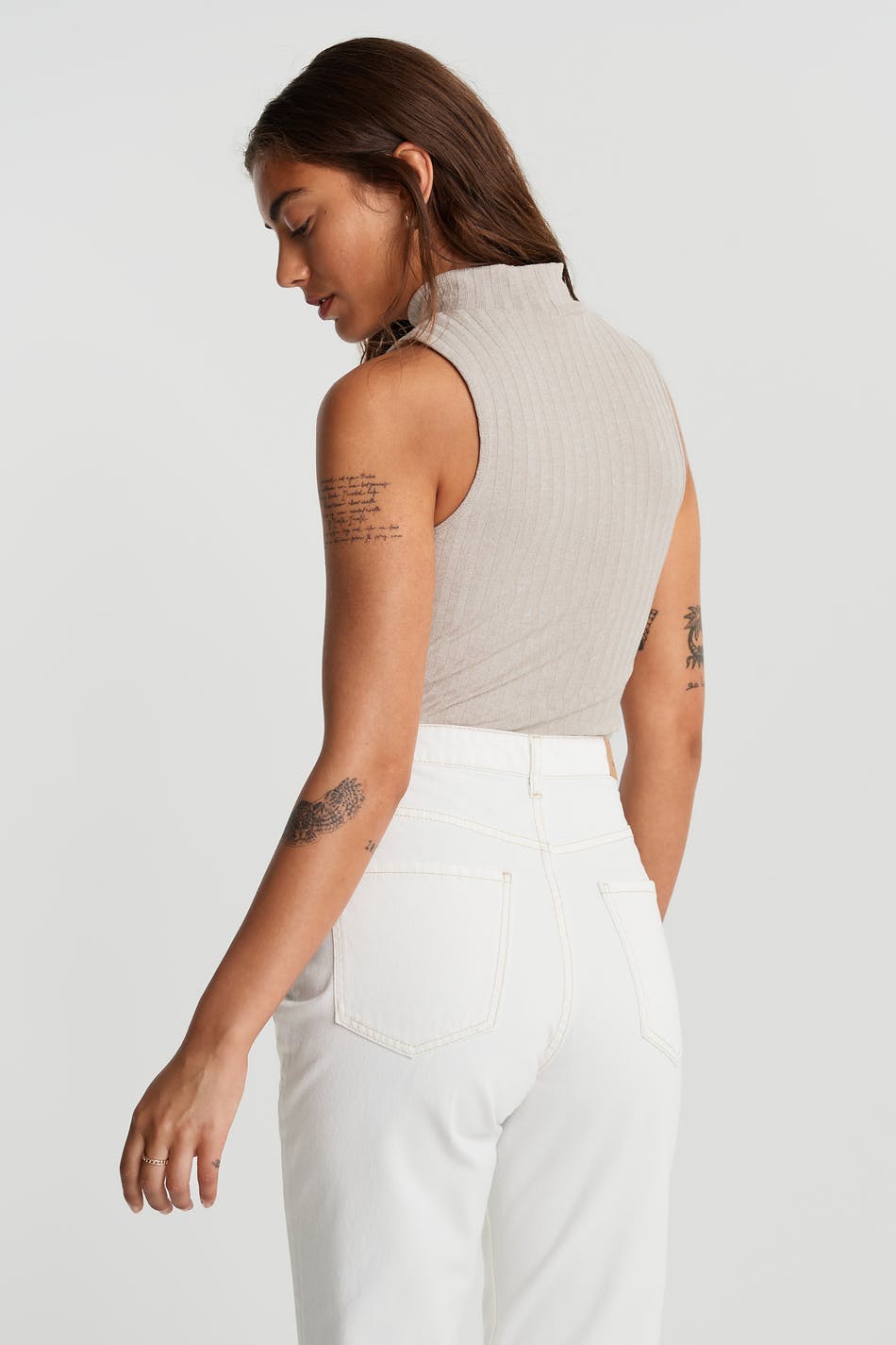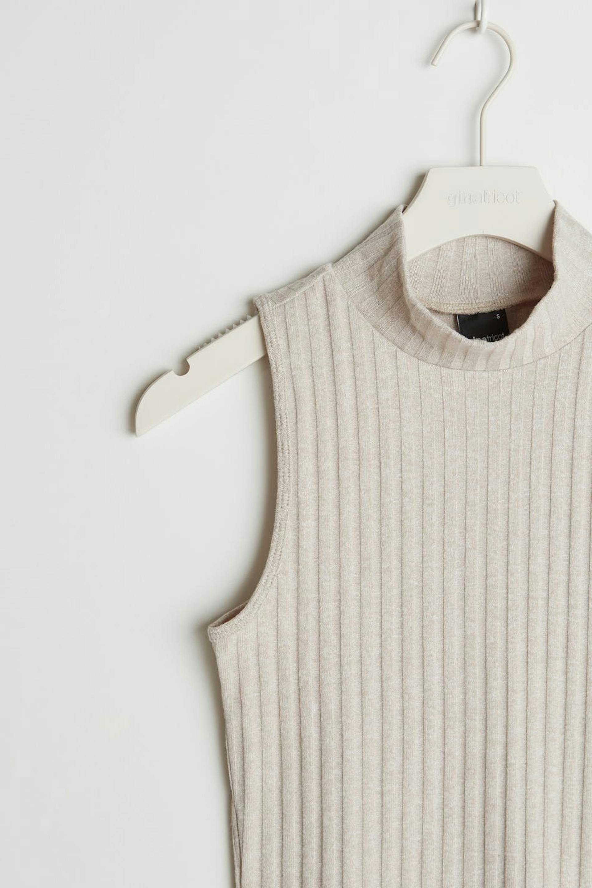 Ärmlös topp med en figurnära passform. Toppen är beige och ribbstickad och har en polokrage.