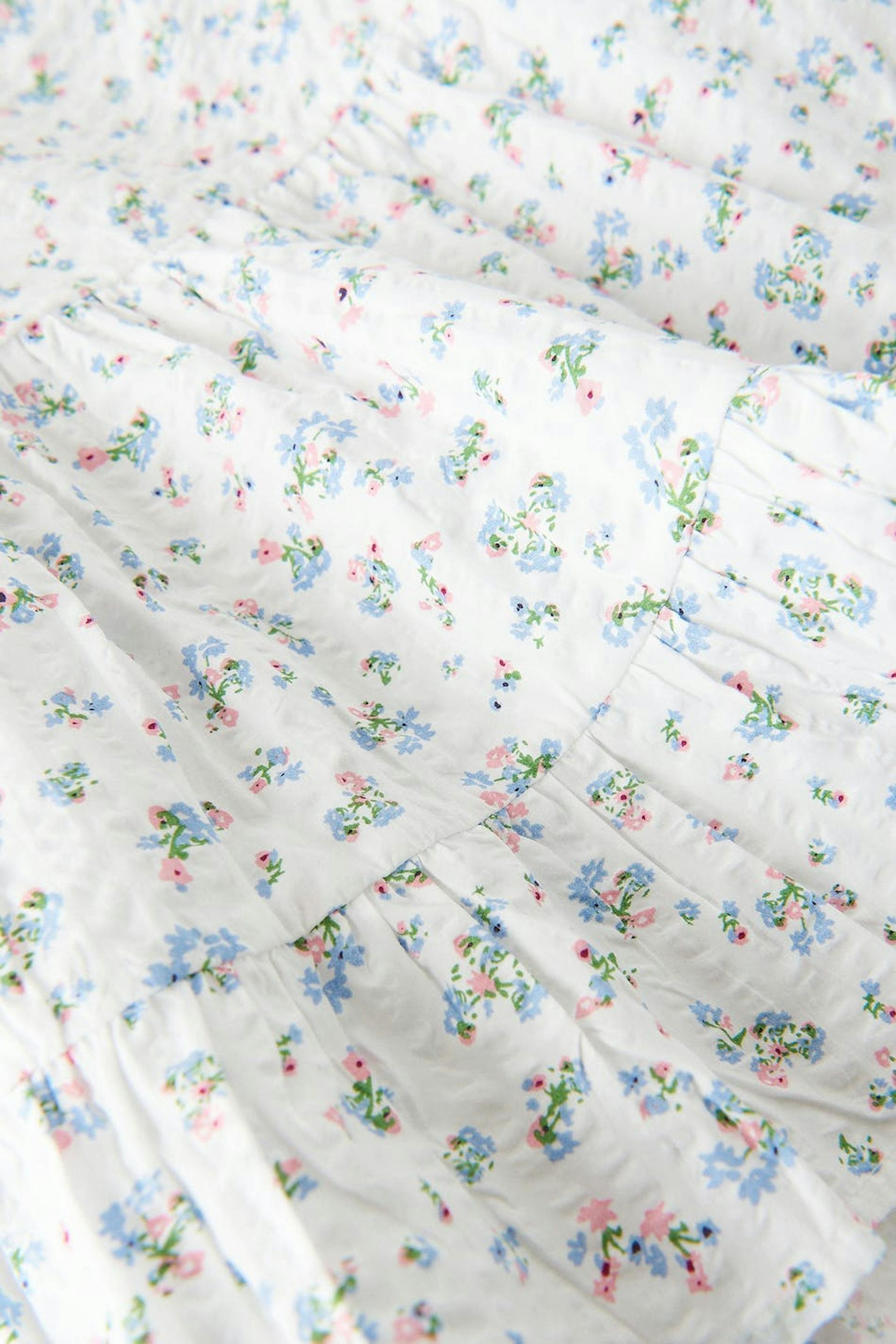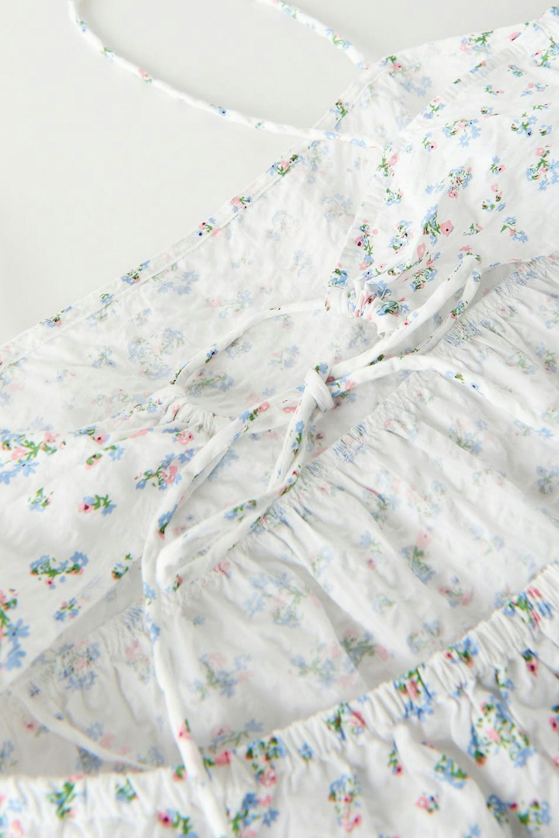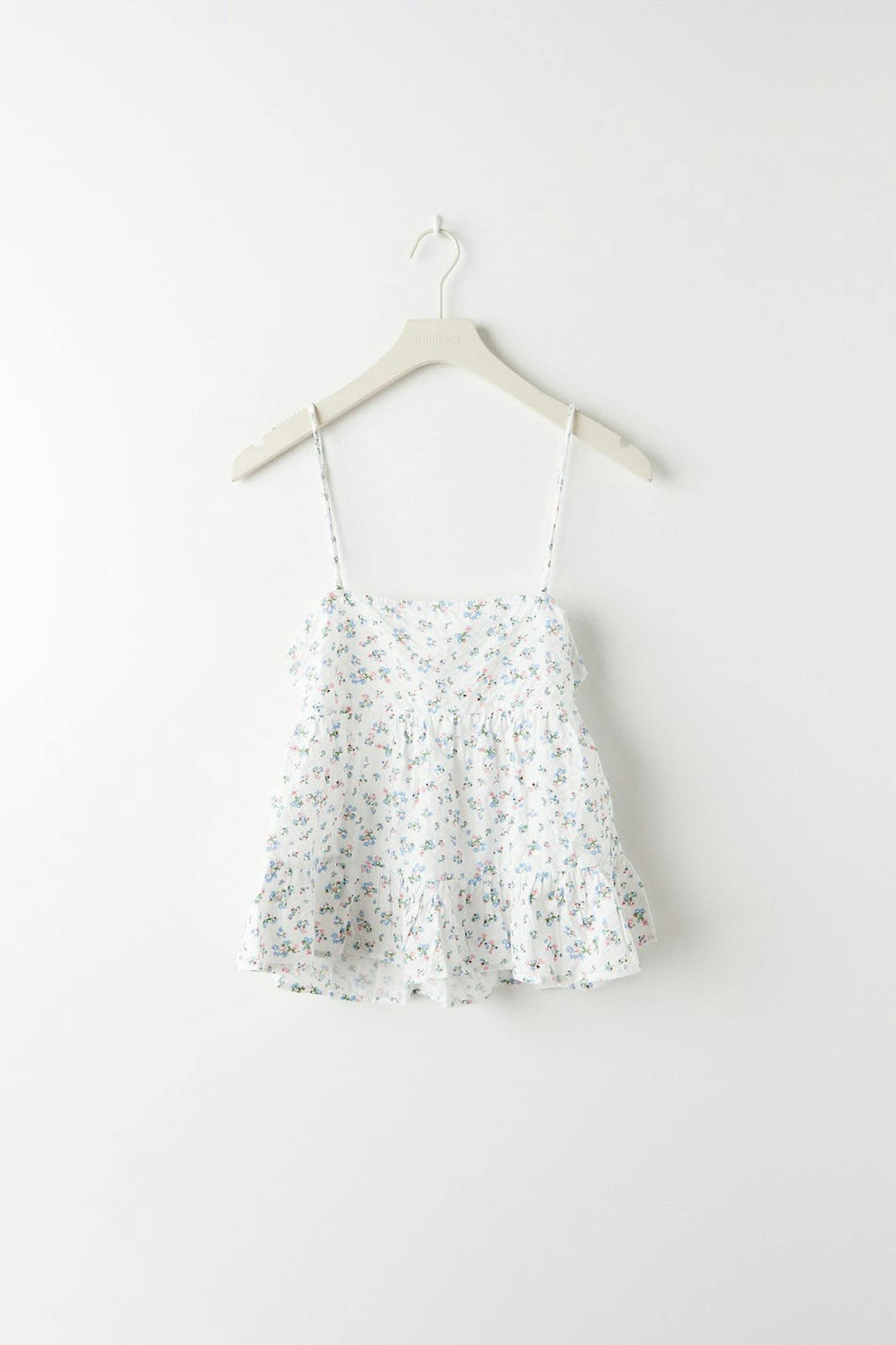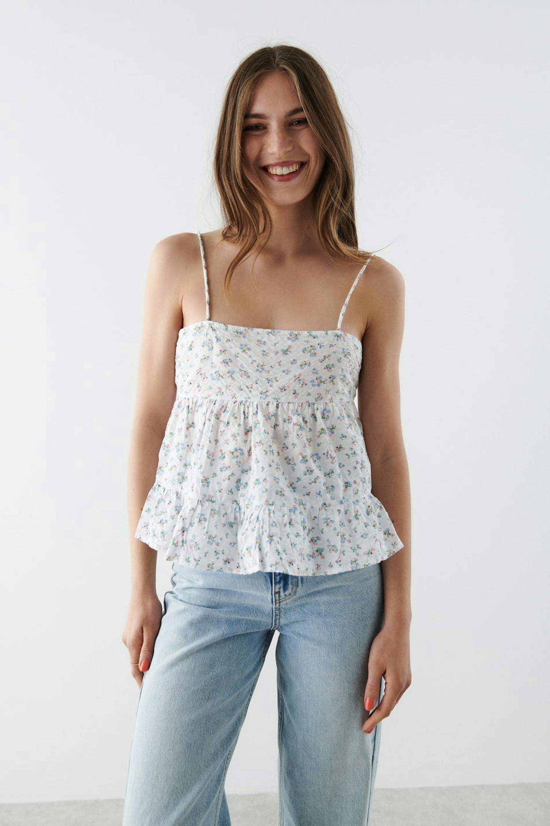 Blommig volangtopp med tunna axelband. Toppen är vit, kort och ärmlös. Den har en knytdetalj baktill och öppning i ryggen med resår.