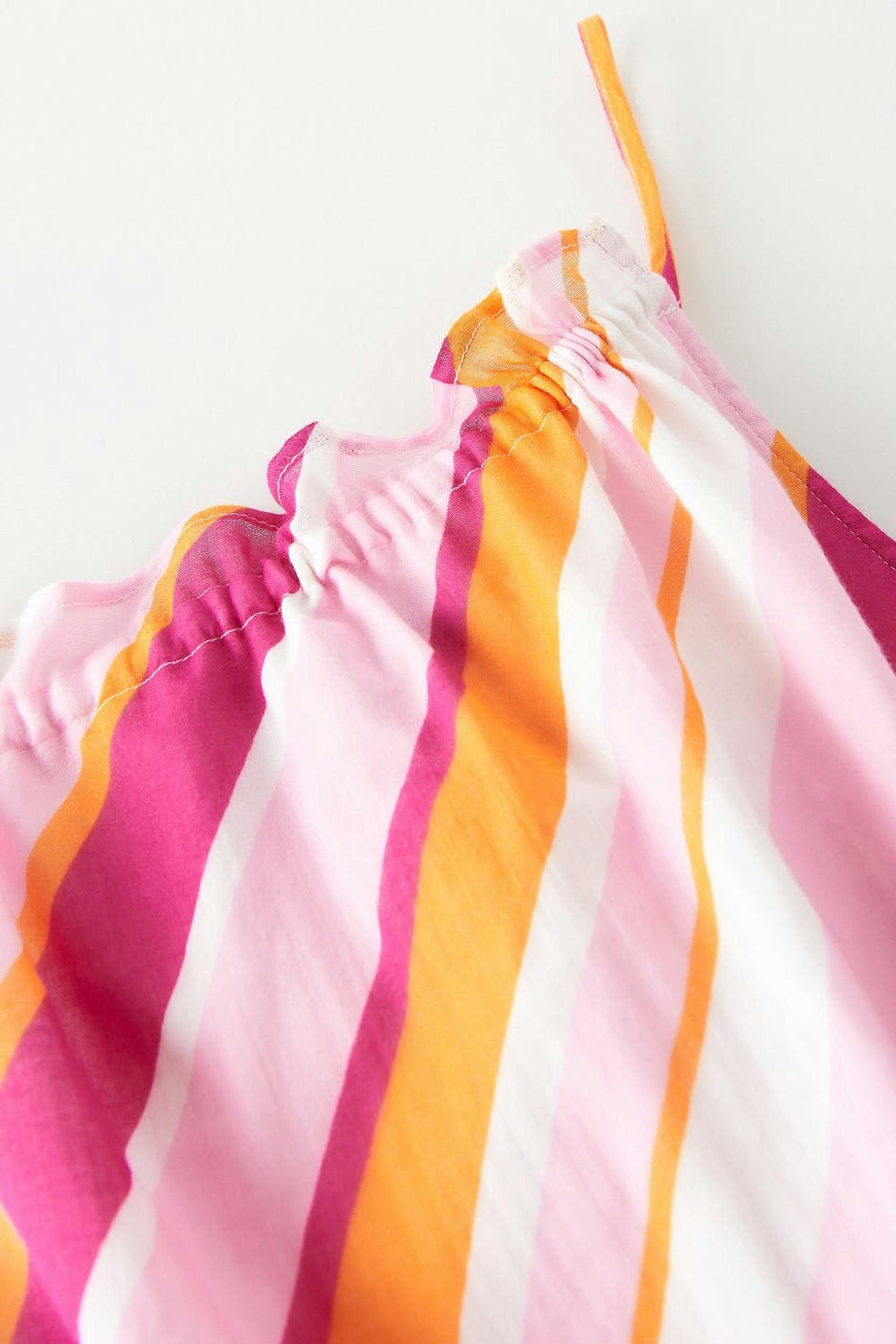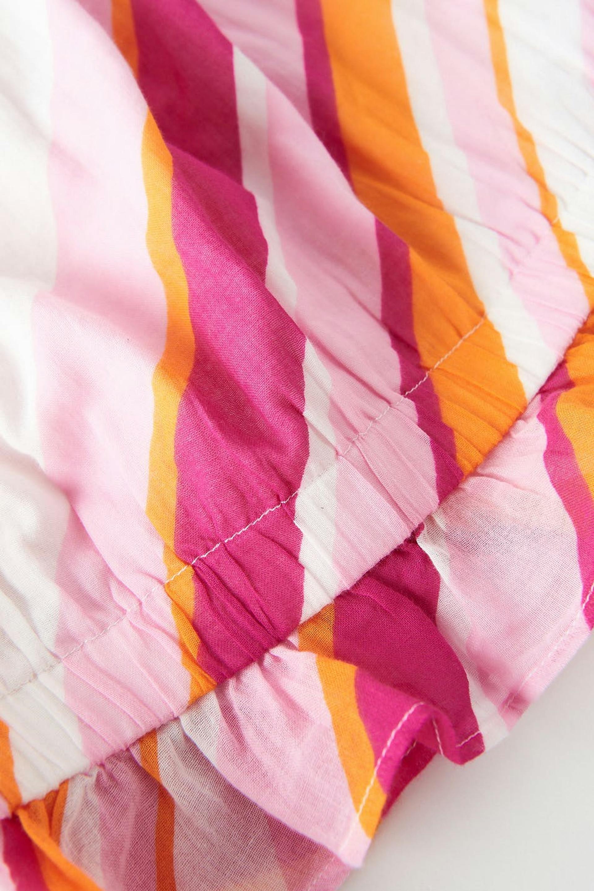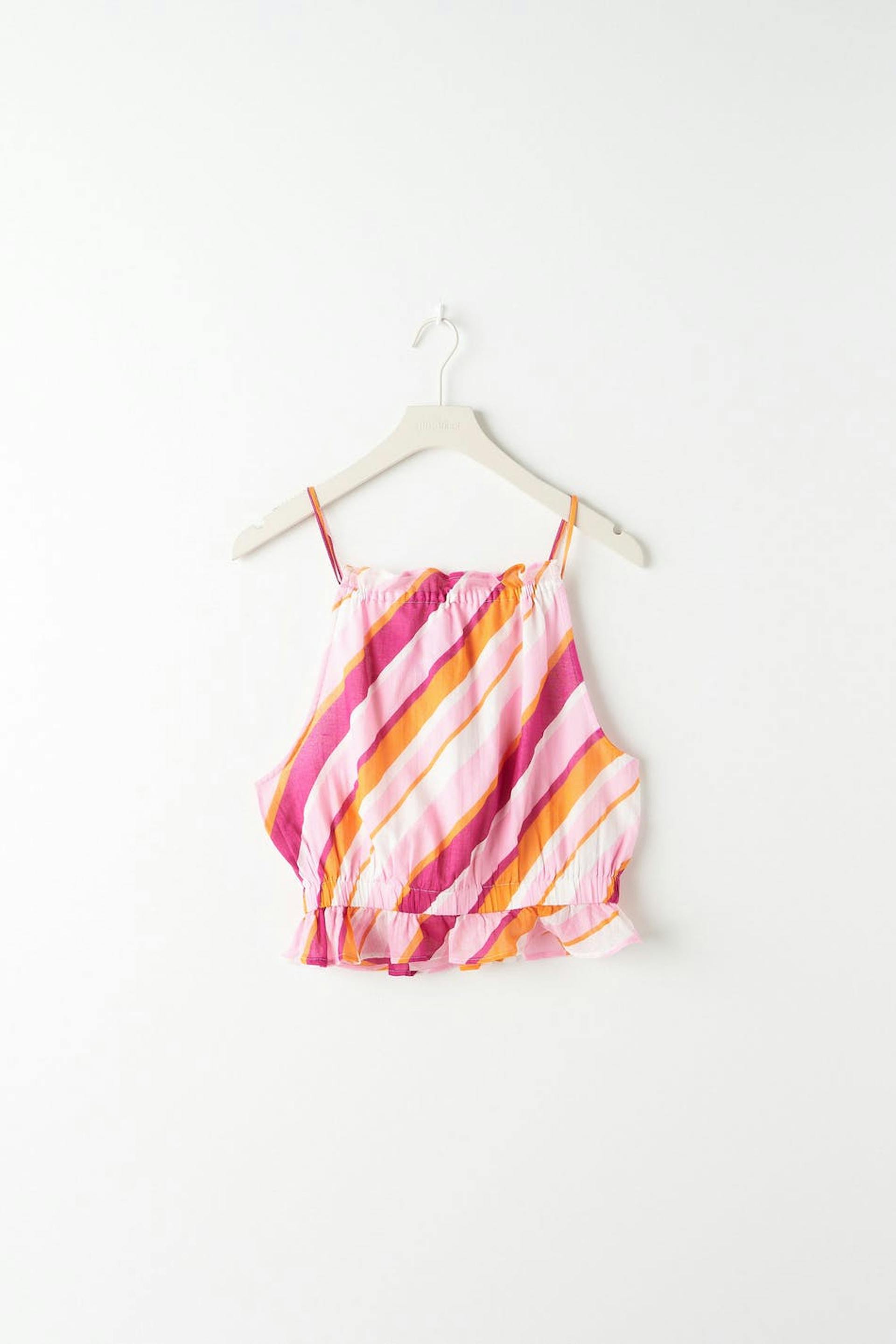 Randig topp med rynkad effekt i midjan. Toppen är rosa, ärmlös och kort. Den har tunna axelband och en resår i midjan.