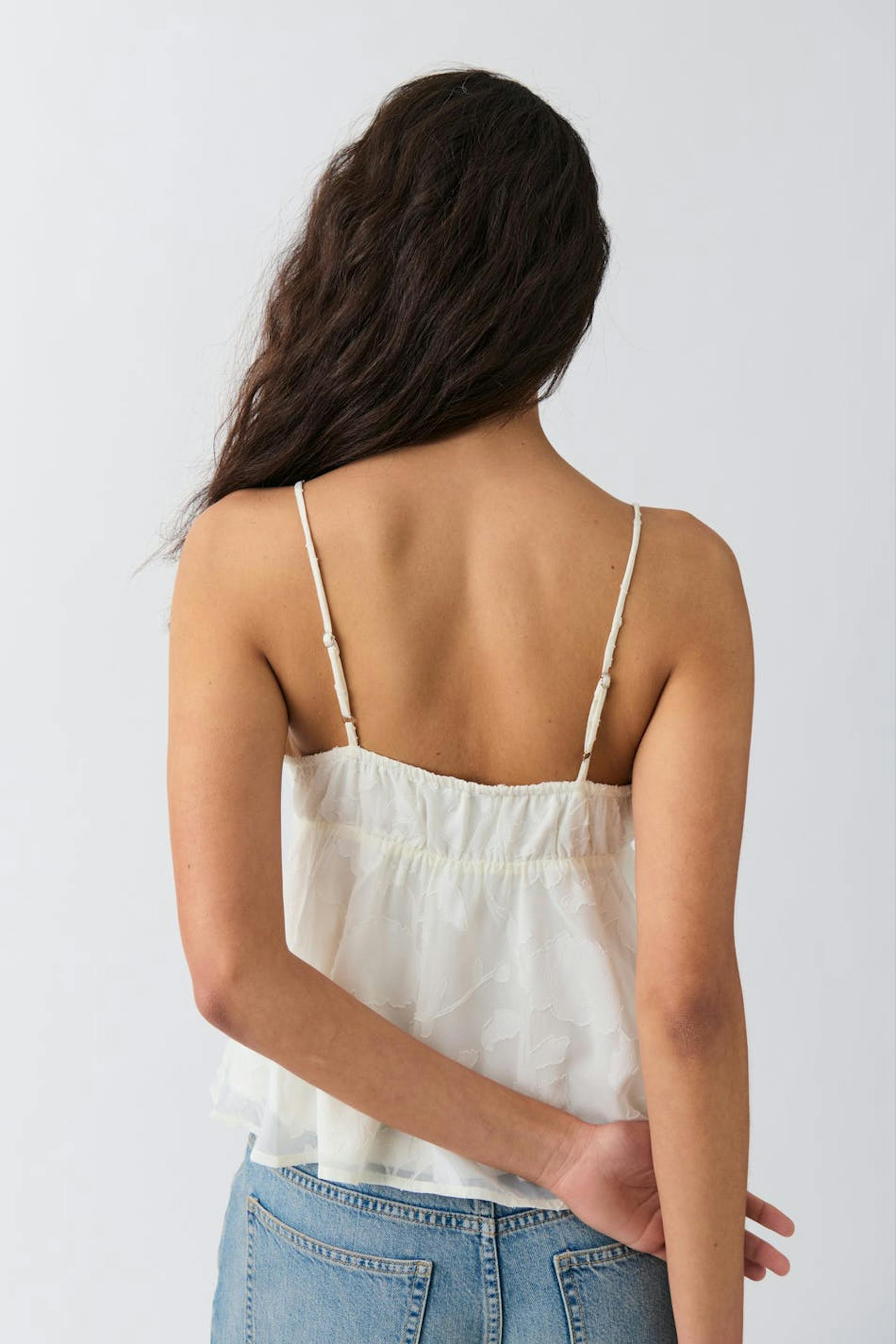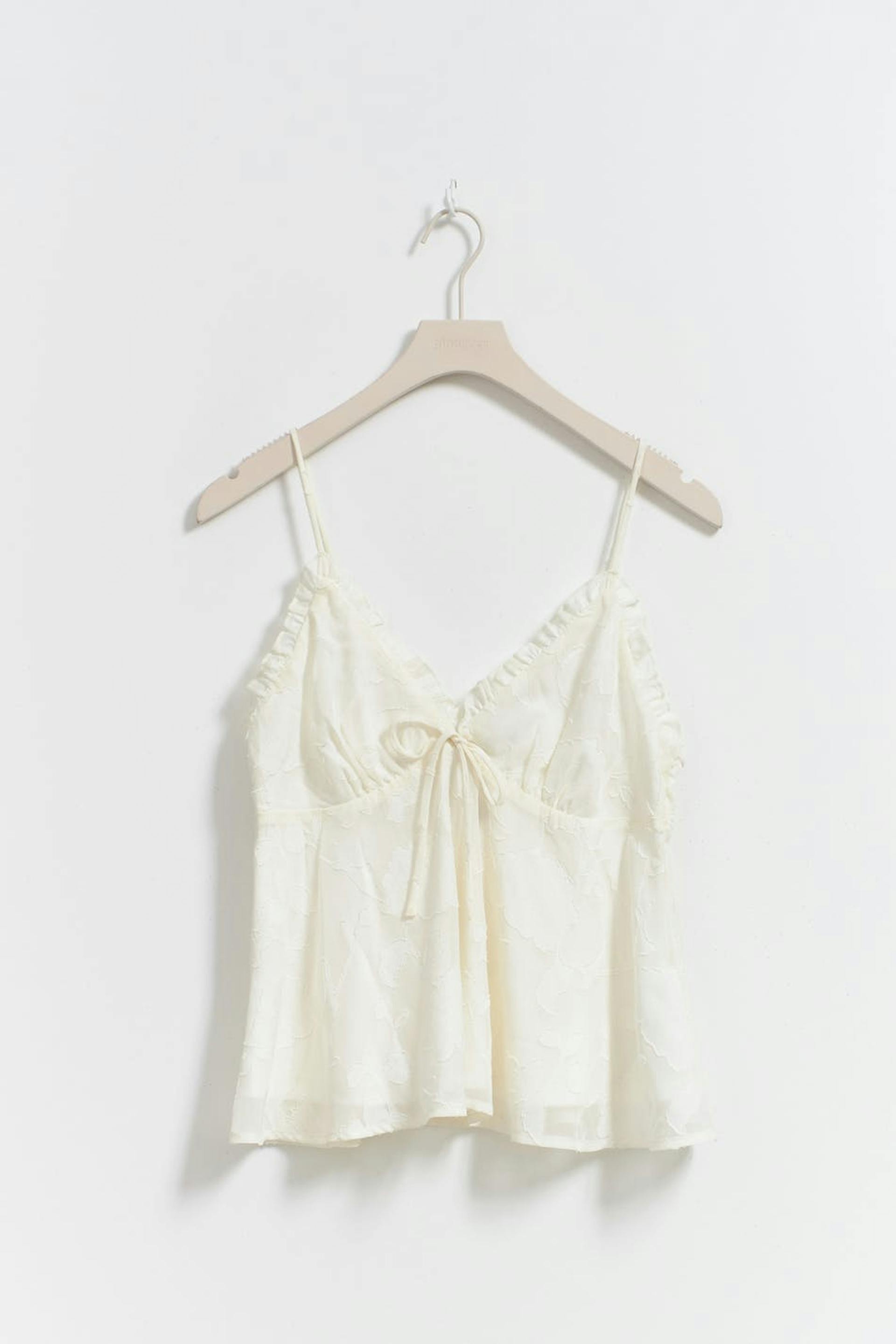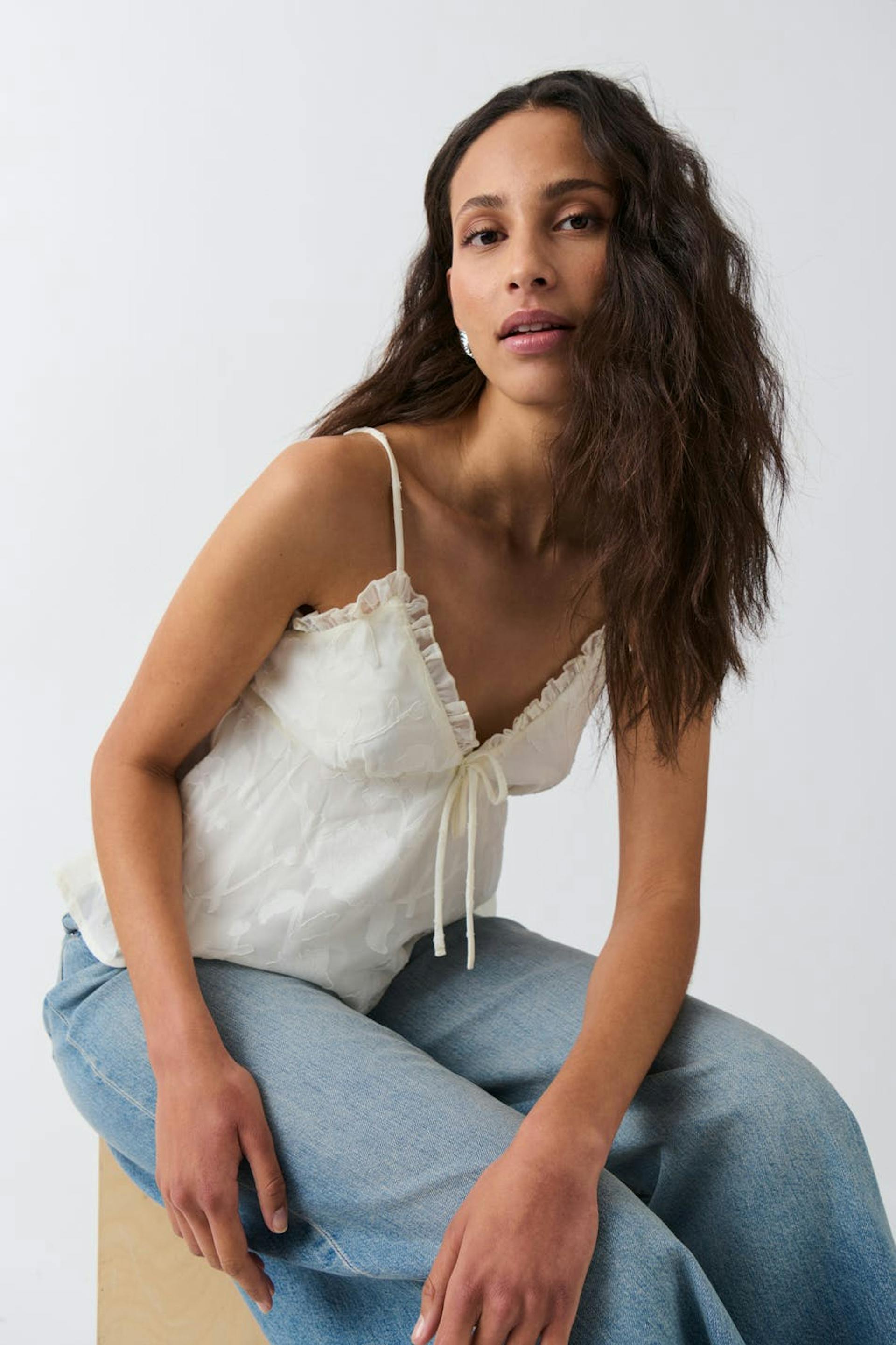 Fodrat linne med knytdetalj framtill. Linnet är vitt och har reglerbara axelband. Det har v-ringning med volanger, resår upptill och blommigt tyg med textur.