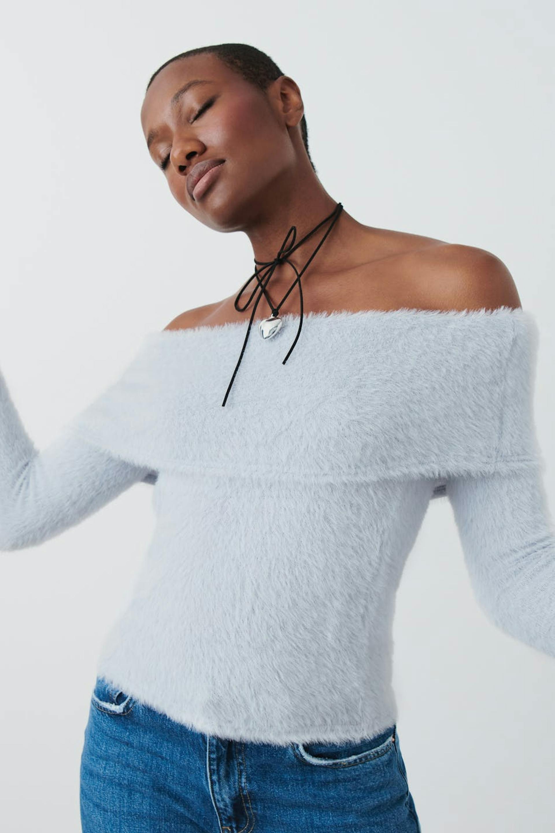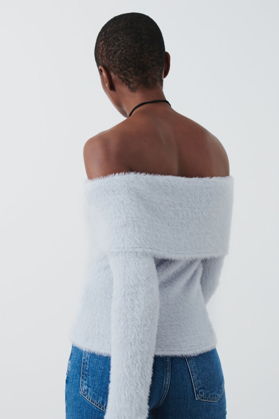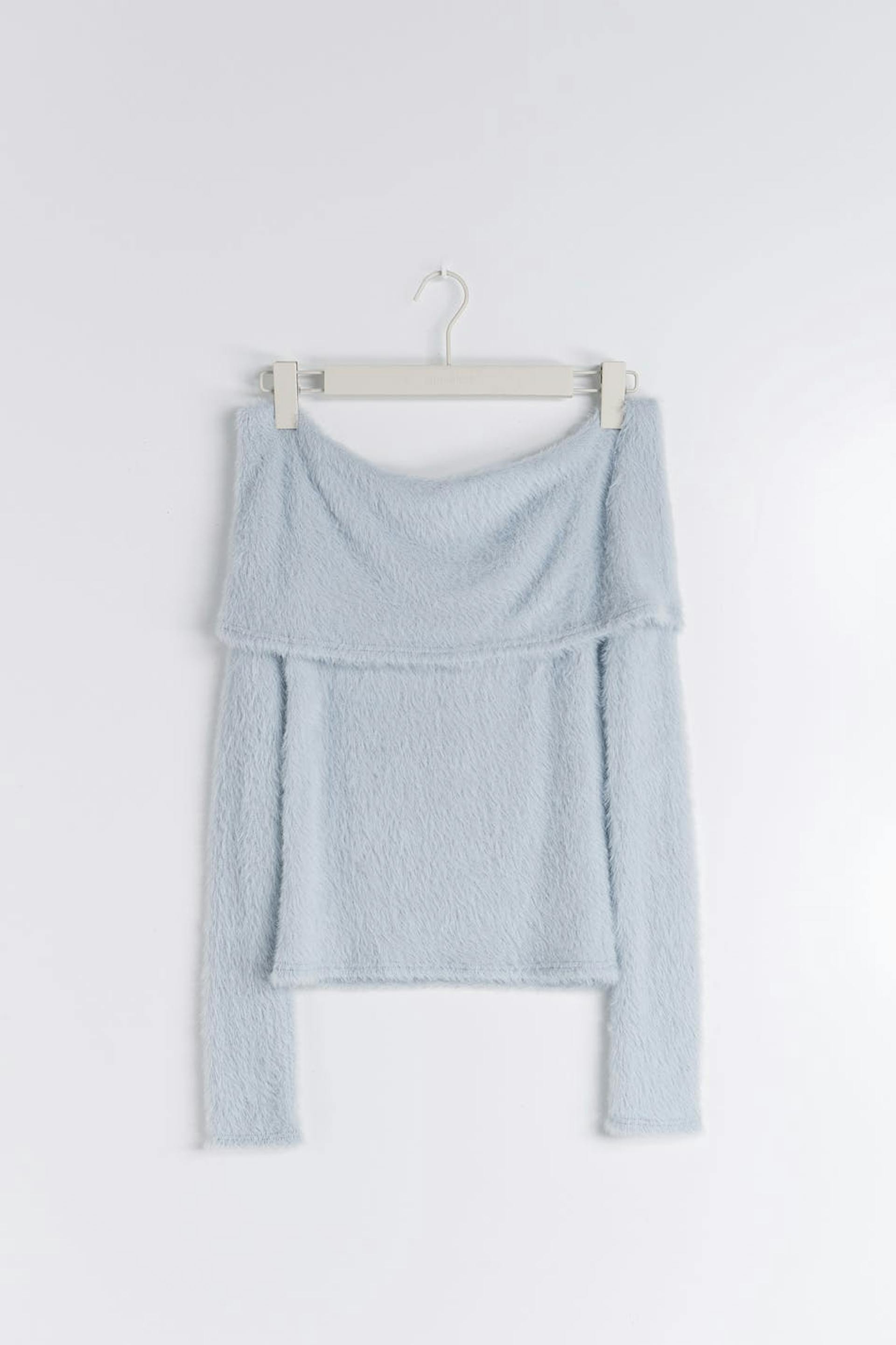 Långärmad off shoulder topp med fluffig kvalitet. Toppen är blå och har figurnära passform.