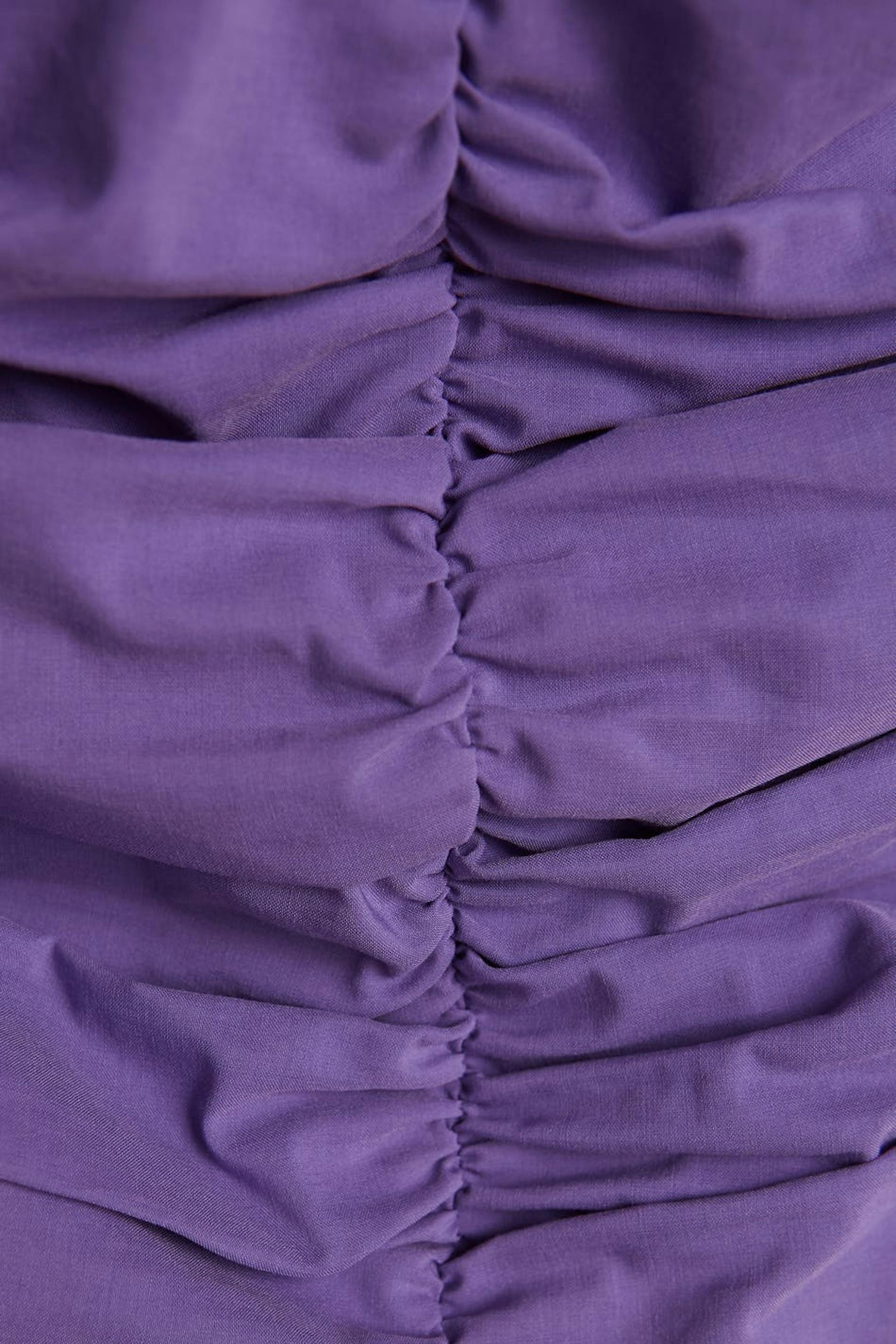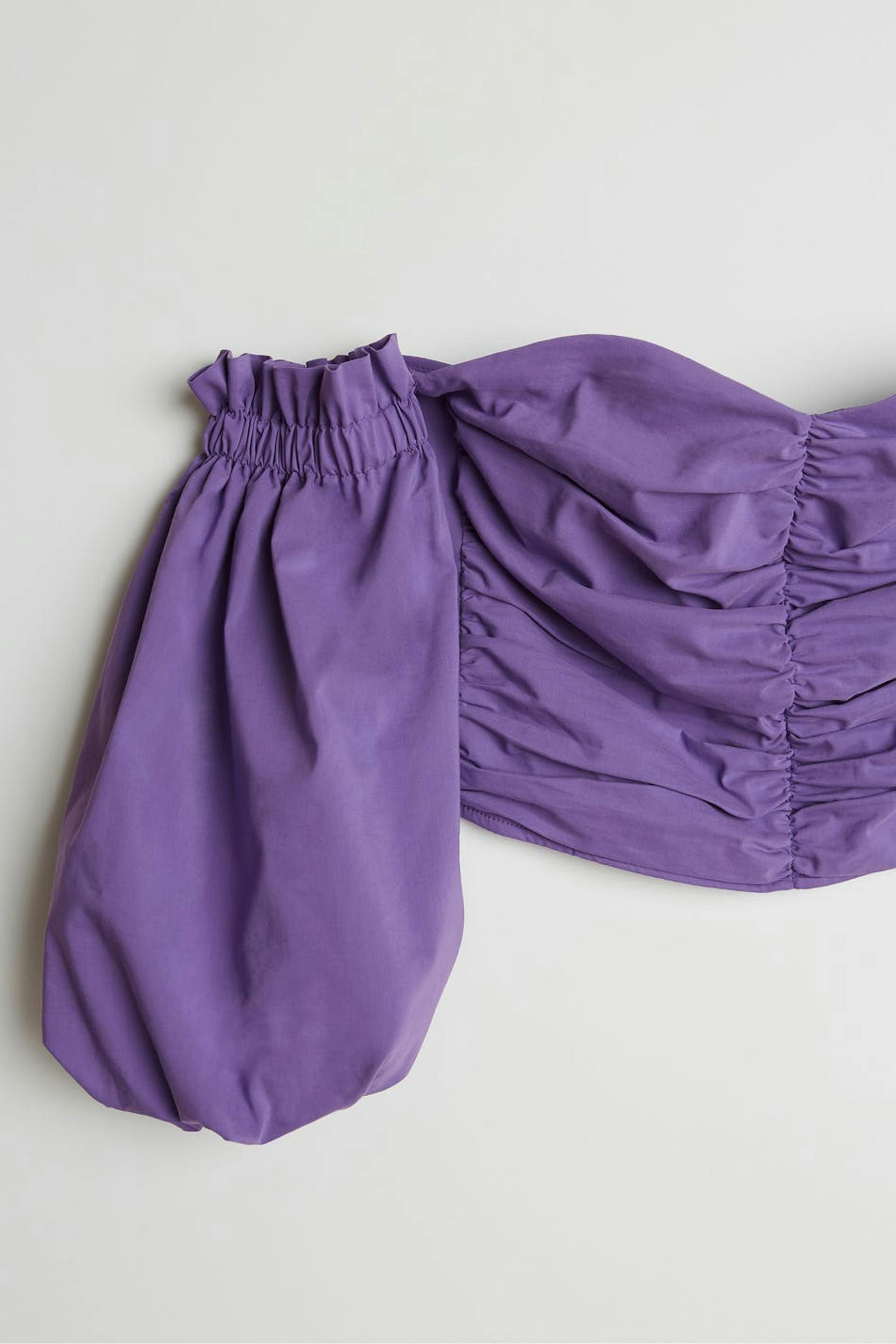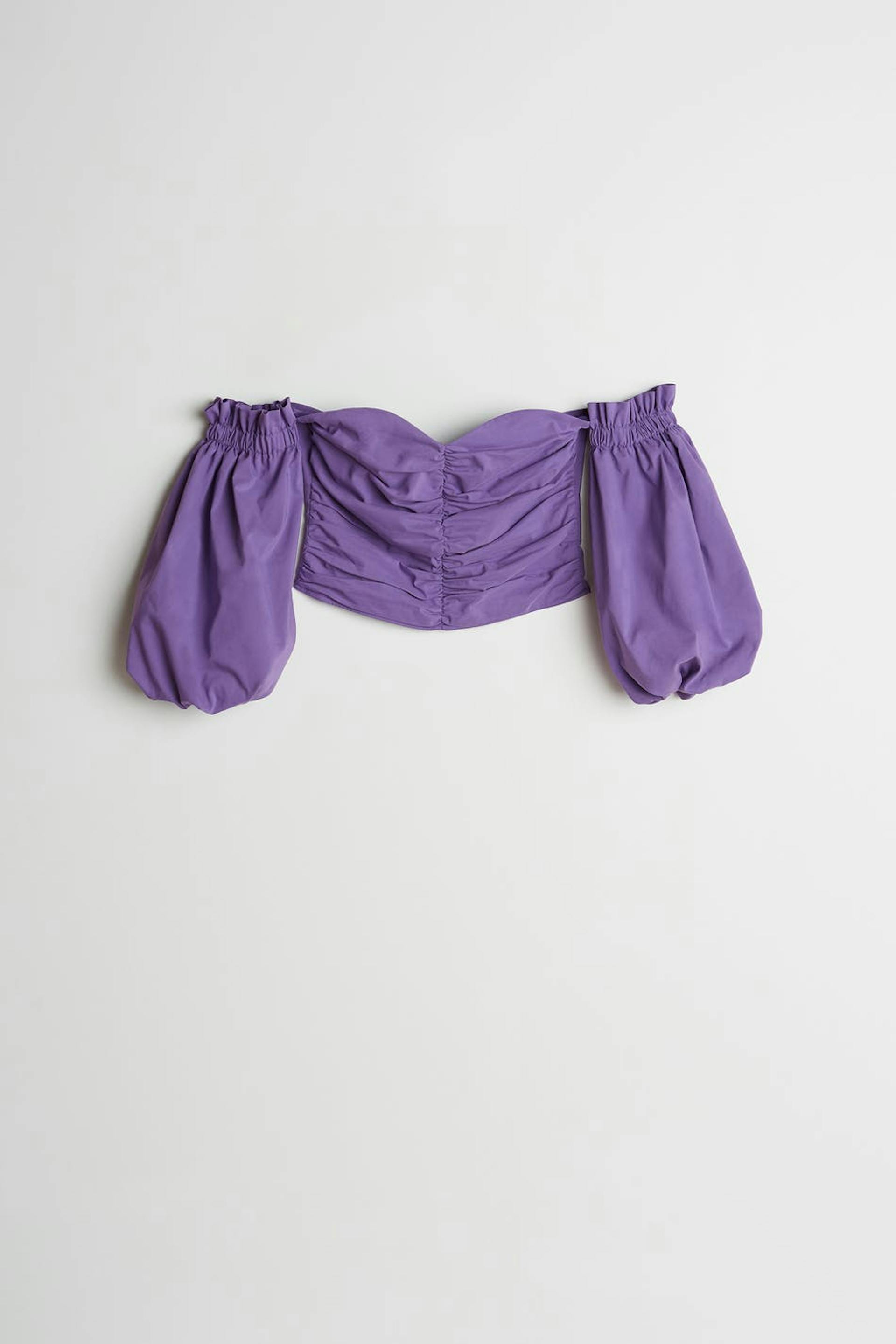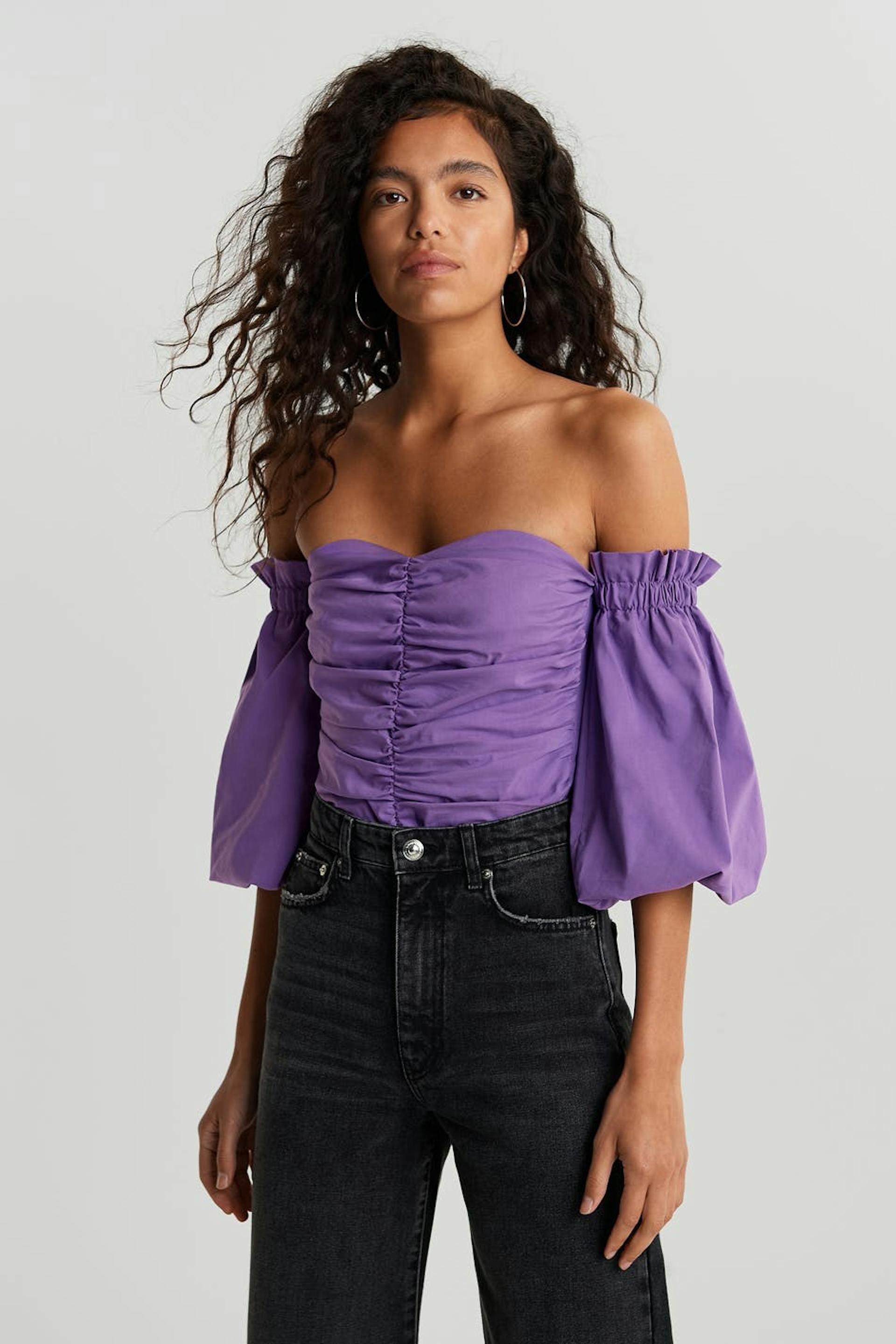 Vävd offshoulder-topp med långa ballongärmar. Rynkning mitt fram. Leverantör: Huzi Tekstil Ltd Sti Produktionsenhet: Yesim Tekstil-Hulya Karacoban