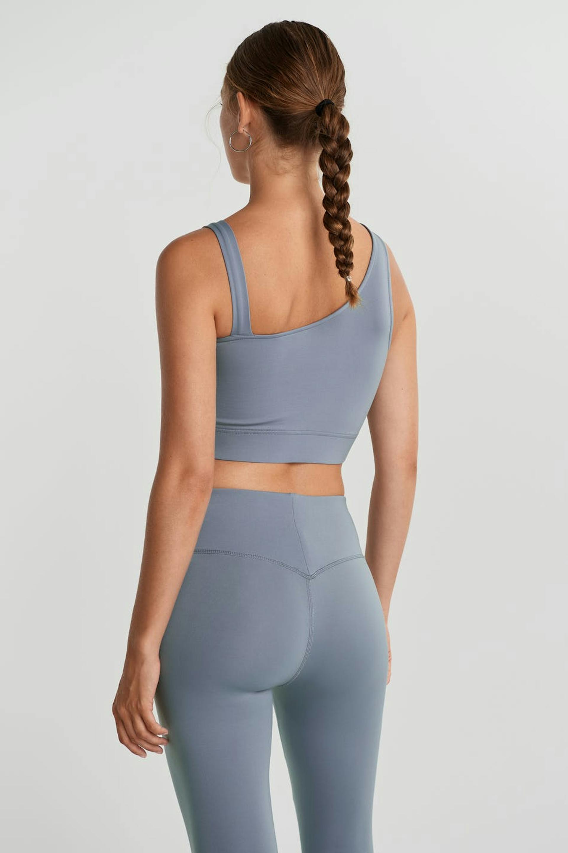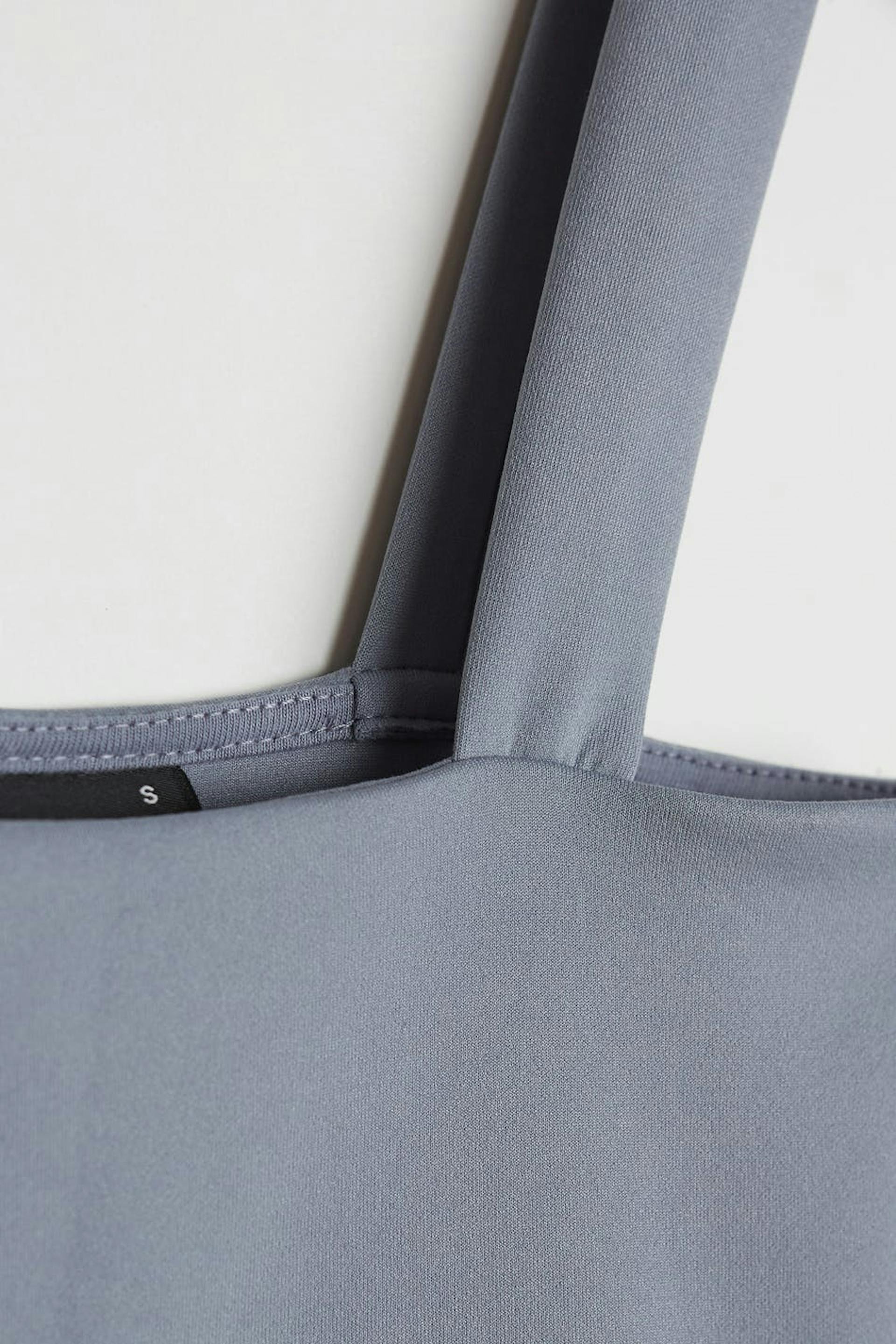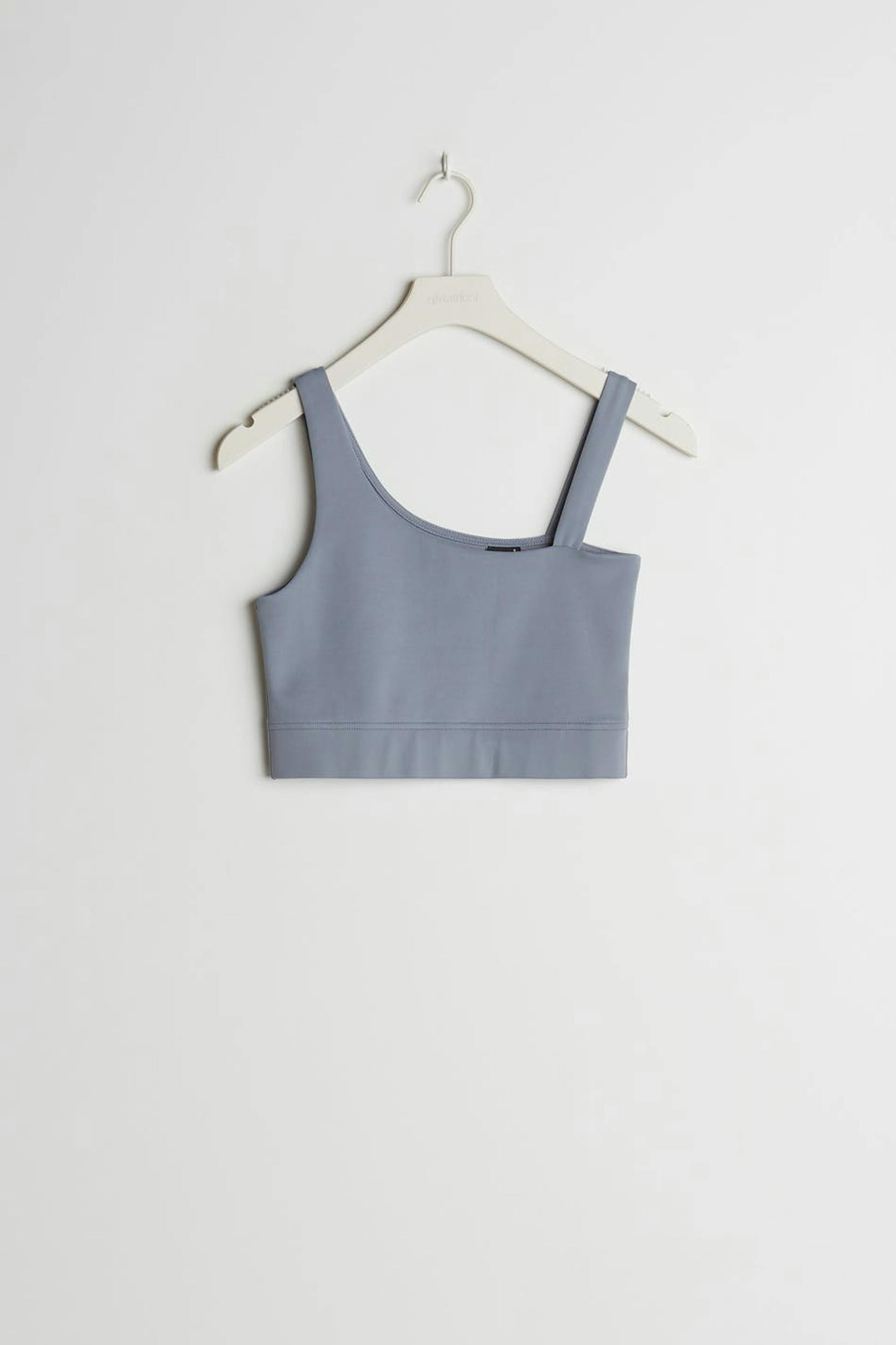 Kort topp med en figurnära passform. Toppen är blå och har en one shoulder-stil med två axelband. Den har en resår vid fållen och en foder framtill.