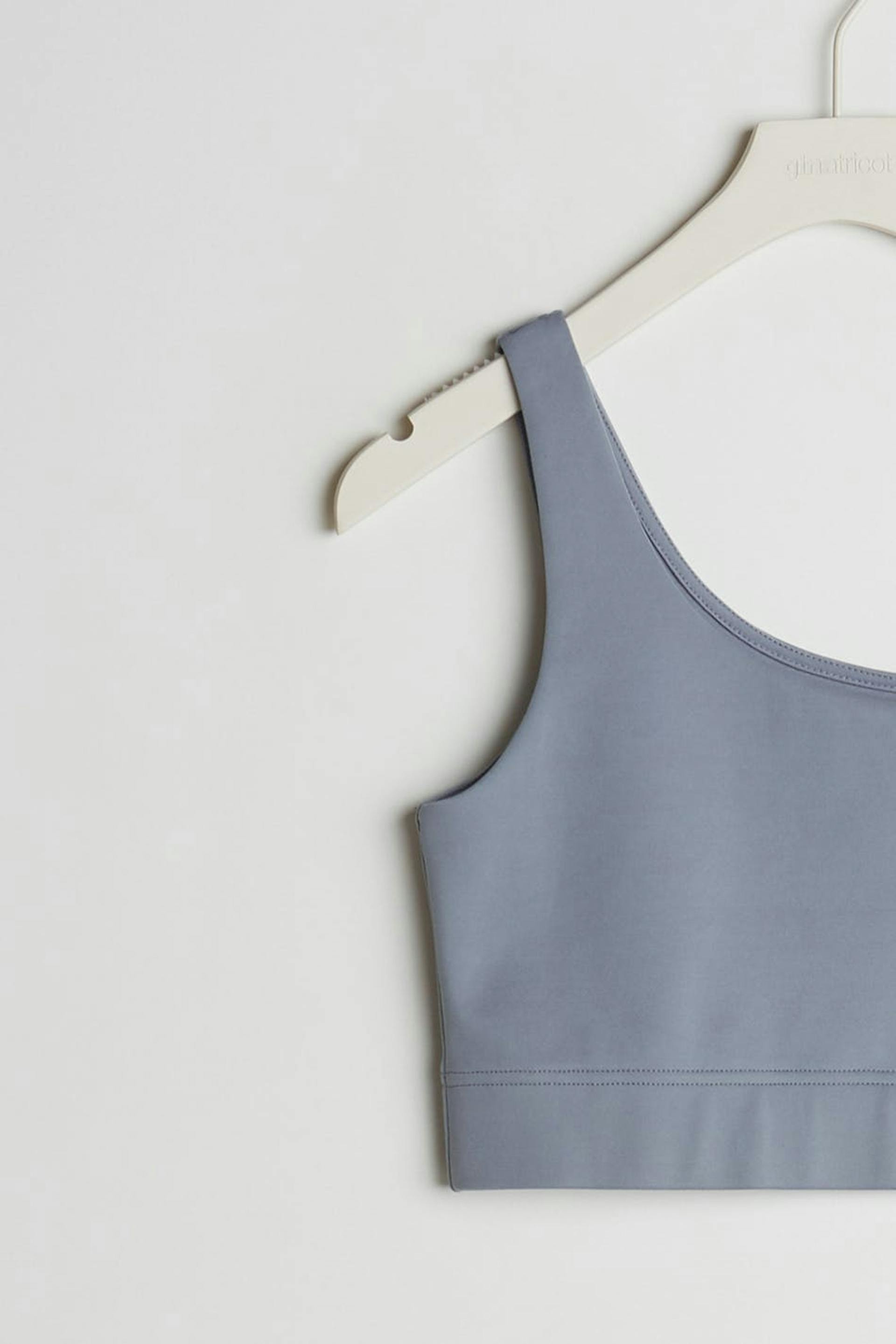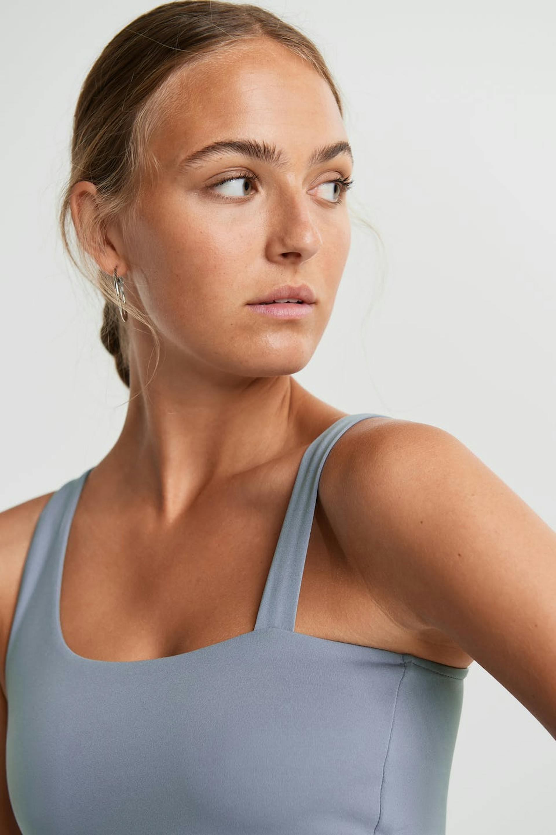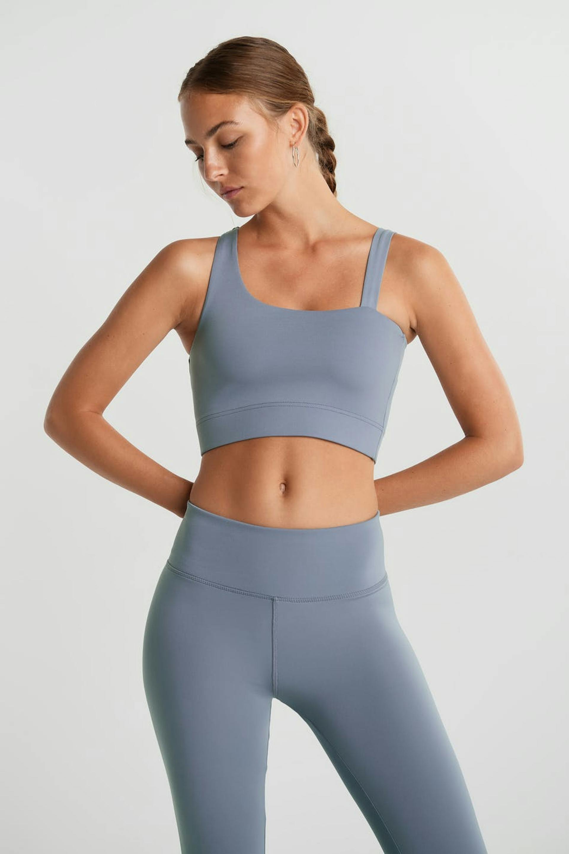 Kort topp med en figurnära passform. Toppen är blå och har en one shoulder-stil med två axelband. Den har en resår vid fållen och en foder framtill.