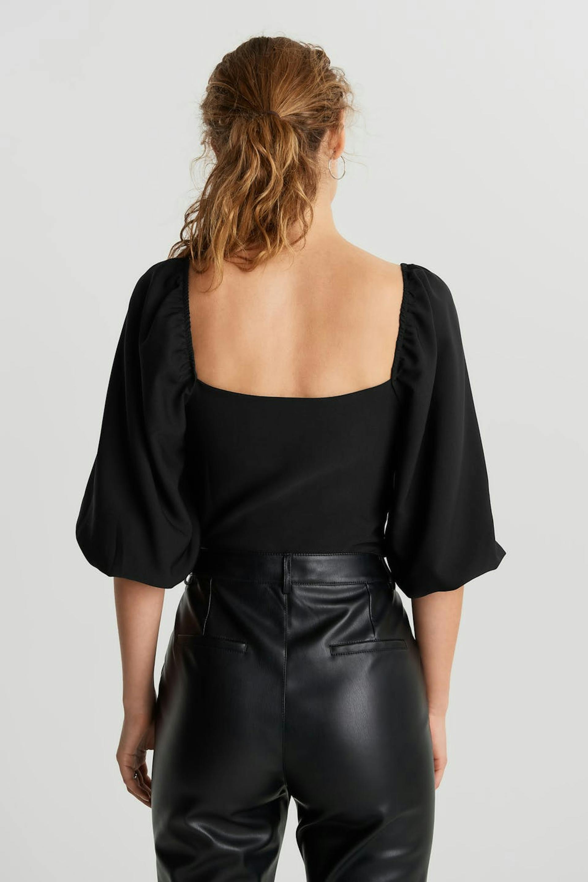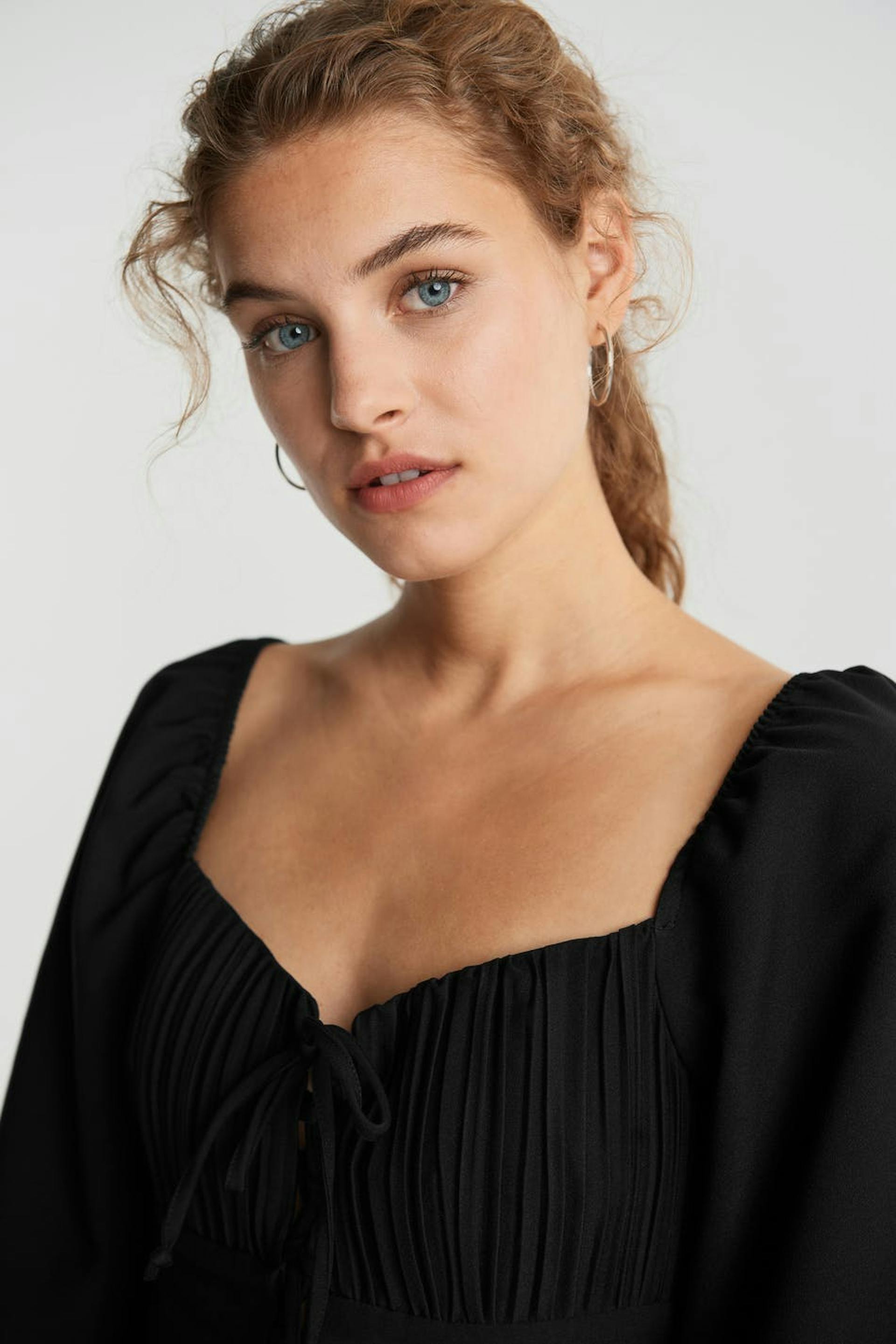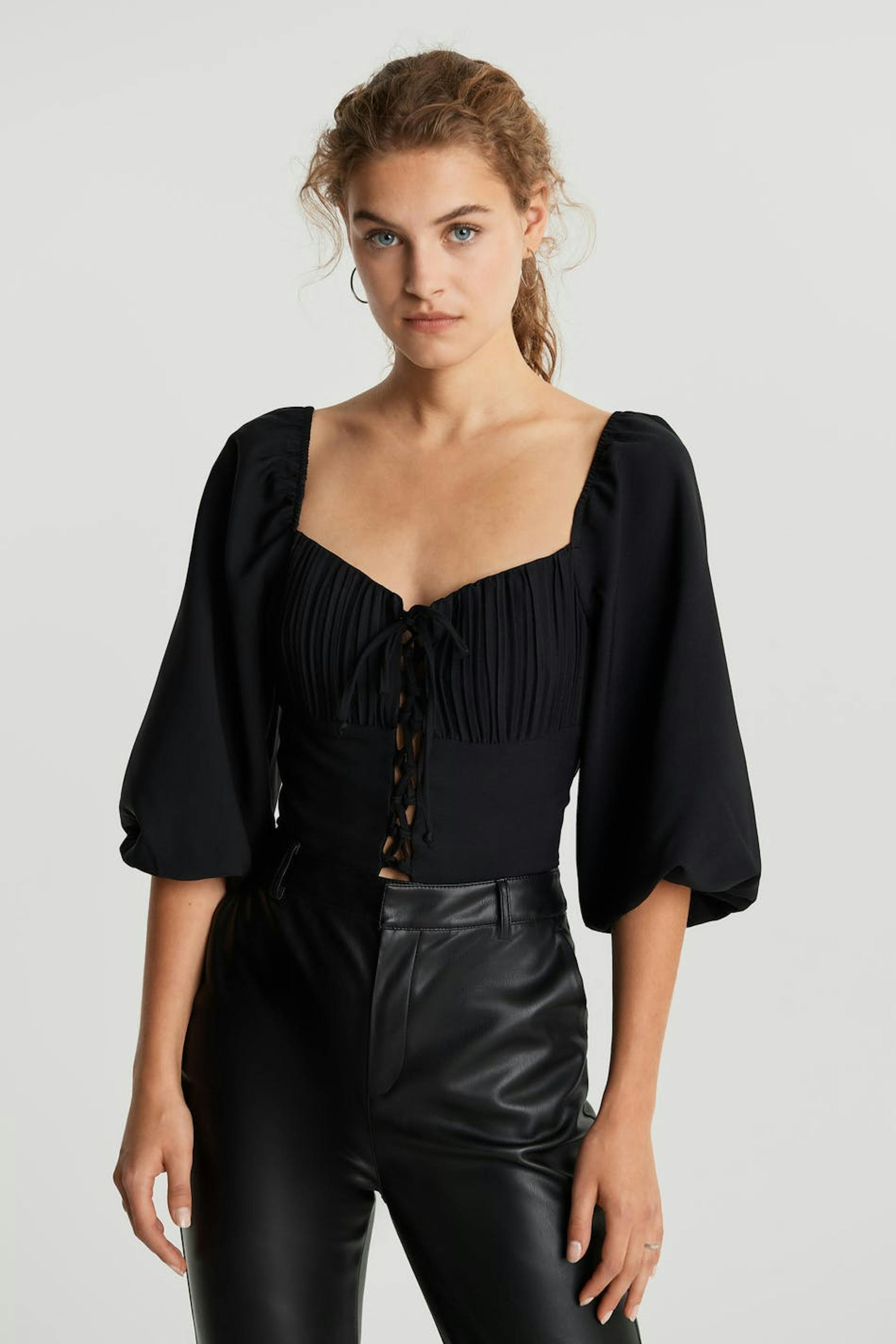 Kort crop top med en figurnära passform. Toppen är perfekt för festen och svart och har rynkning över bysten. Den har en knytdetalj i mitten och halvlånga ärmar.