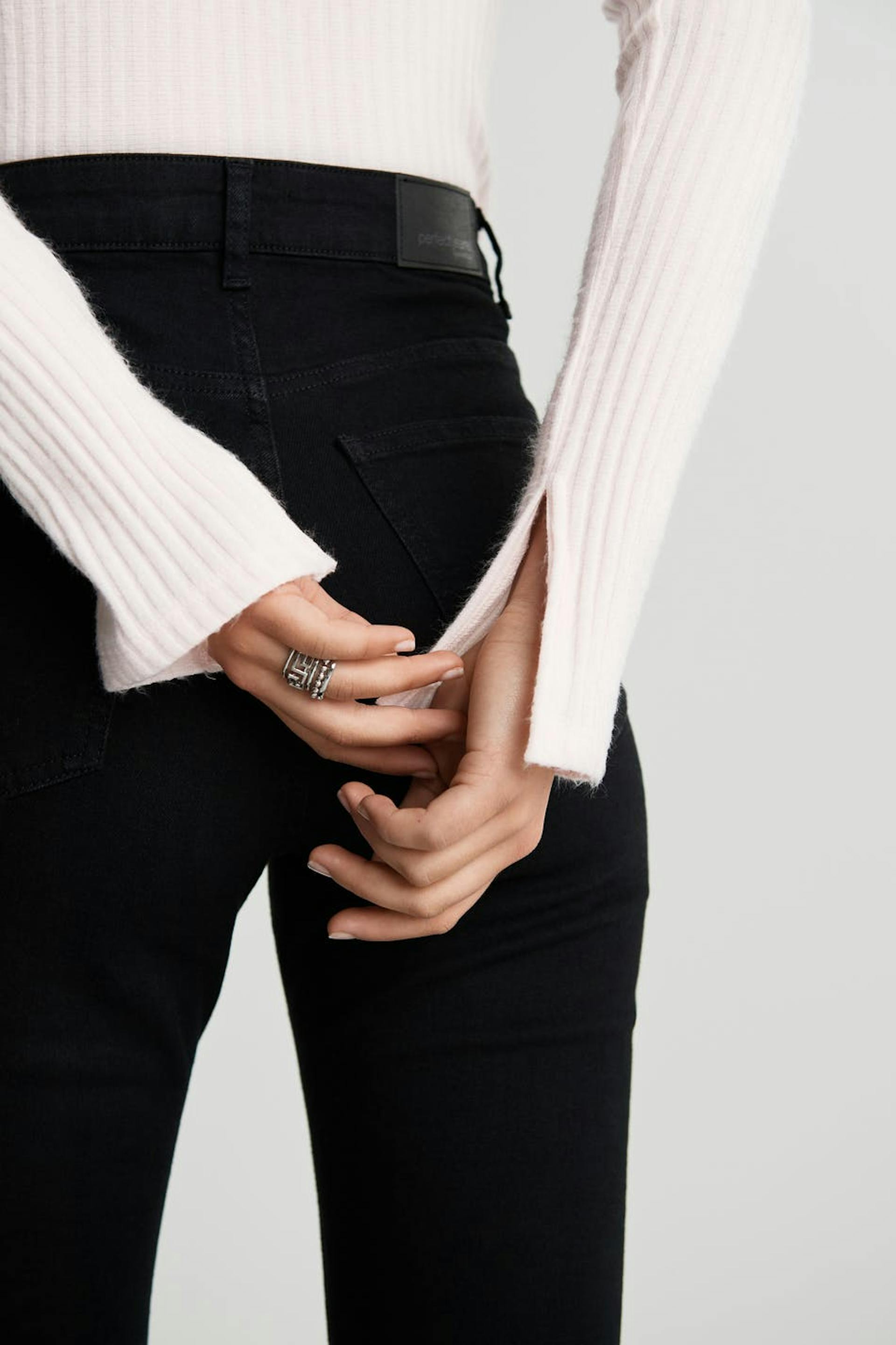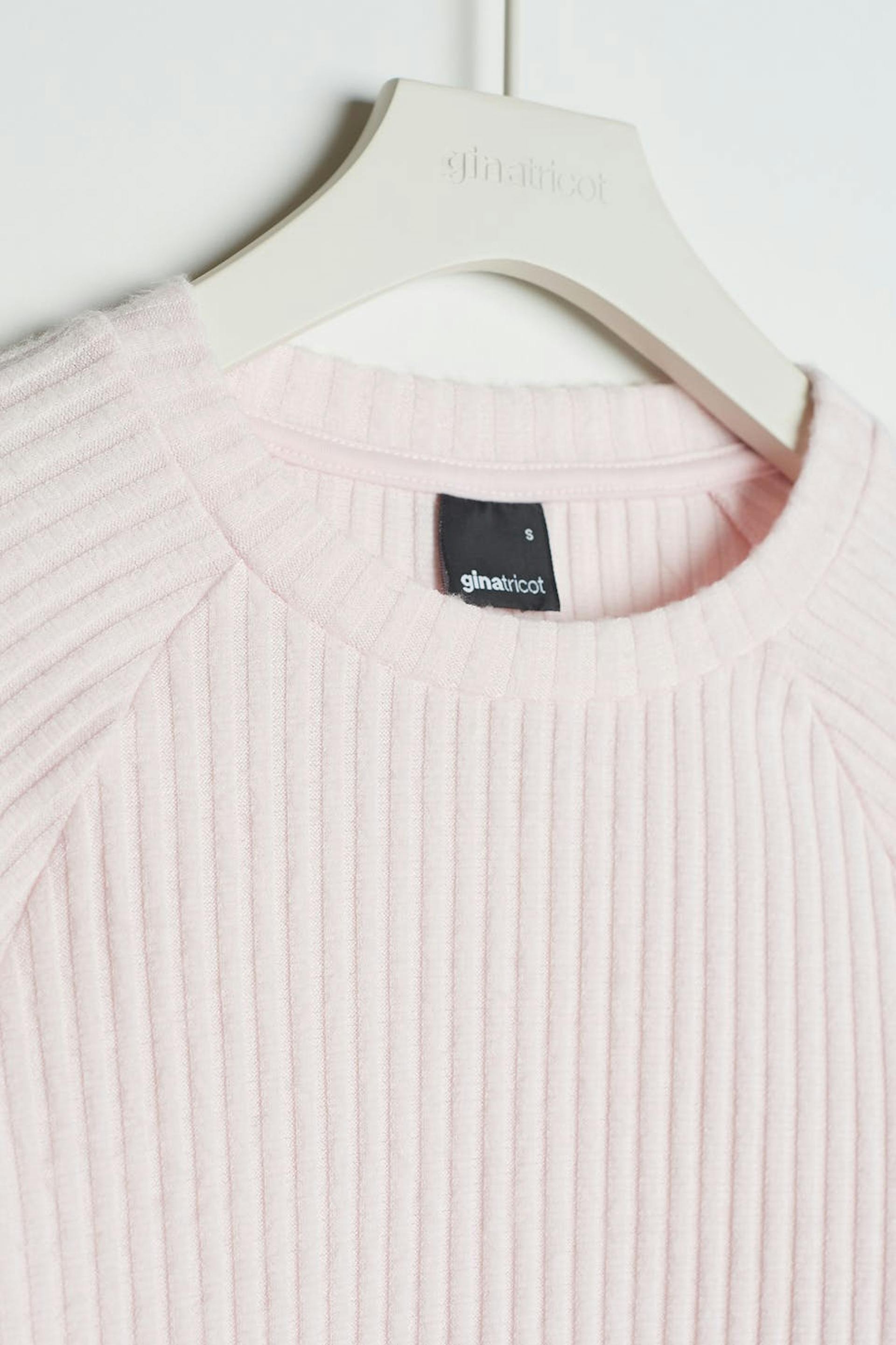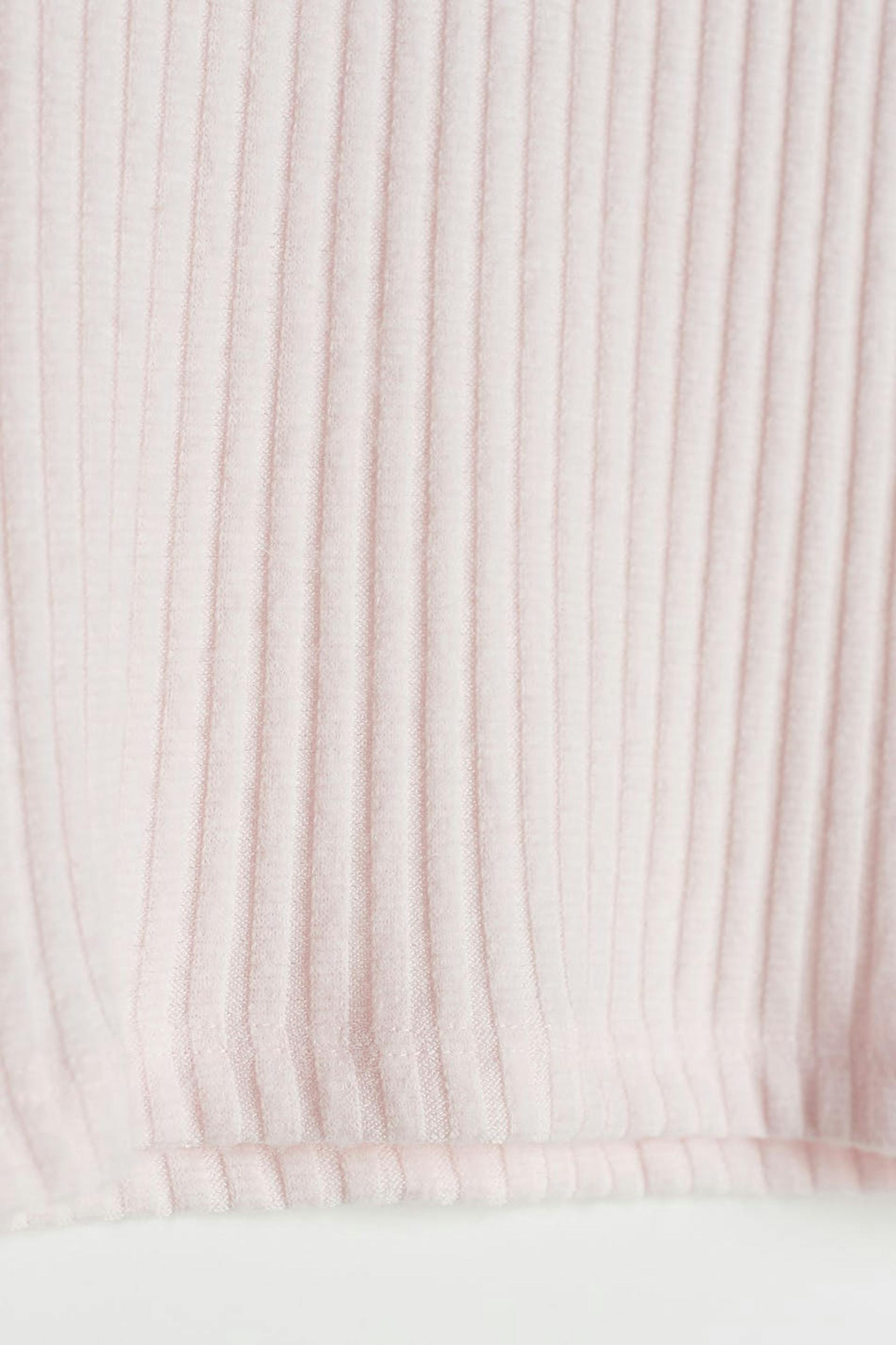Croppad topp med en normal passform. Toppen är ljusrosa och har långa, lätt utsvängda ärmar med en slits vid ärmsluten. Den har en ribbad, mjukborstad kvalitet.