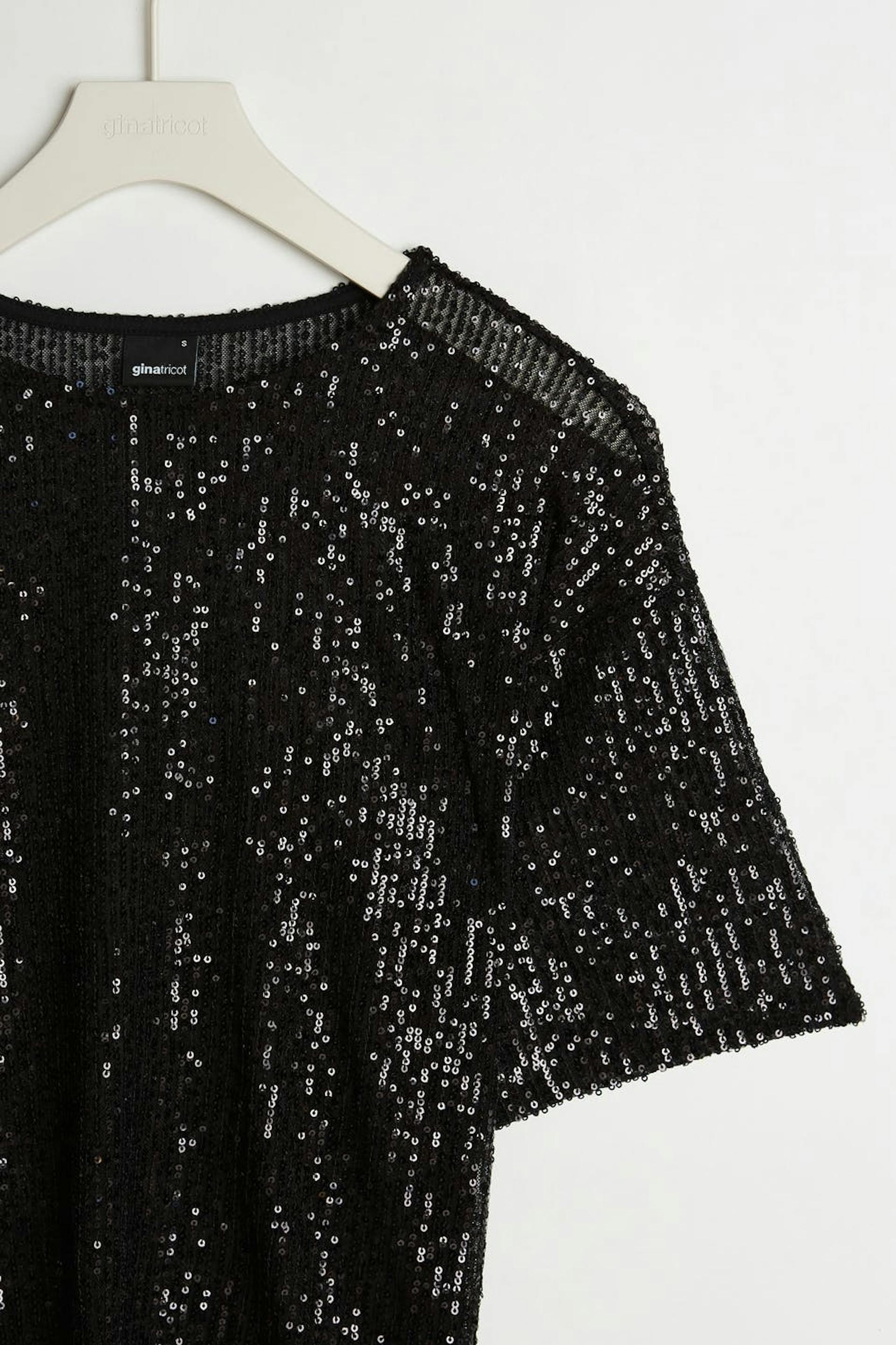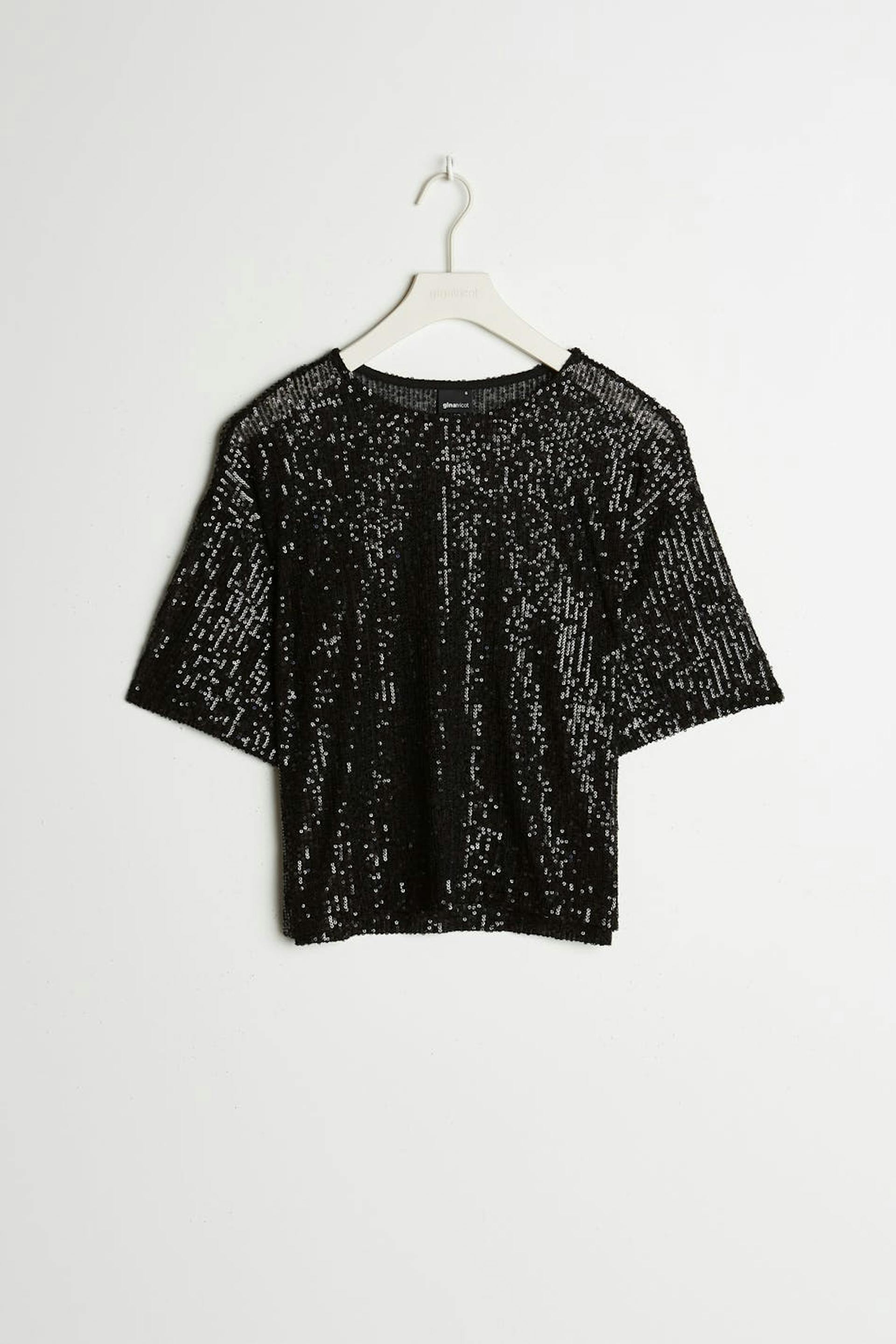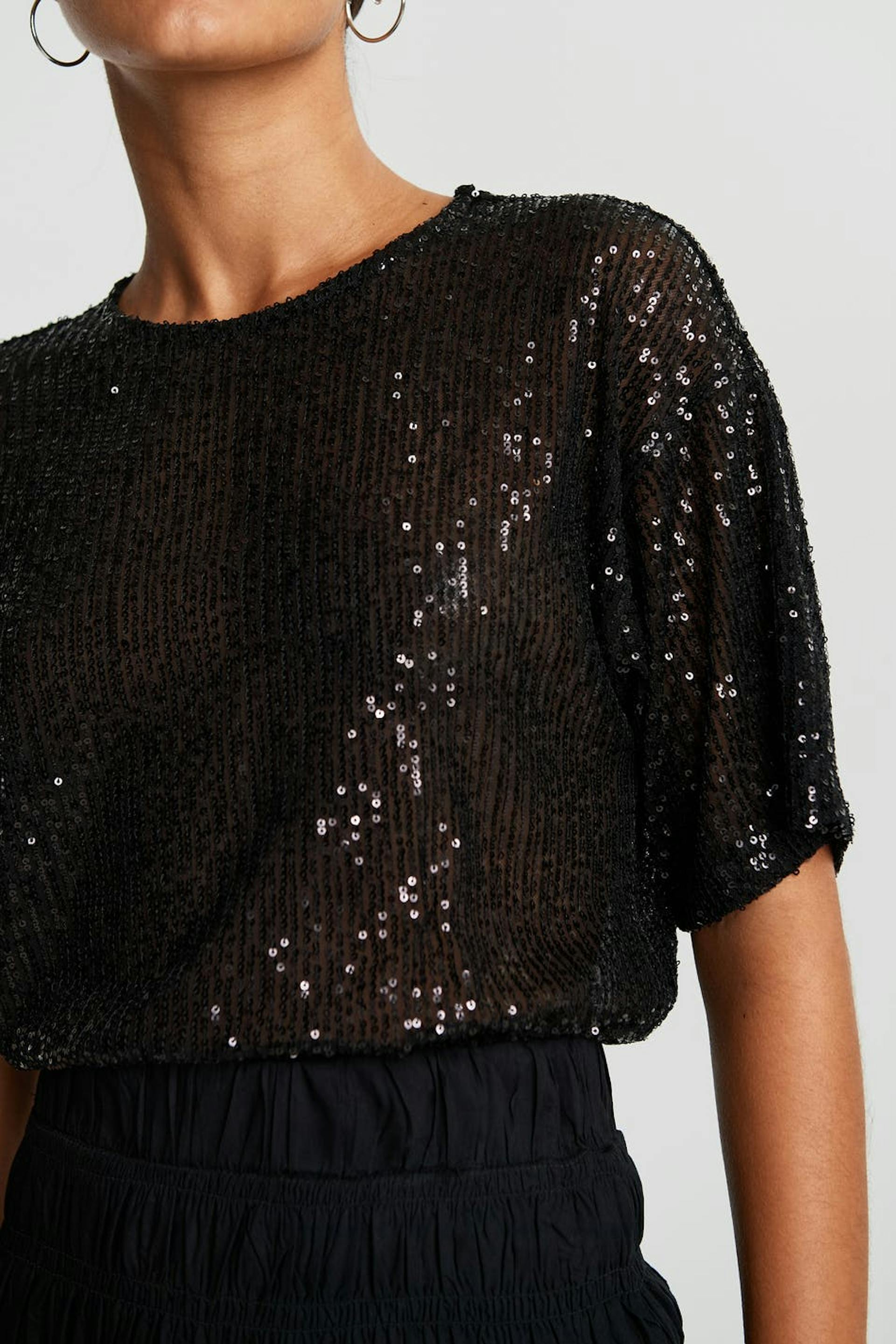 Kortärmad topp med generös passform. Toppen är svart och har paljetter över hela.