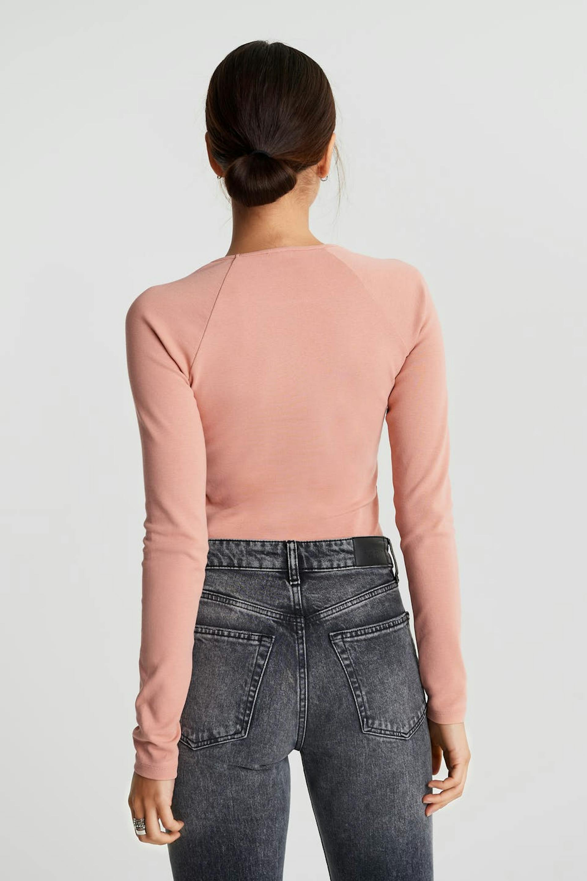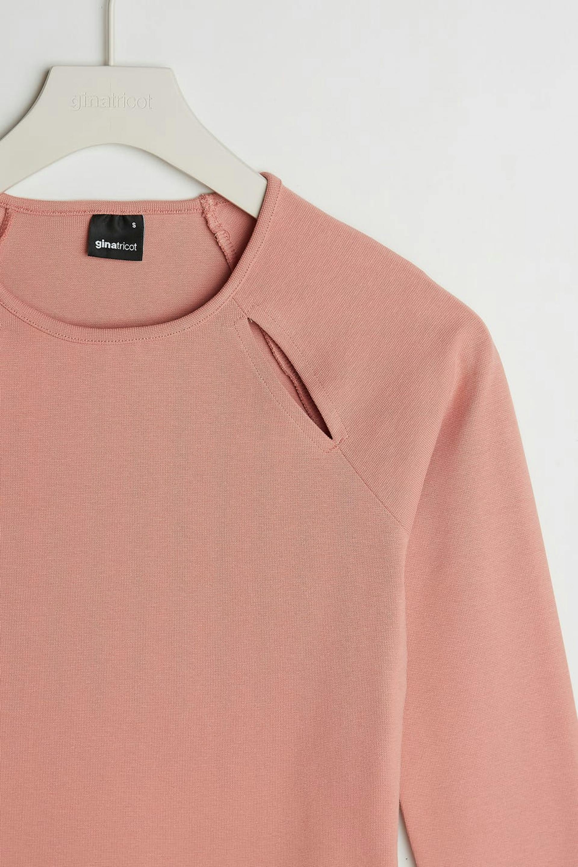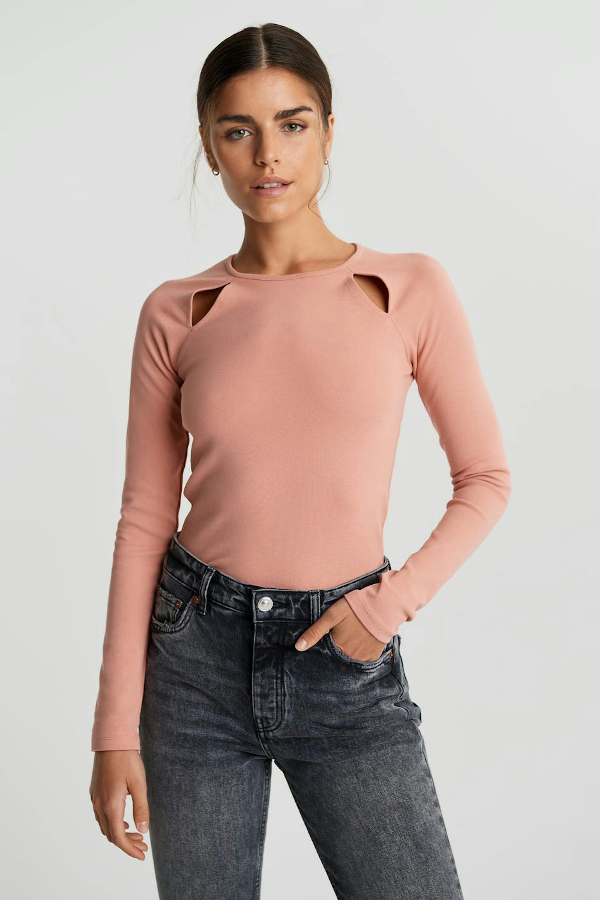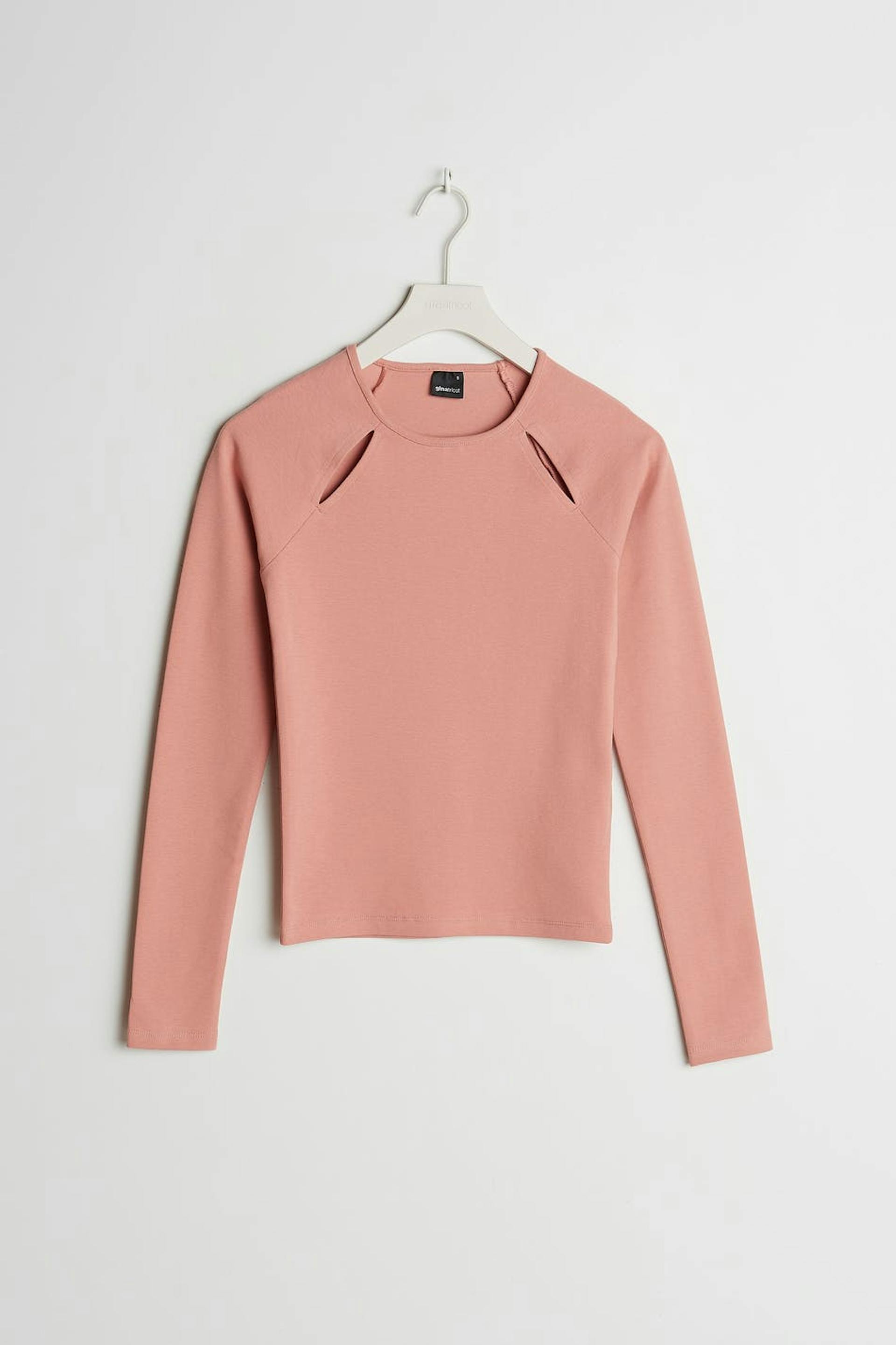 Långärmad topp med en figurnära passform. Toppen är rosa och har cutout detaljer på framsidan. Den är gjord av trikå.
