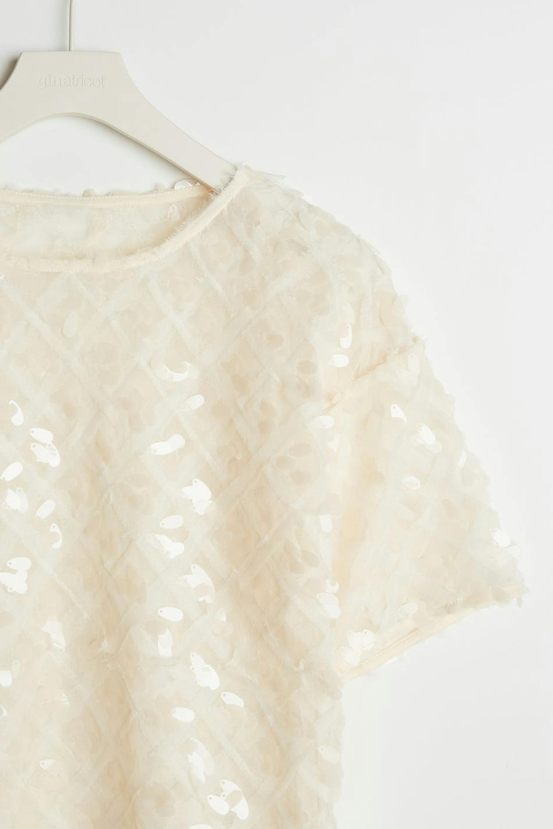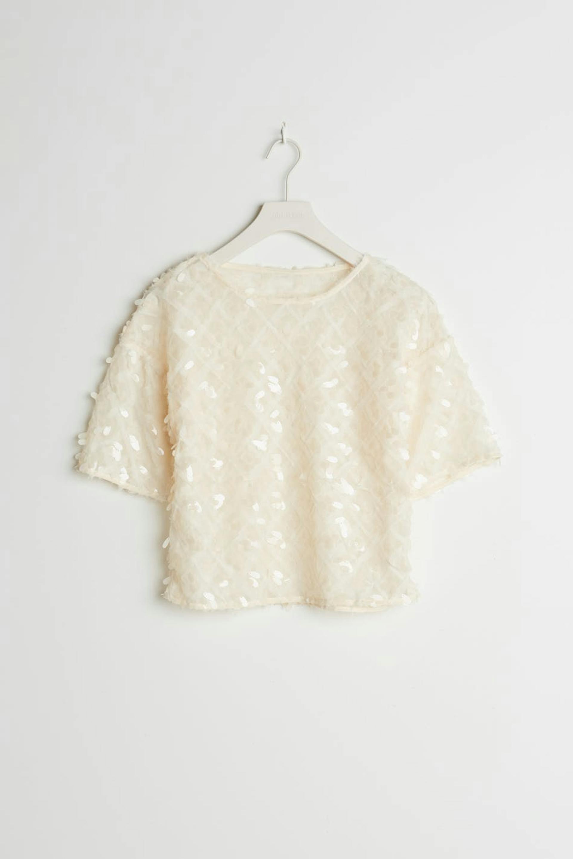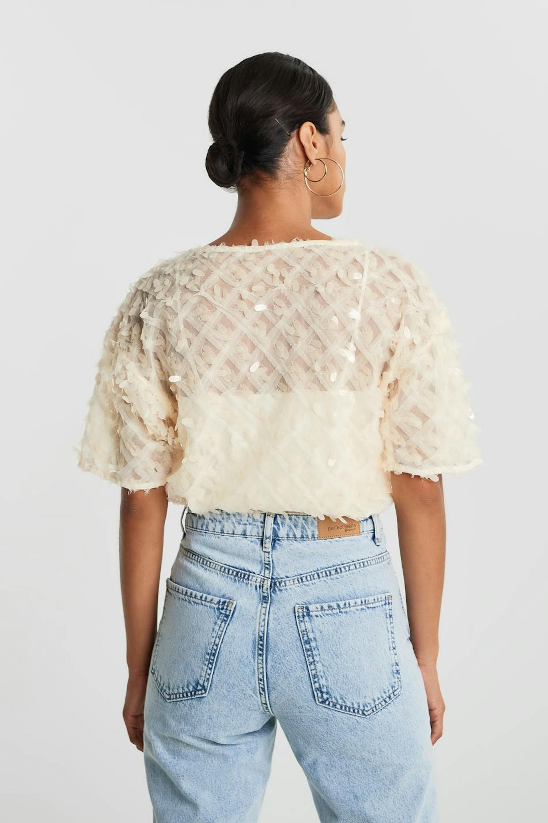 Kortärmad topp med en normal passform. Toppen är perfekt för festen och beige och har ett glittrigt rutmönster.