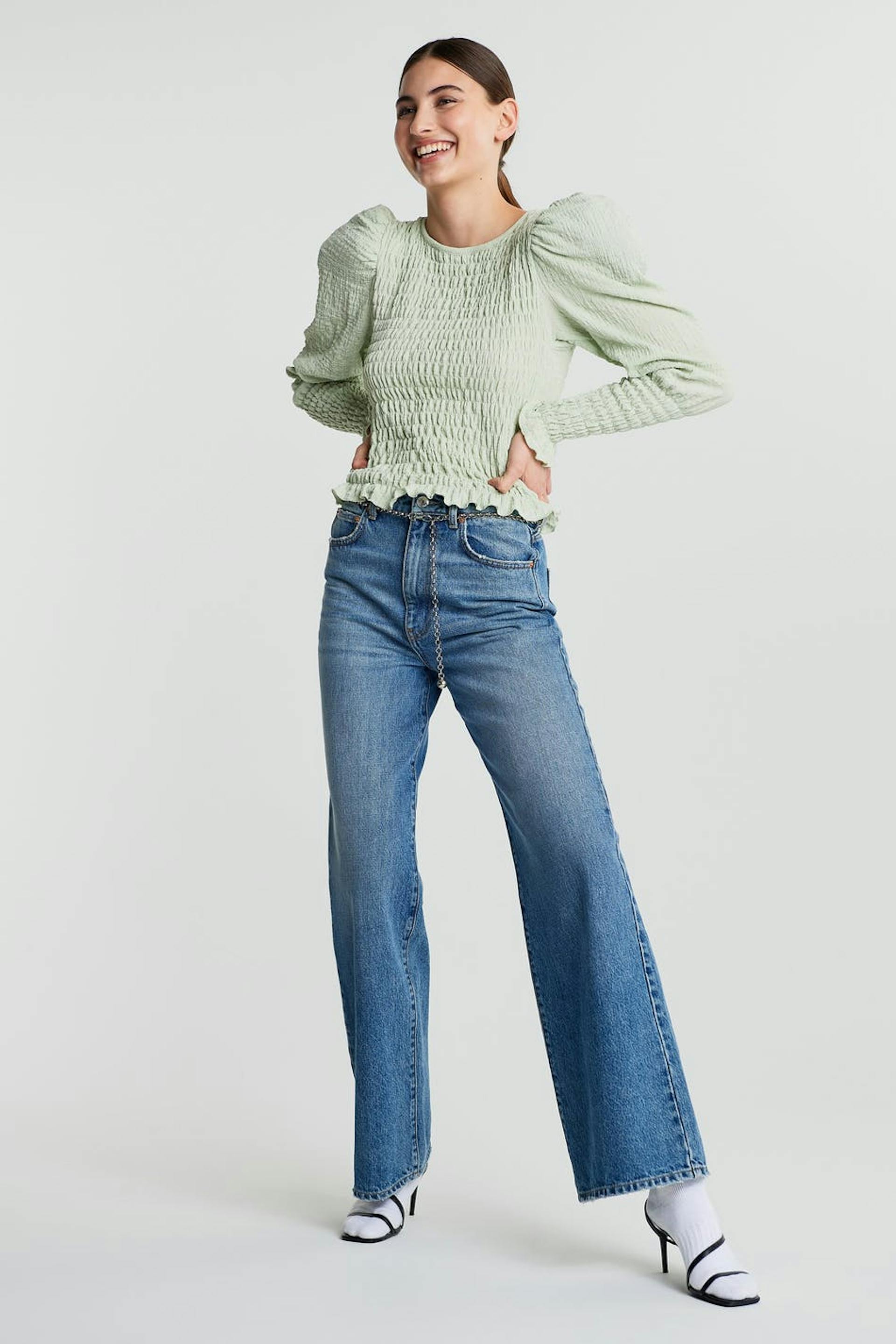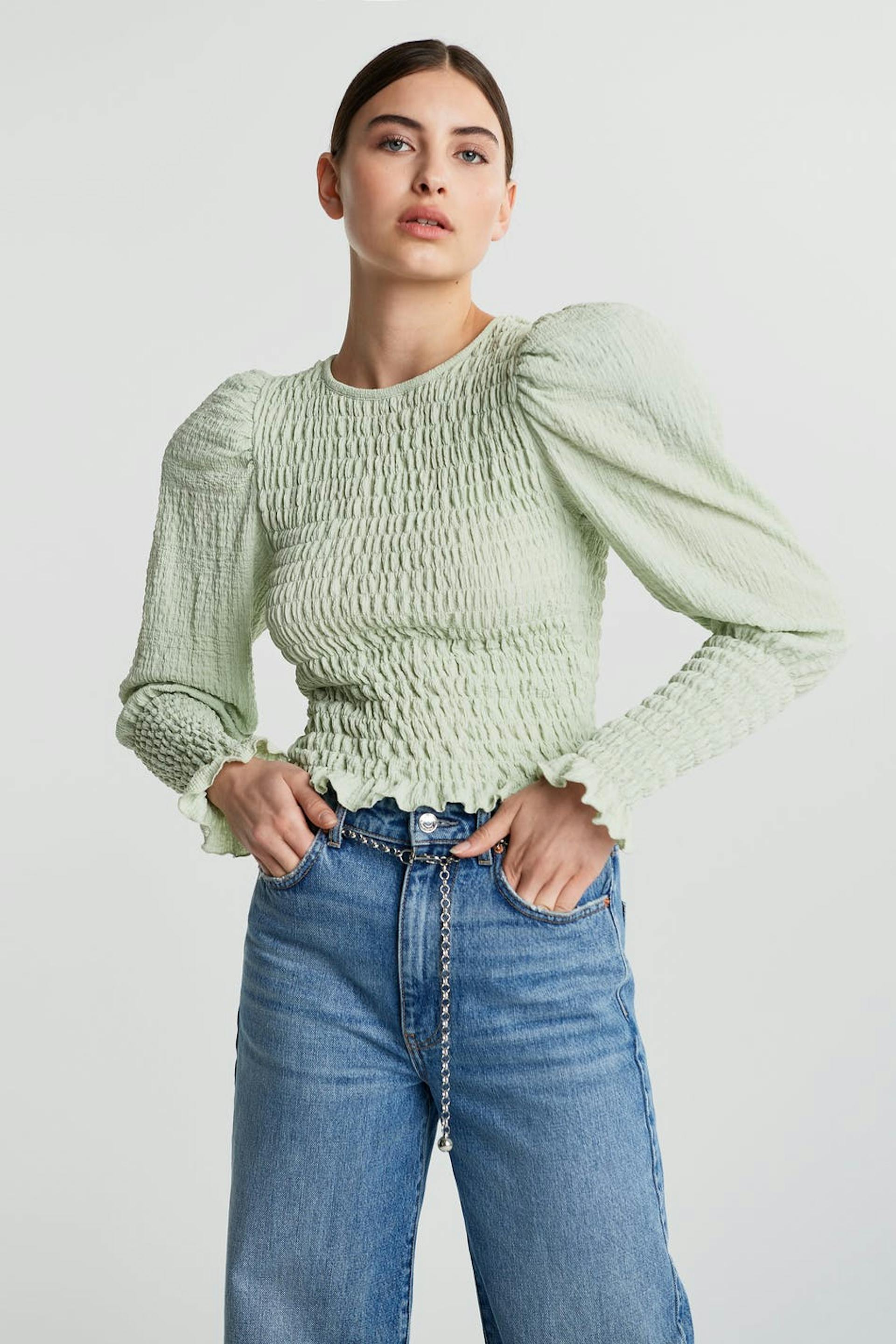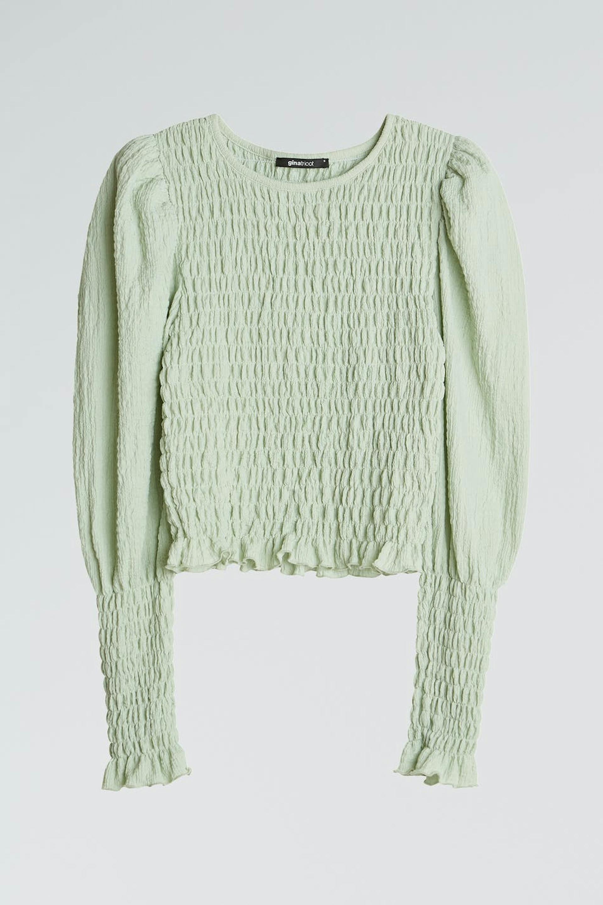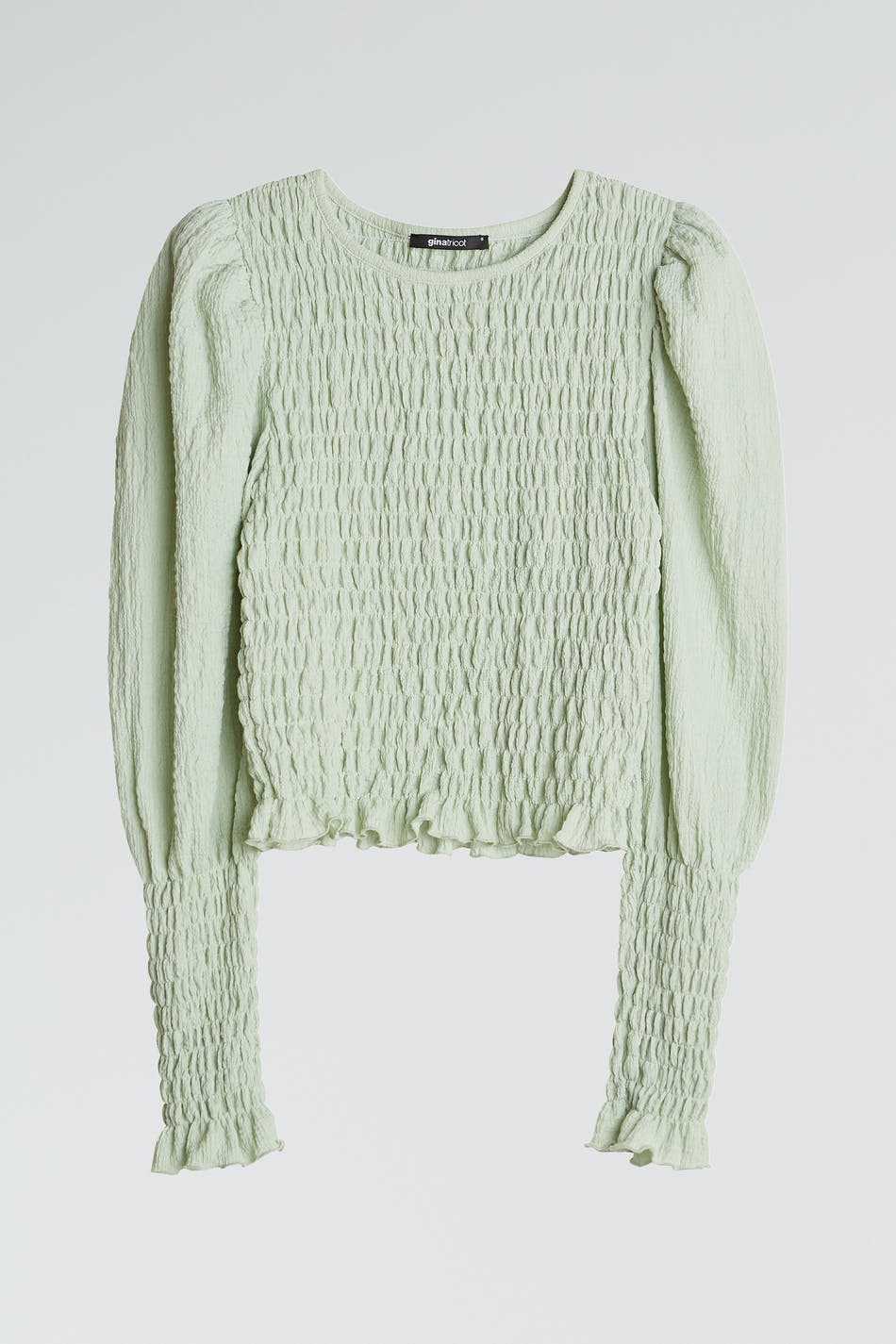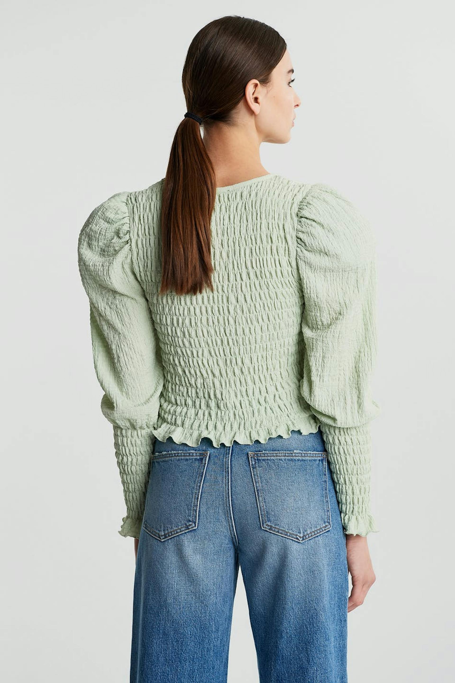 Smockad topp med en normal passform. Toppen är grön och har puffärmar.